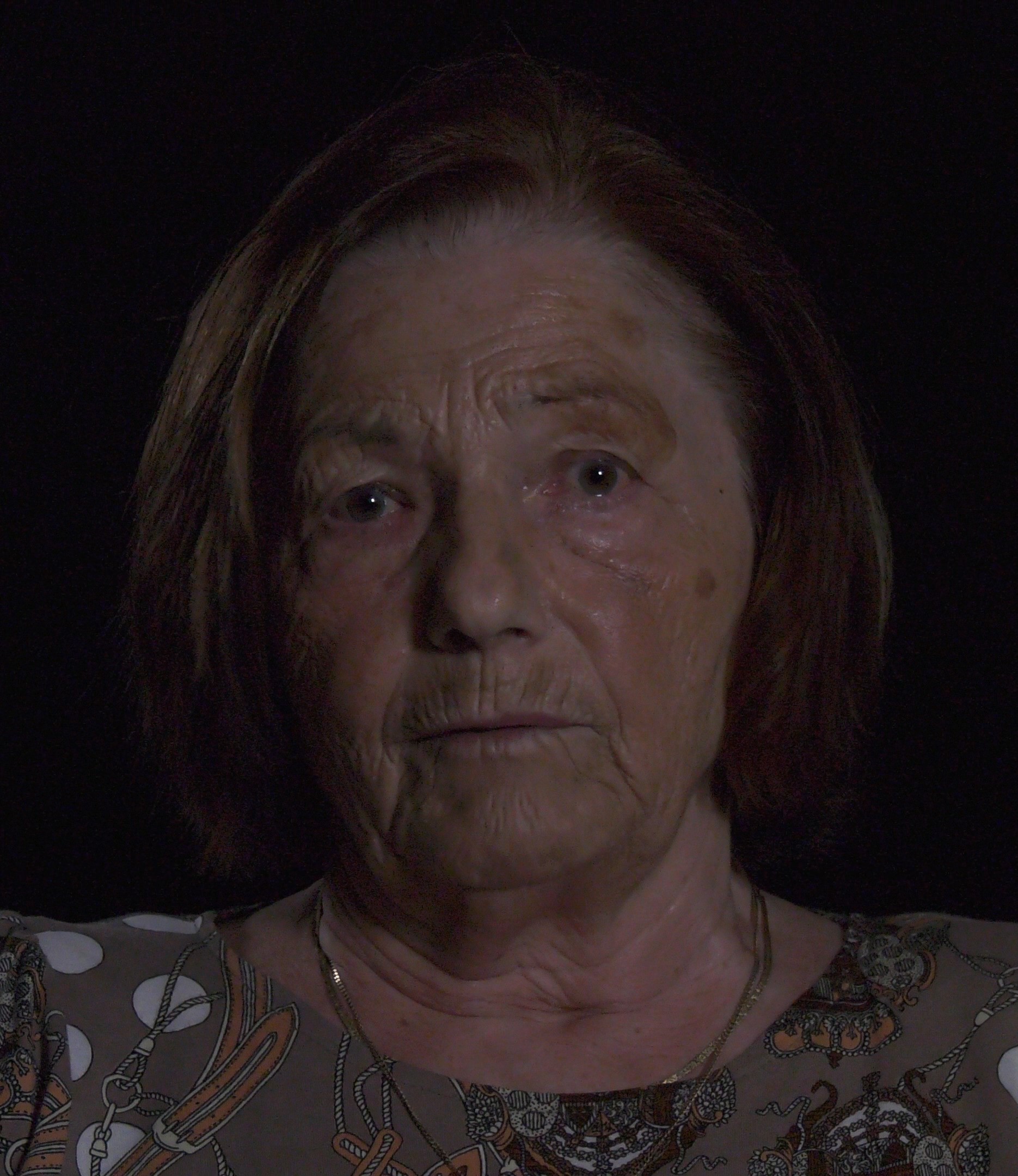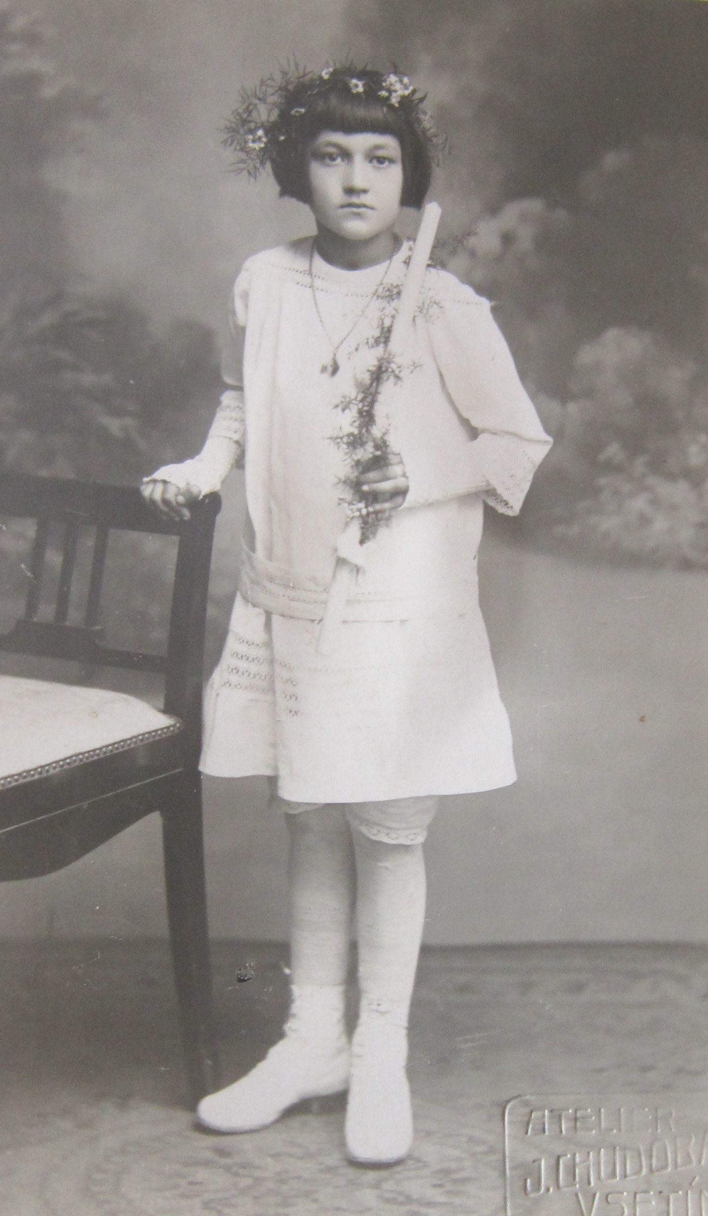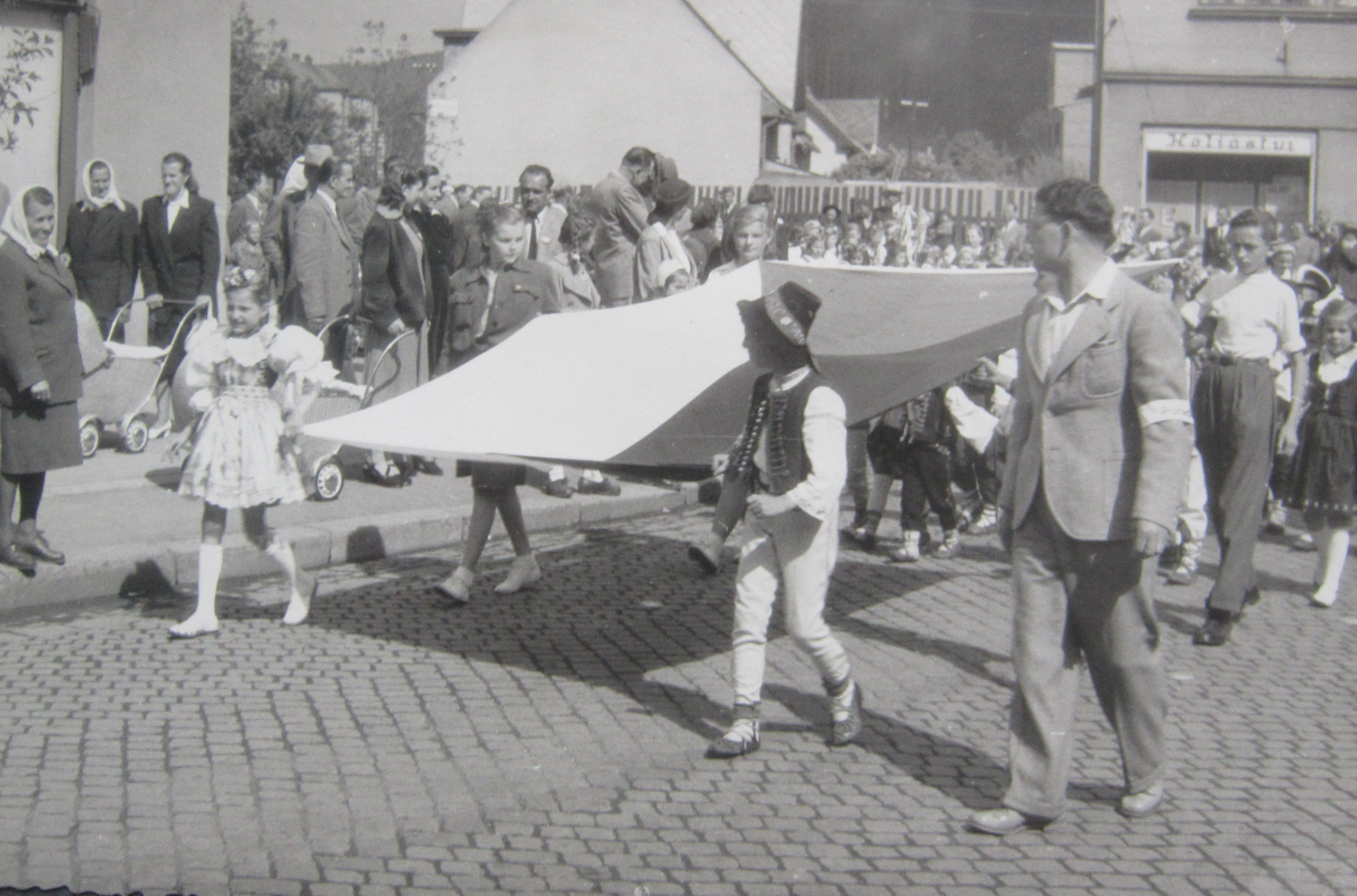 „Další vzpomínka, kterou jsem prožila a kterou i dnes vidím: Byl možná říjen, protože vím, že se už brzo stmívalo a bylo spadané listí. My jsme byli nahoře na Dušné a vždycky, když tam přišli ti strýci, jak jsme jim říkali, což byli páni v hubertusech, dlouhých kabátech a většinou měli ještě brašnu, tak jsme holt museli ven. Venku nás hlídala babička. Jak si s náma venku hrála, tak zjistila, že po táhlé dlouhé cestě, která vede k naší chalupě, se přibližuje jednotka schutzpolizei se psy a na kolech. Babička věděla, že je zle, tak jen hvízdla. Ti pánové, mám pocit, že byli tři nebo čtyři, vletěli do bunkru, který je tam ještě dodnes vykopaný v takovém ostrohu. Svrchu tam byla taková roura, kterou byl přiváděn vzduch. Neměl dveře, jen dekl. Vletěli tam a babička za nimi dekl zaklapla. Schutzpolizei a Němci s přesností sobě vlastní si na ten dekl naskládali kola. Psi se mohli zbláznit, jenomže venku už byla teta, pan Škrabal, paní Škrabalová, babička, prostě spousta lidí. Ptali se, jestli jsme někoho neviděli. Pochopitelně jsme nikoho neviděli. Tak oni kola nechali u nás a rozběhli se po okolí. Všechno se psy prohledali a večer se vrátili zpět. Vzpomínám si ještě dnes, jak mi bylo nanic, když mě ten jeden Němec vzal do náruče a říkal mně, že má taky takovou holčičku. Říkal to německy a babička to překládala. Vytáhl pak z kapsy krabičku čokolády. Tehdy jsem poprvé v životě viděla čokoládu. Vzali si pak kola a odjeli. Mohli jsme být všichni na místě mrtví.“