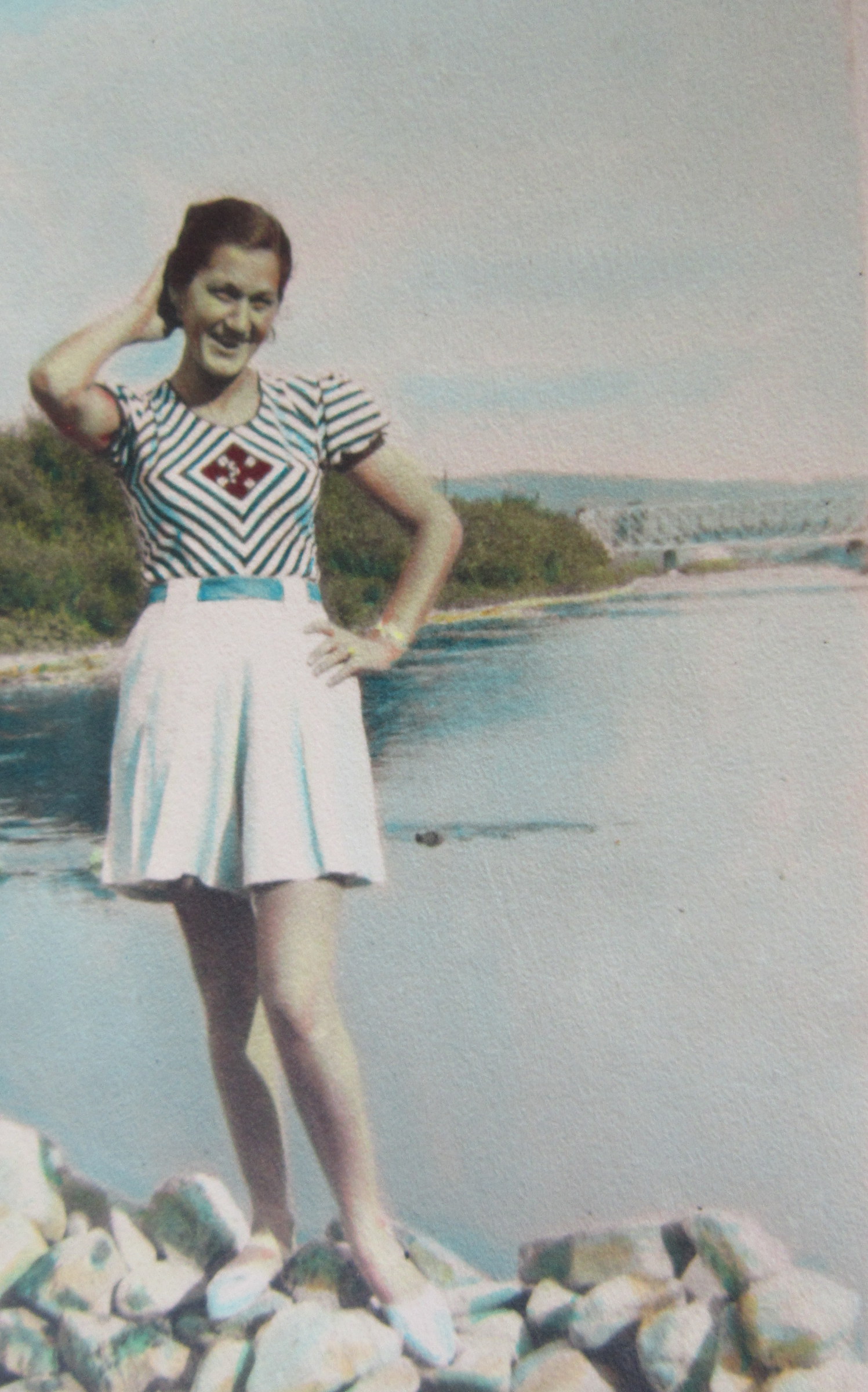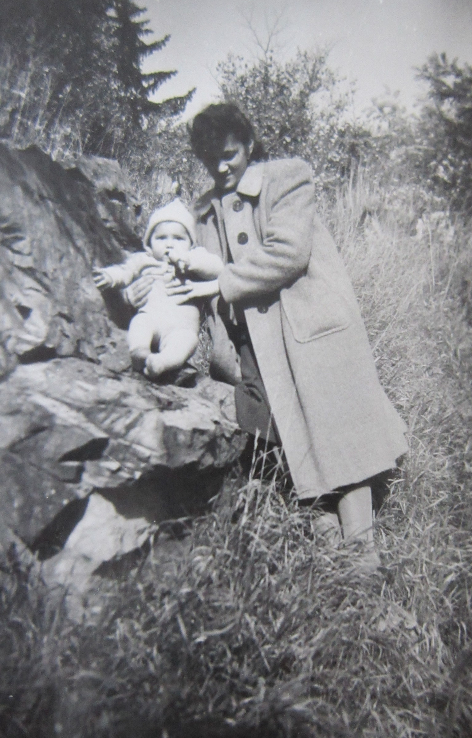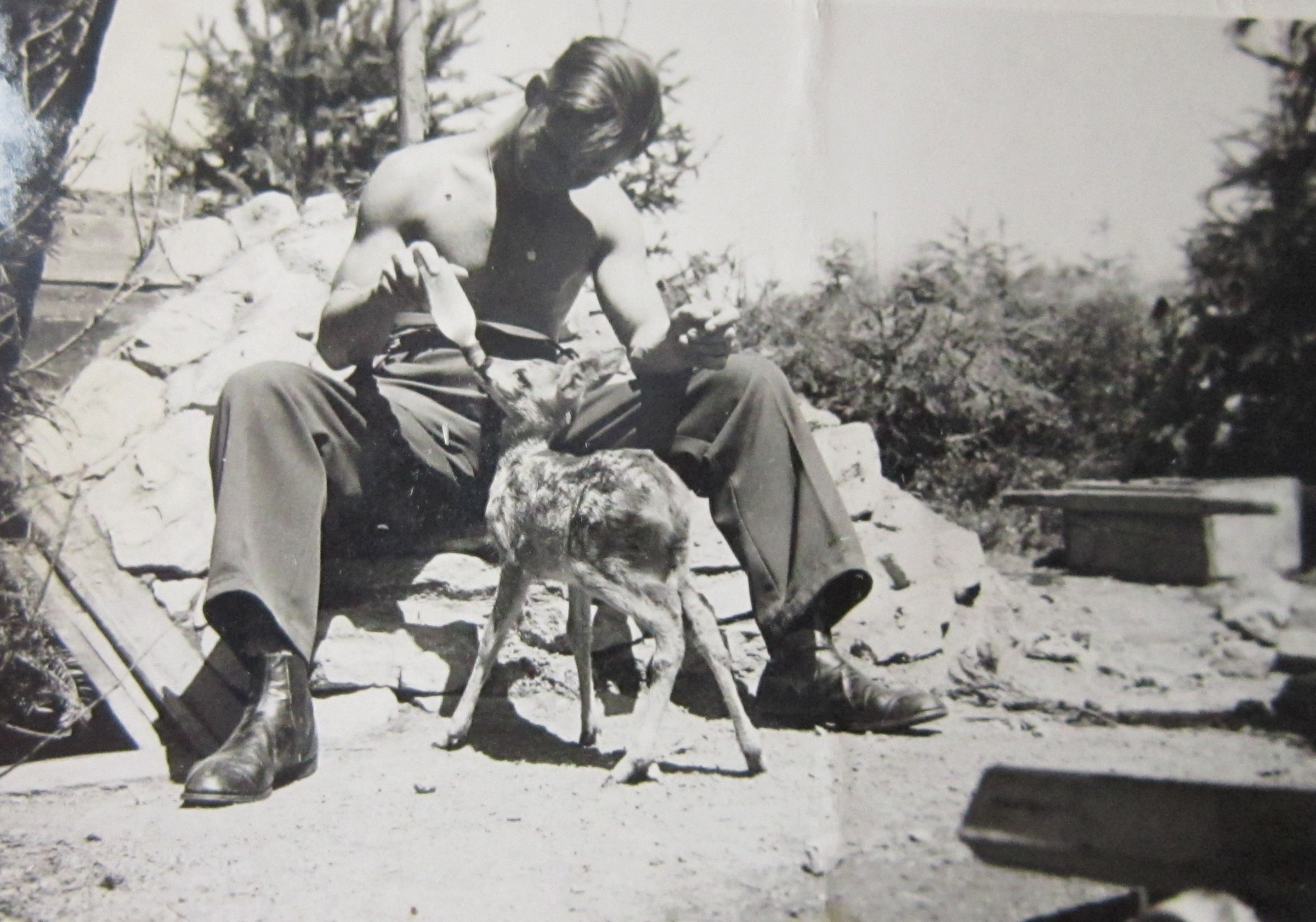 „Další vzpomínka, kterou jsem prožila a kterou i dnes vidím: Byl možná říjen, protože vím, že se už brzo stmívalo a bylo spadané listí. My jsme byli nahoře na Dušné a vždycky, když tam přišli ti strýci, jak jsme jim říkali, což byli páni v hubertusech, dlouhých kabátech a většinou měli ještě brašnu, tak jsme holt museli ven. Venku nás hlídala babička. Jak si s náma venku hrála, tak zjistila, že po táhlé dlouhé cestě, která vede k naší chalupě, se přibližuje jednotka schutzpolizei se psy a na kolech. Babička věděla, že je zle, tak jen hvízdla. Ti pánové, mám pocit, že byli tři nebo čtyři, vletěli do bunkru, který je tam ještě dodnes vykopaný v takovém ostrohu. Svrchu tam byla taková roura, kterou byl přiváděn vzduch. Neměl dveře, jen dekl. Vletěli tam a babička za nimi dekl zaklapla. Schutzpolizei a Němci s přesností sobě vlastní si na ten dekl naskládali kola. Psi se mohli zbláznit, jenomže venku už byla teta, pan Škrabal, paní Škrabalová, babička, prostě spousta lidí. Ptali se, jestli jsme někoho neviděli. Pochopitelně jsme nikoho neviděli. Tak oni kola nechali u nás a rozběhli se po okolí. Všechno se psy prohledali a večer se vrátili zpět. Vzpomínám si ještě dnes, jak mi bylo nanic, když mě ten jeden Němec vzal do náruče a říkal mně, že má taky takovou holčičku. Říkal to německy a babička to překládala. Vytáhl pak z kapsy krabičku čokolády. Tehdy jsem poprvé v životě viděla čokoládu. Vzali si pak kola a odjeli. Mohli jsme být všichni na místě mrtví.“