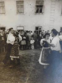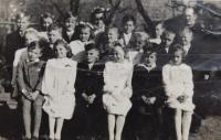 „Uplynuly tři dny a tři noci a vlak dojel na nádraží do Třebíče. Na nádraží už stálo plno koňských potahů i traktorů. Sedláci tam stáli v řadě, jak kdyby čekali na uhlí, ale čekali na nás. Byla to dlouhá řada vagonů a oni chodili od jednoho k druhému. My jsme museli otevřít dveře a stoupnout si na okraj vagonu jako Židé, když jeli do Osvětimi. Dívali se na nás a hodnotili, jestli jsou ve vagonech rodiny schopné práce. My jsme byly čtyři děti, matka měla tříměsíční dítě v náručí, takže kolem nás chodili a nikdo nás nechtěl. Dopadlo to tak, že všechny vybrali a odvezli na statky na práci a my jsme tam jediní zůstali stát. Nikdo nás nechtěl.“