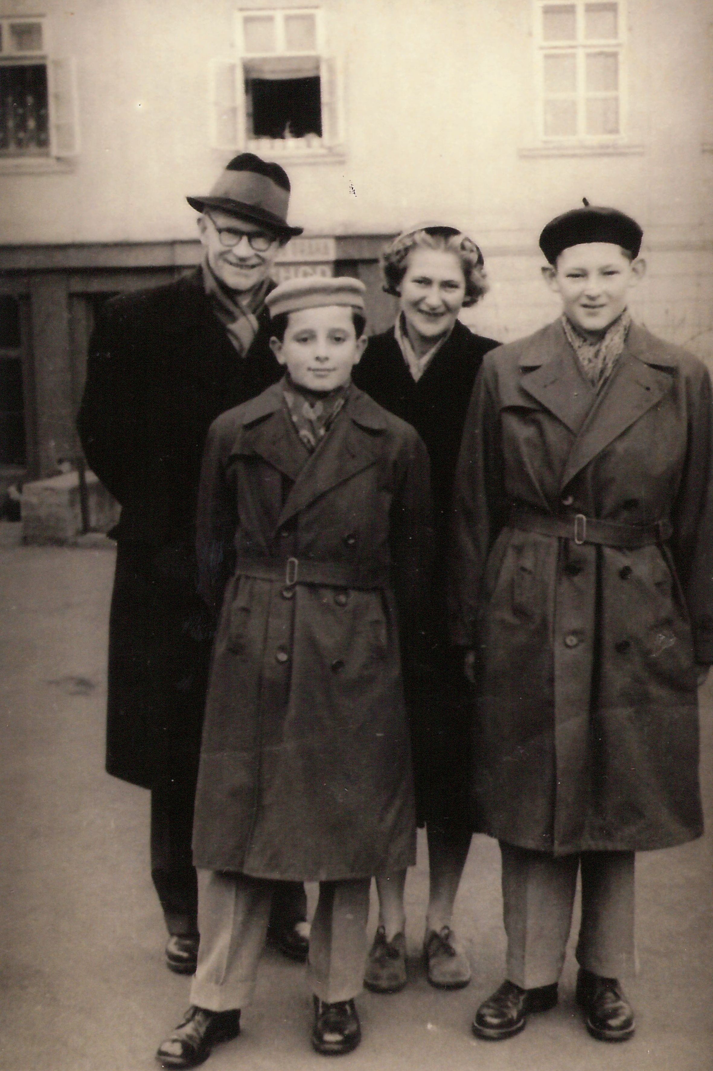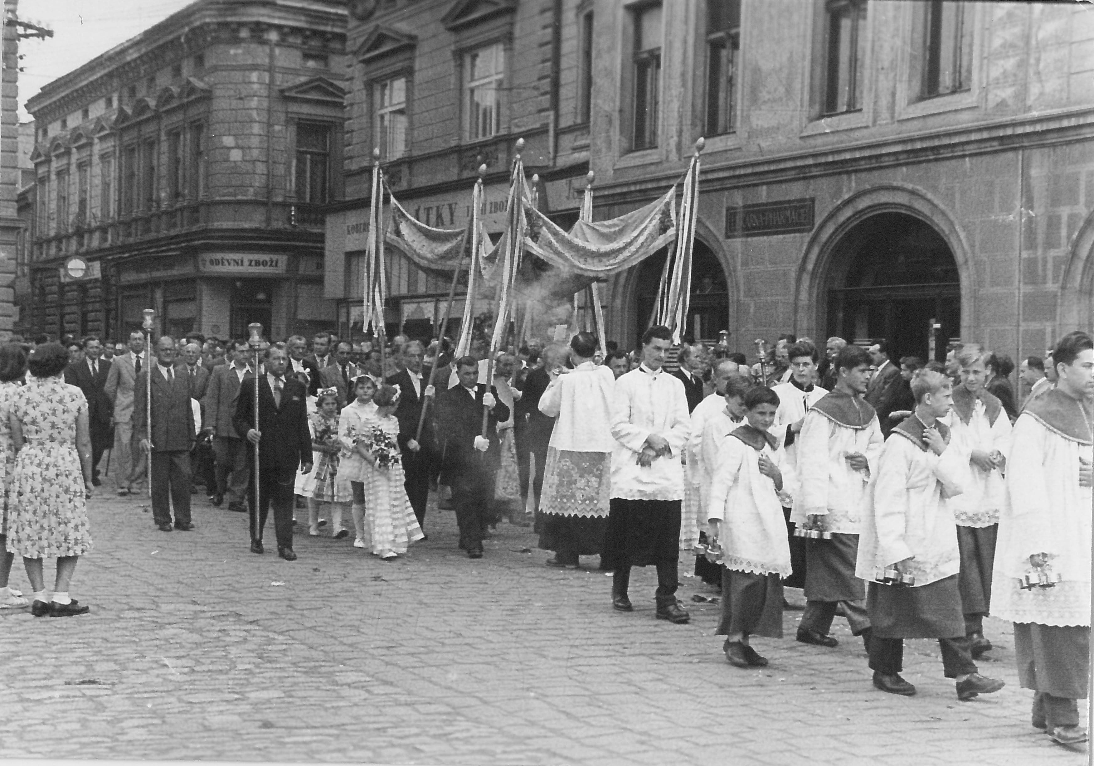Průvod Božího těla v Hradišti v polovině 50. let, zleva: nejvyšší primář Petr Hrobař, Jan Gogola, po levici ředitel gymnázia František Minařík, vpředu František Konvalinka, vedle něj doc. Ludvík Prášil a kostelník Ladislav Kaška