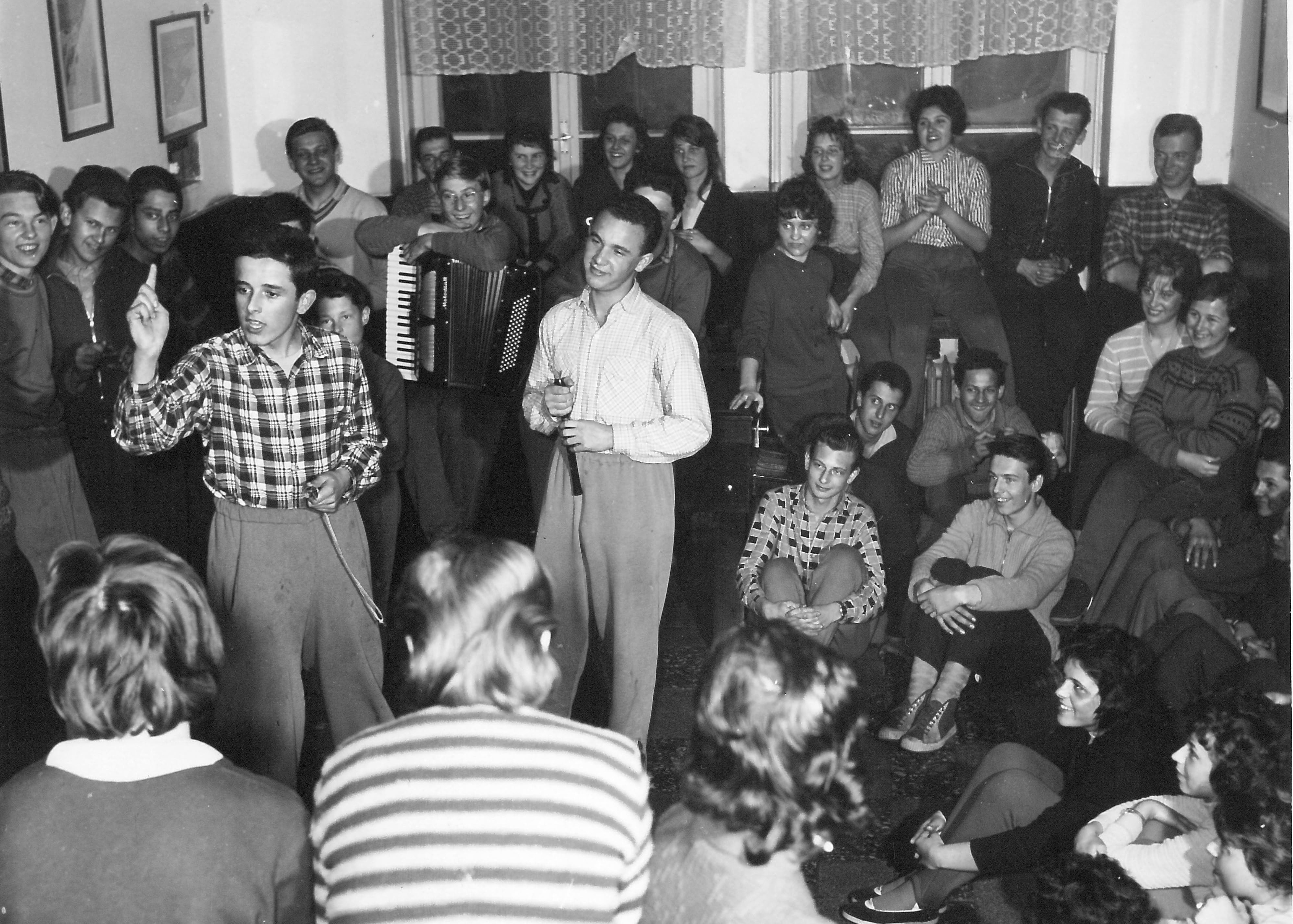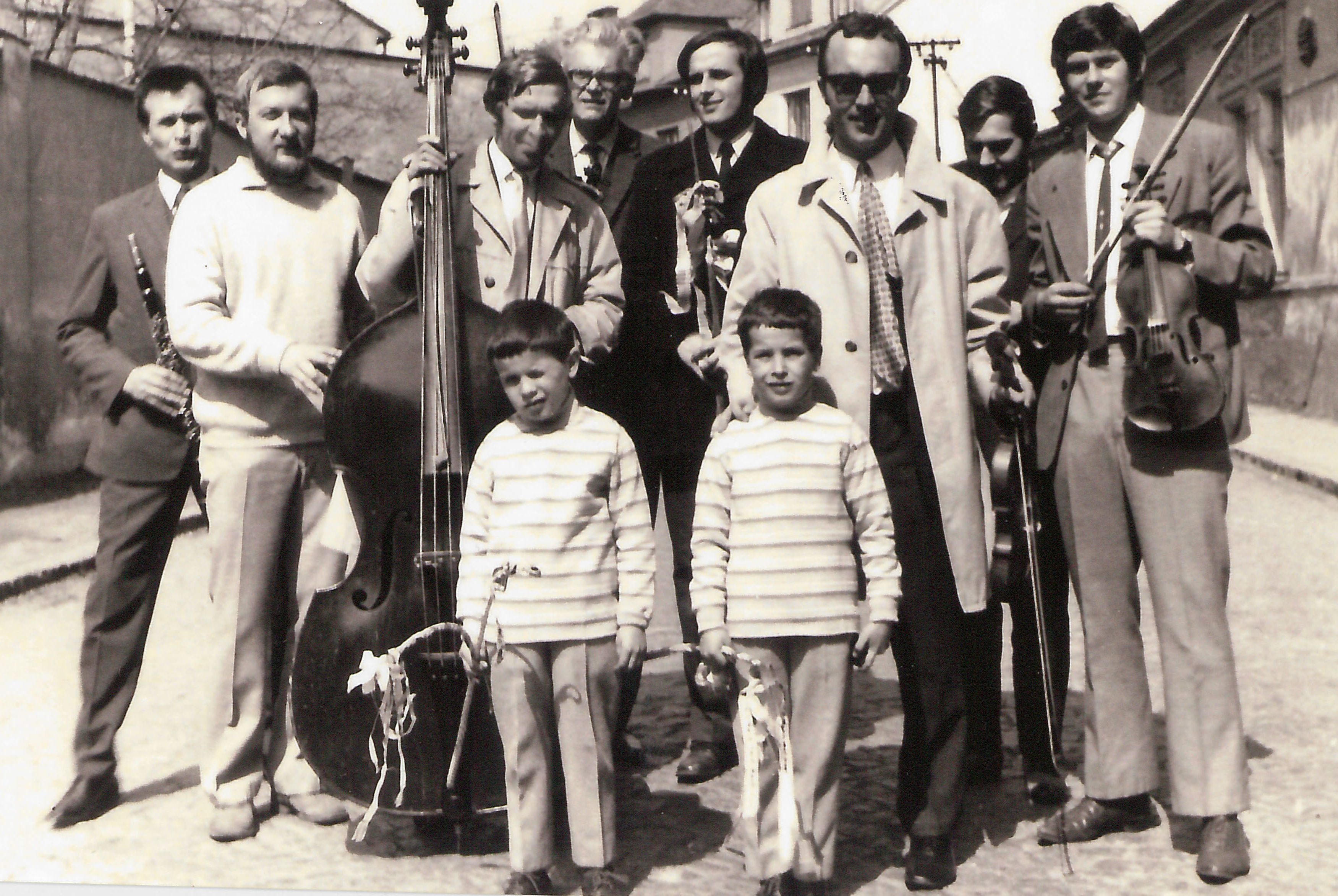 Velikonoce, chodili jsme šlahat s hudeckou muzikou, zleva: Jiří Charuza, Ivan Blaha, u basy Jiří Masařík, za ním notář František Vyhlíd, po jeho levici Jan Gogola, vpředu dvojčata Charuzovi, Pavel Marek, za ním Jan Maděrič, vpravo primáš Josef Kučera, patrně v letech 68-70.