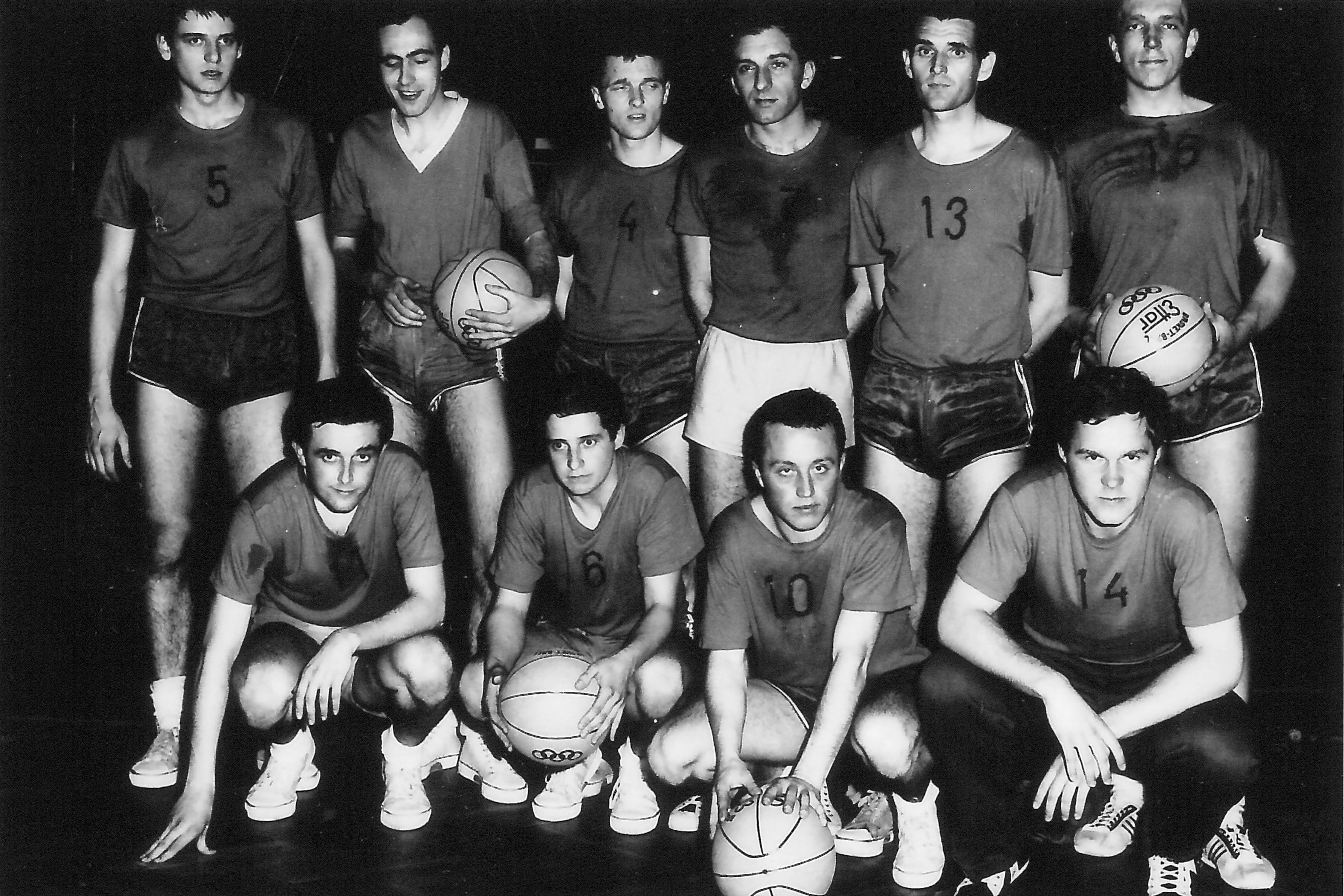 Basketbalové mužstvo Spartaku Uherské Hradiště, za přesnost byla jeho ruka poctěna názvem „golden hand“, polovina 60. let (Jan Gogola ve spodní řadě vlevo)