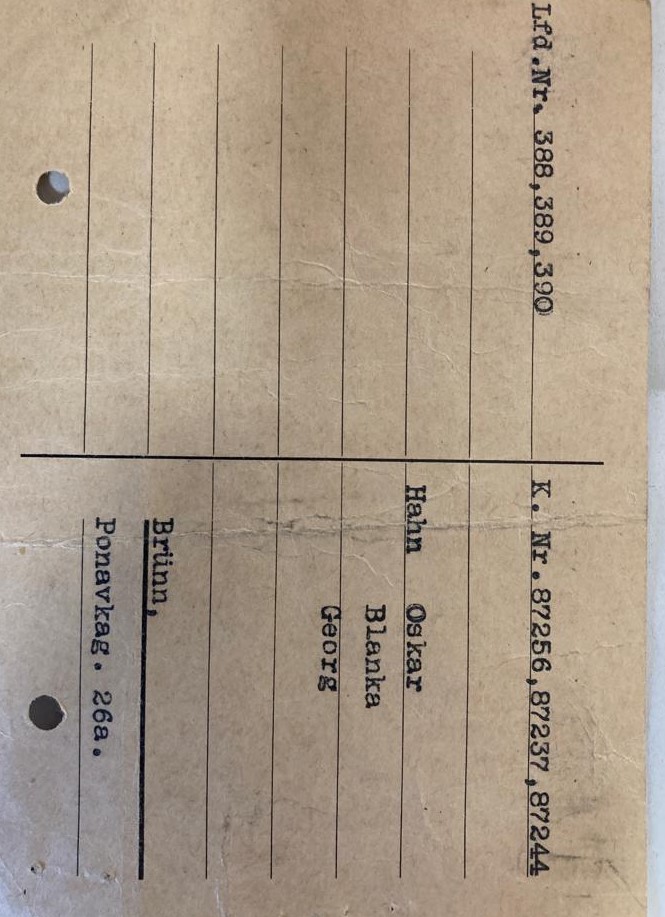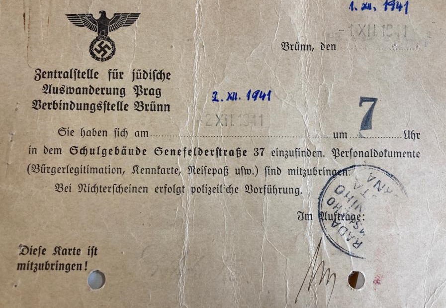 [1] Umístěnka k dočasnému ubytování v ulici Ponávka v Brně před transportem do Terezína 1941. Dokument dostupný v Dodatečných materiálech.