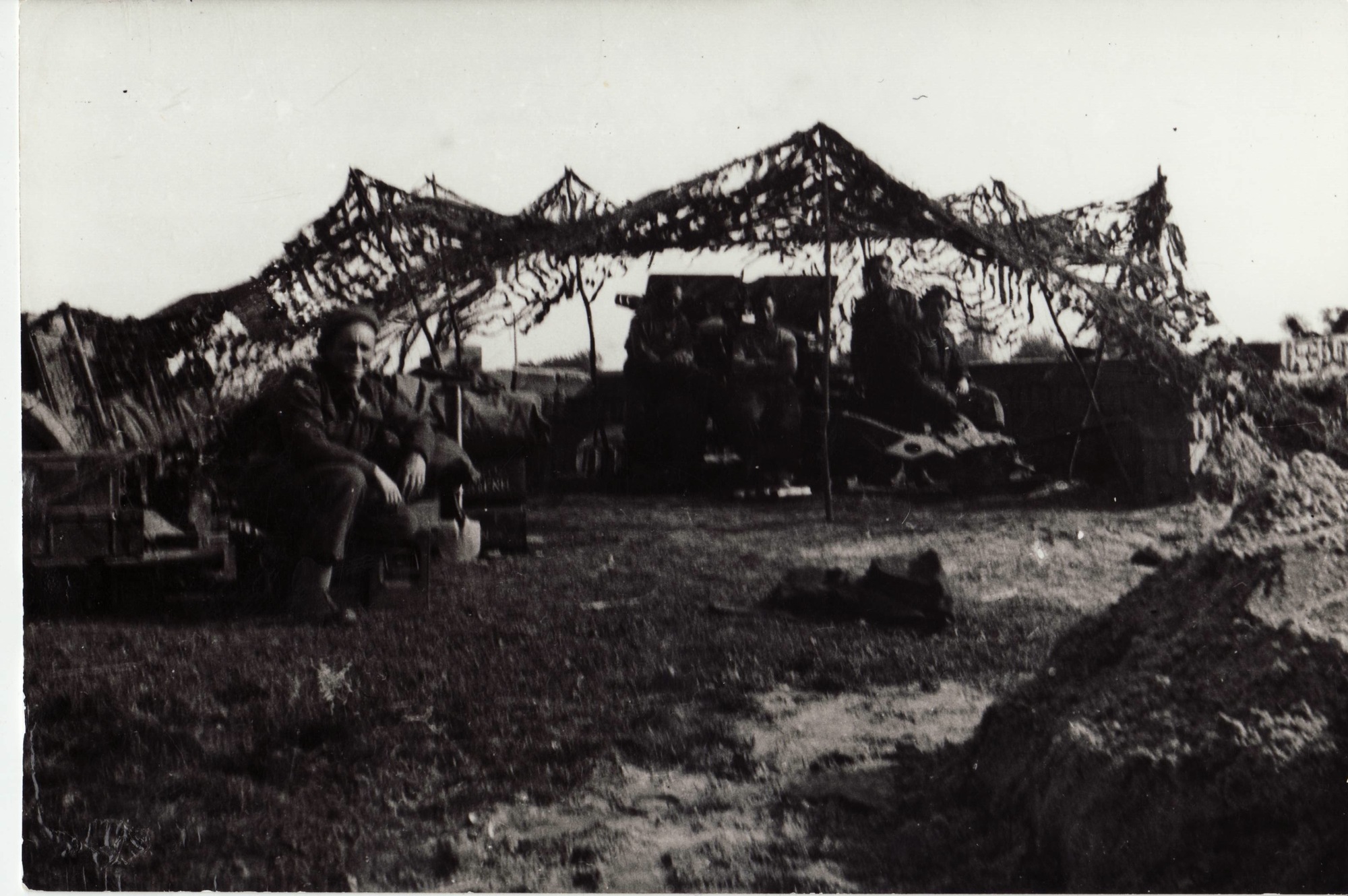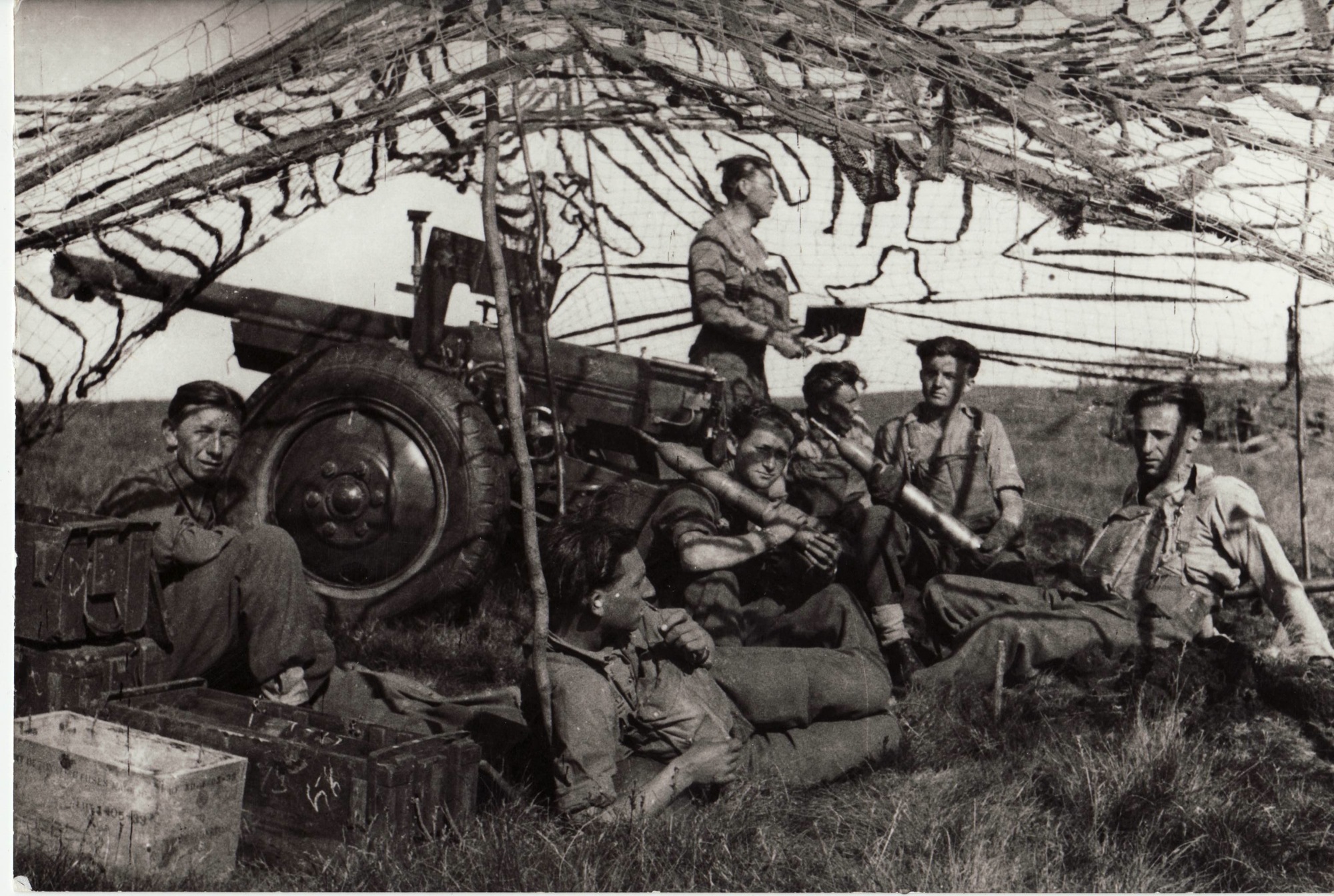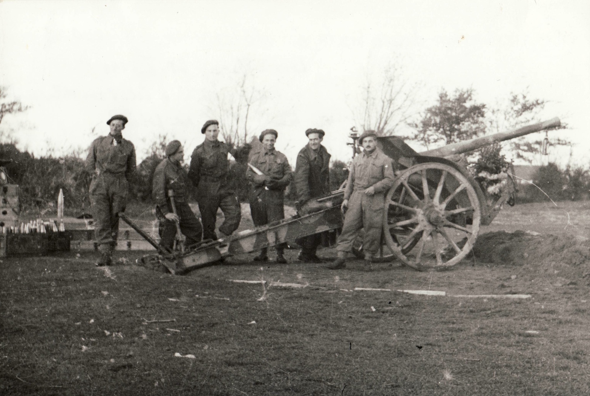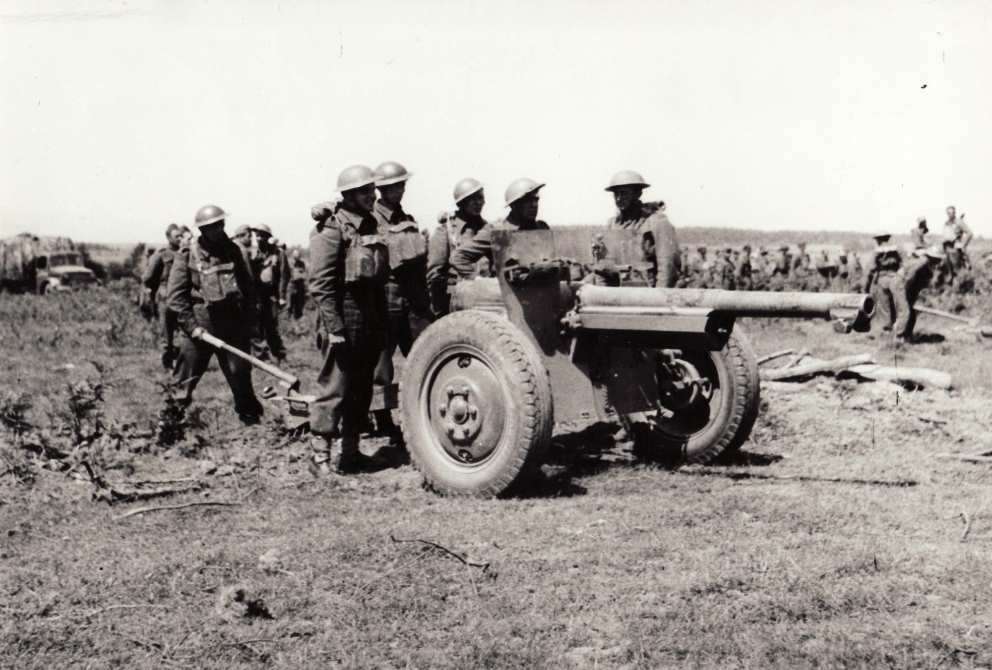 Dělostřelecké cvičení. Obsluha starého francouzského 75 mm děla, v Anglii na střelnici (přesné místo neznámé). Obsluha: Polák Rudolf, Kocman Václav, Skořepa František, Krč Josef