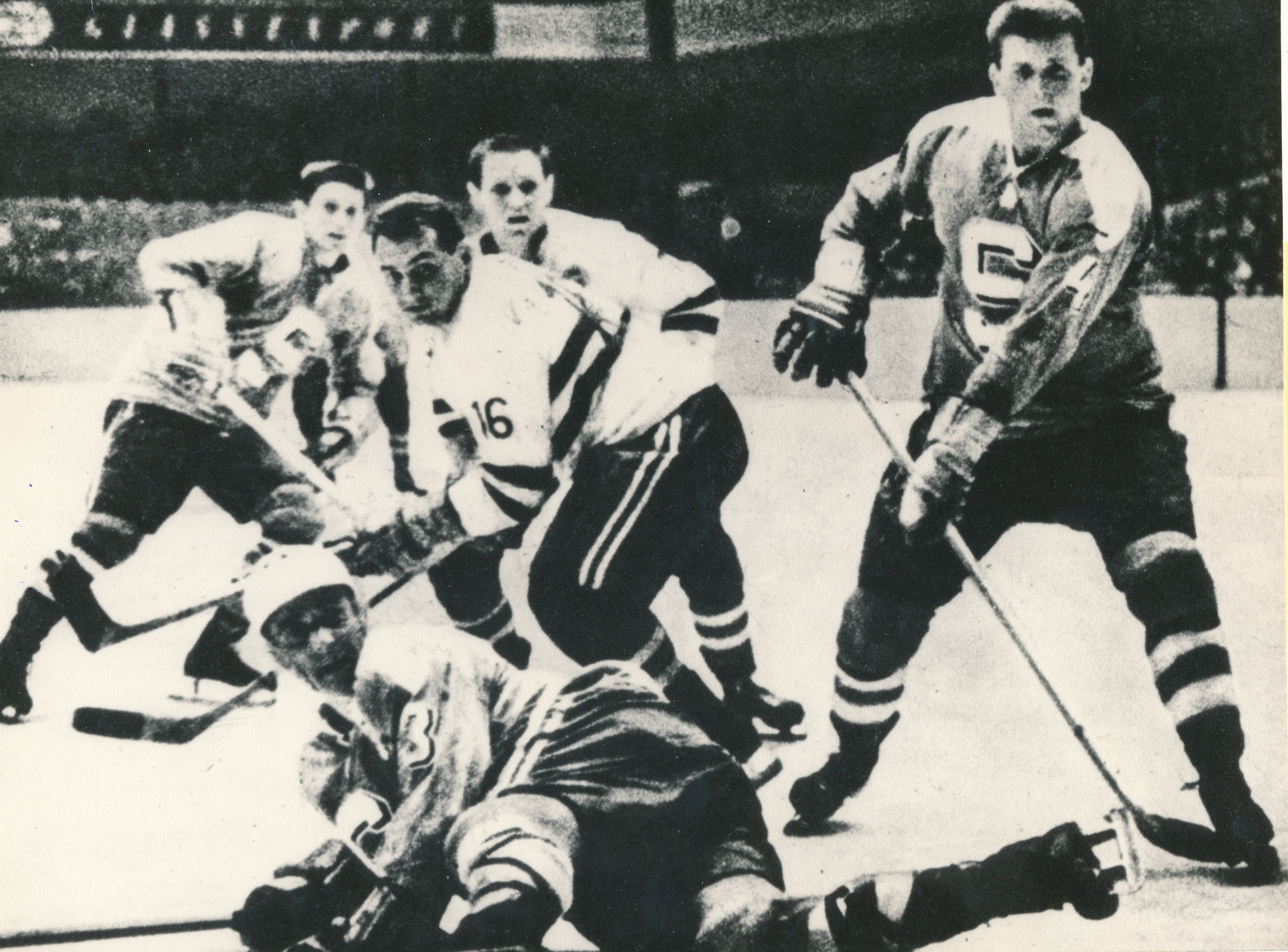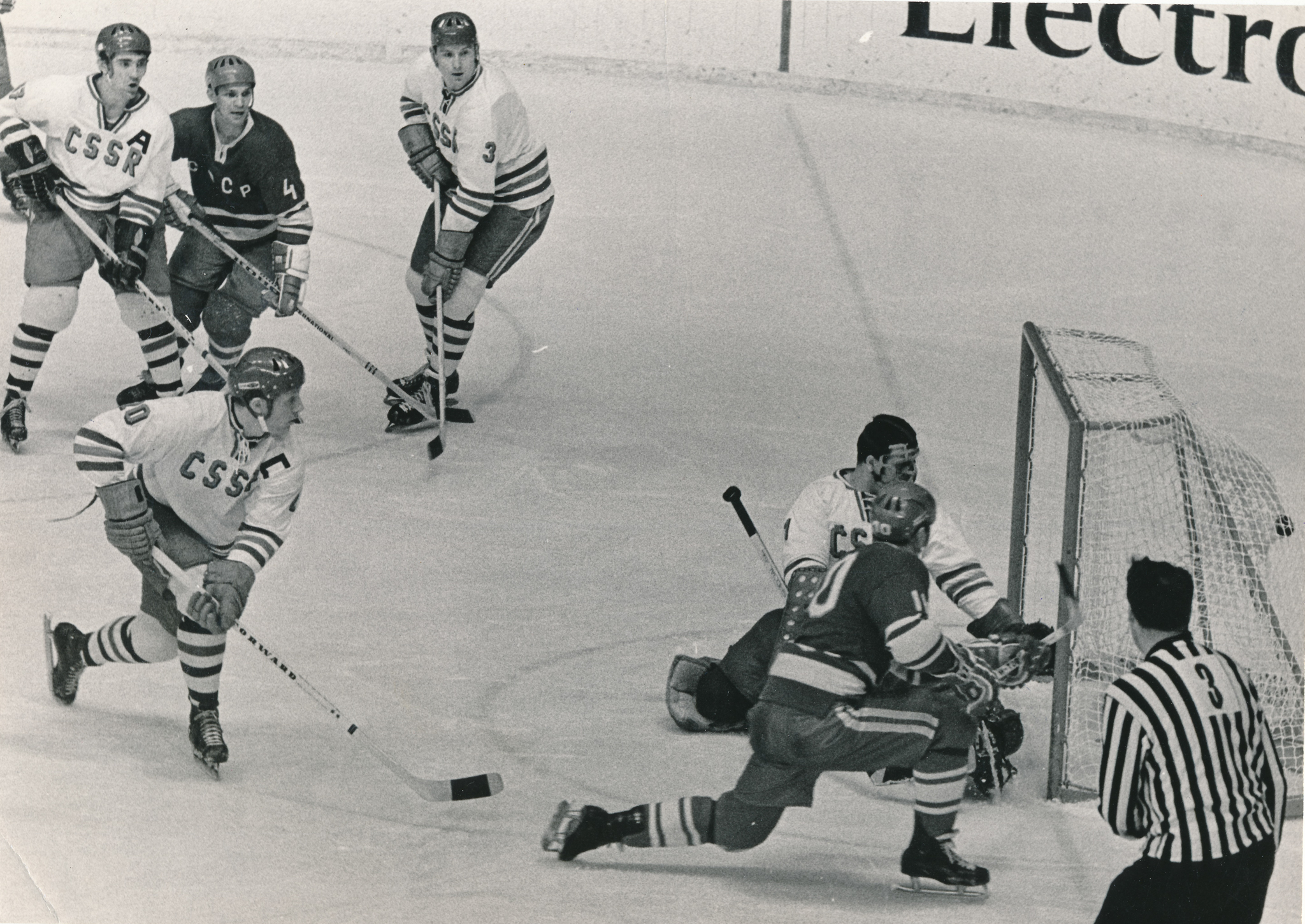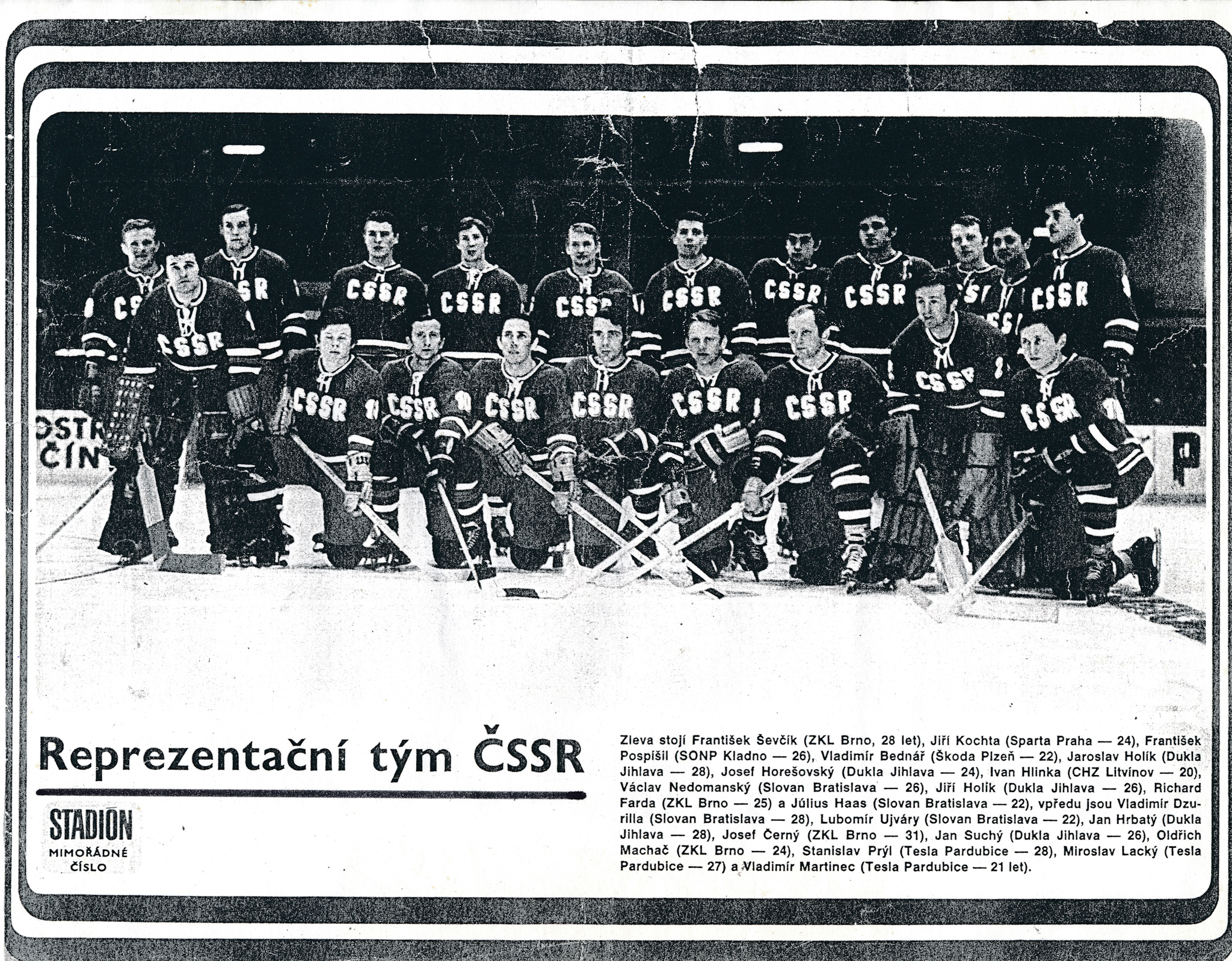 Josef Horešovský (první zprava nahoře) v utkání se Sovětským svazem na mistrovství světa 1969. Národní tým vyhrál 4:3, brankář Vlado Dzurilla dostává jednu ze tří branek