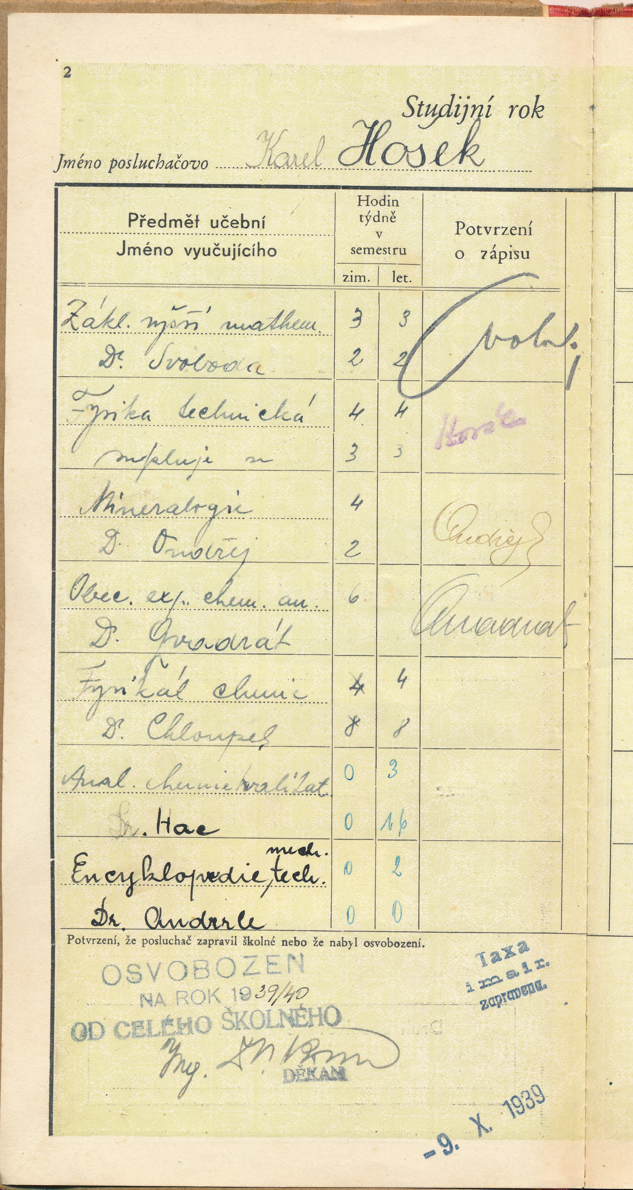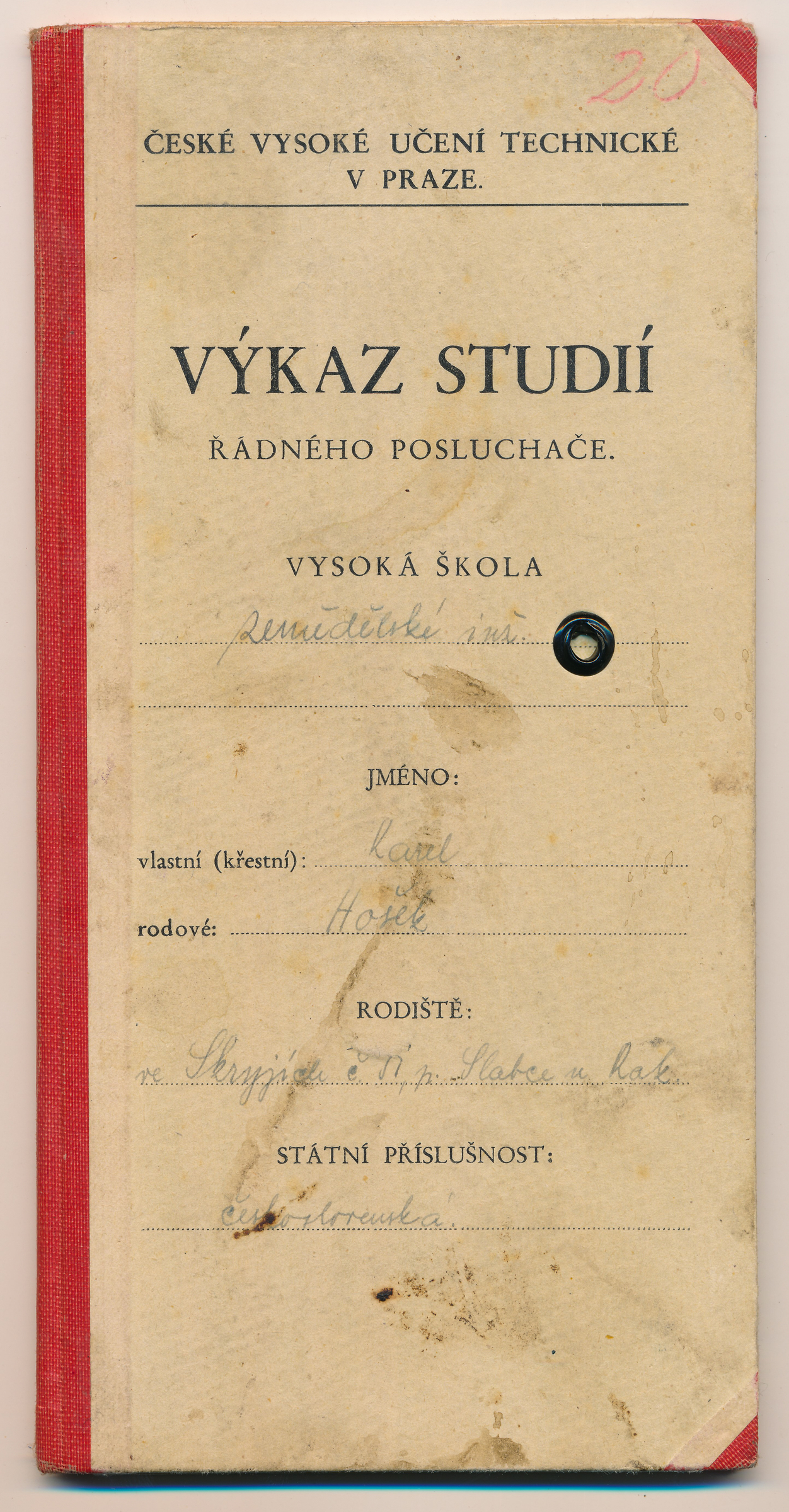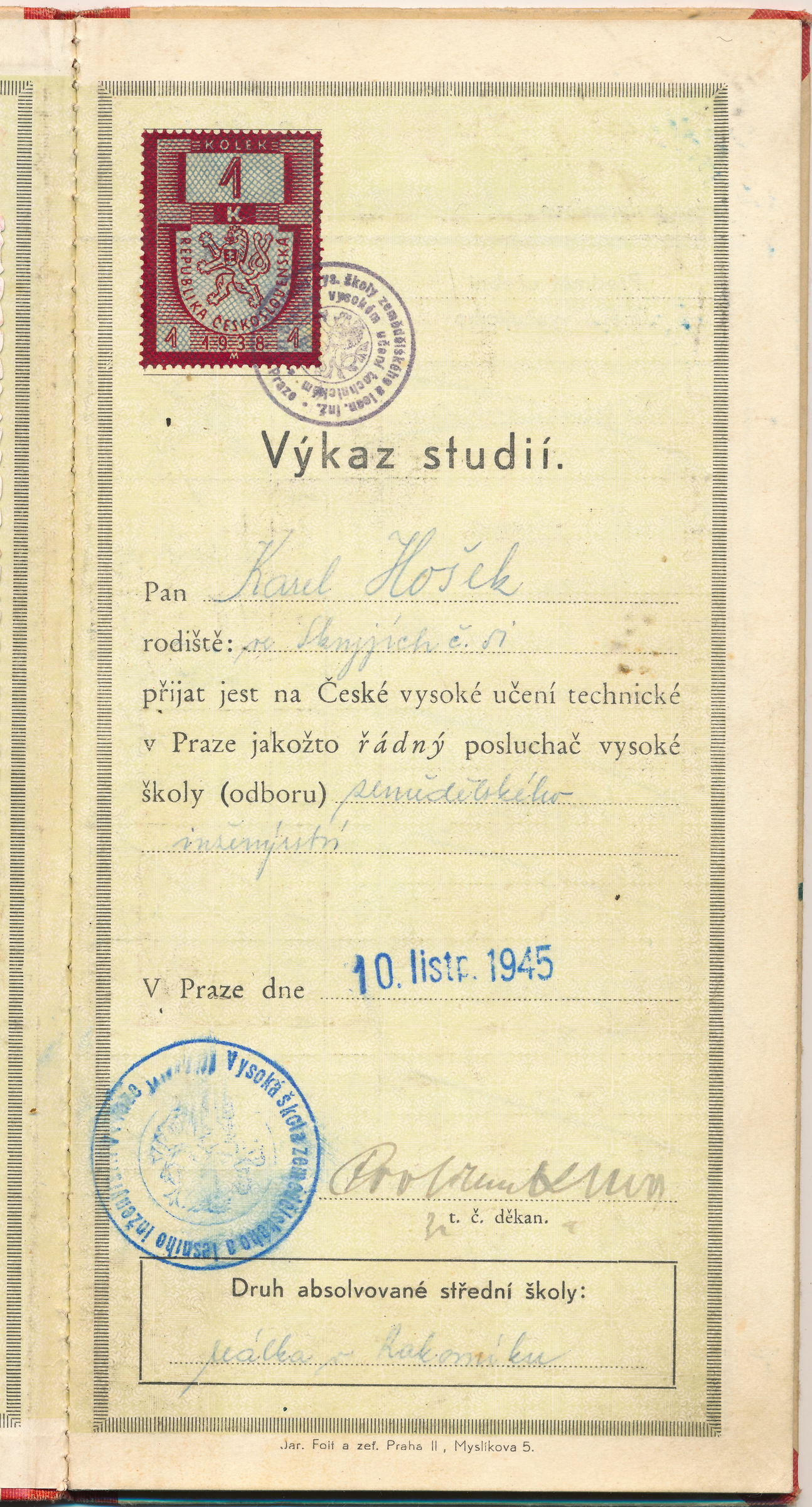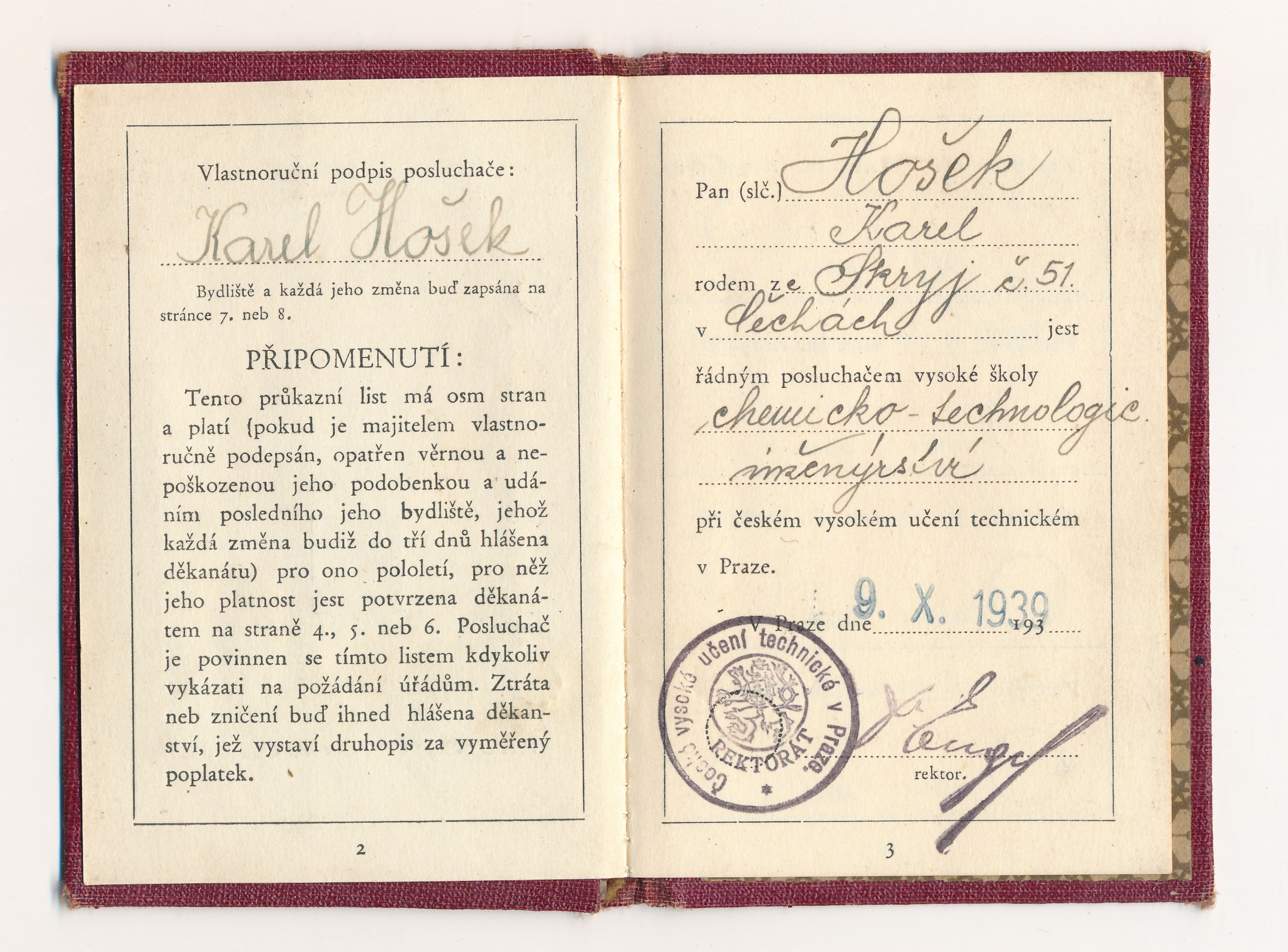 Karel Hošek (narozen 25. října 1919 ve Skryjích u Rakovníka) se na podzim 1939 jako student chemie zúčastnil masových protiněmeckých demonstrací. Po uzavření vysokých škol žil do konce války ve Skryjích. Na jaře 1942 se zapojil do podzemního hnutí a dva a půl roku pomáhal dvěma odbojářům hledaným gestapem. Po válce vystudoval zemědělskou vysokou školu, do roku 1953 vyučoval na zemědělských školách a pak se dobrovolně přihlásil na práci do jáchymovských dolů. Zemřel 7. září 2019.