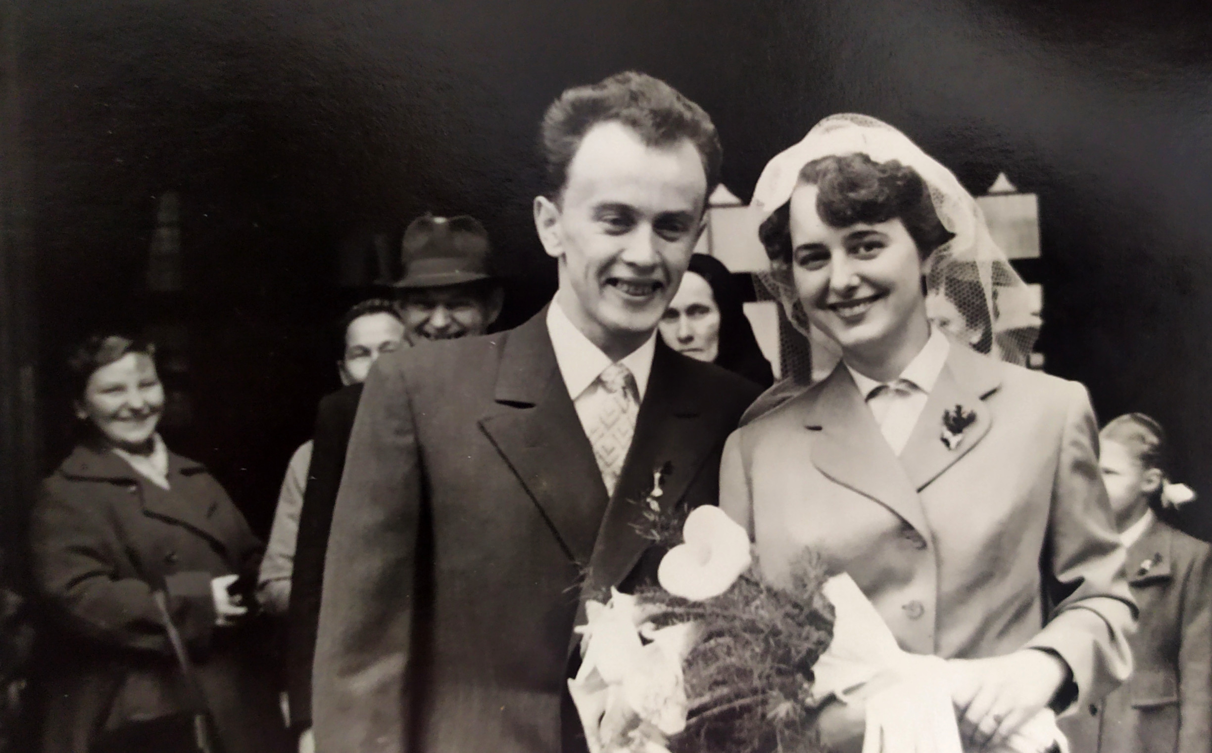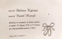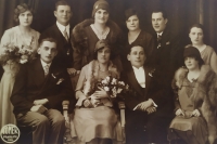 Svatba nevlastního syna tety Hrabětové (v horní řadě uprostřed nad nevěstou, sestra zemřelé maminky pamětnice), první zleva nahoře Blažena Huláková (sestra maminky pamětnice z prvního manželství jejího tatínka Jaroslava Valáška), první zprava ve spodní řadě Josefa Bautzová (druhá sestra maminky pamětnice z prvního manželství jejího tatínka Jaroslava Valáška), nad ní maminka pamětnice Jaroslava Kýrová, rozená Valášková