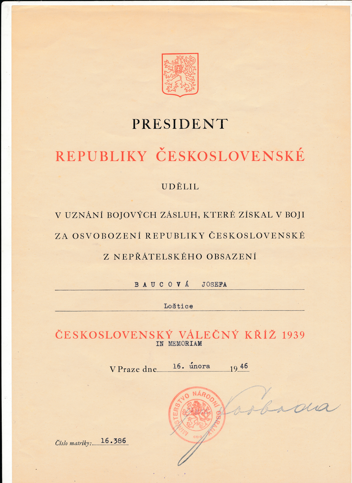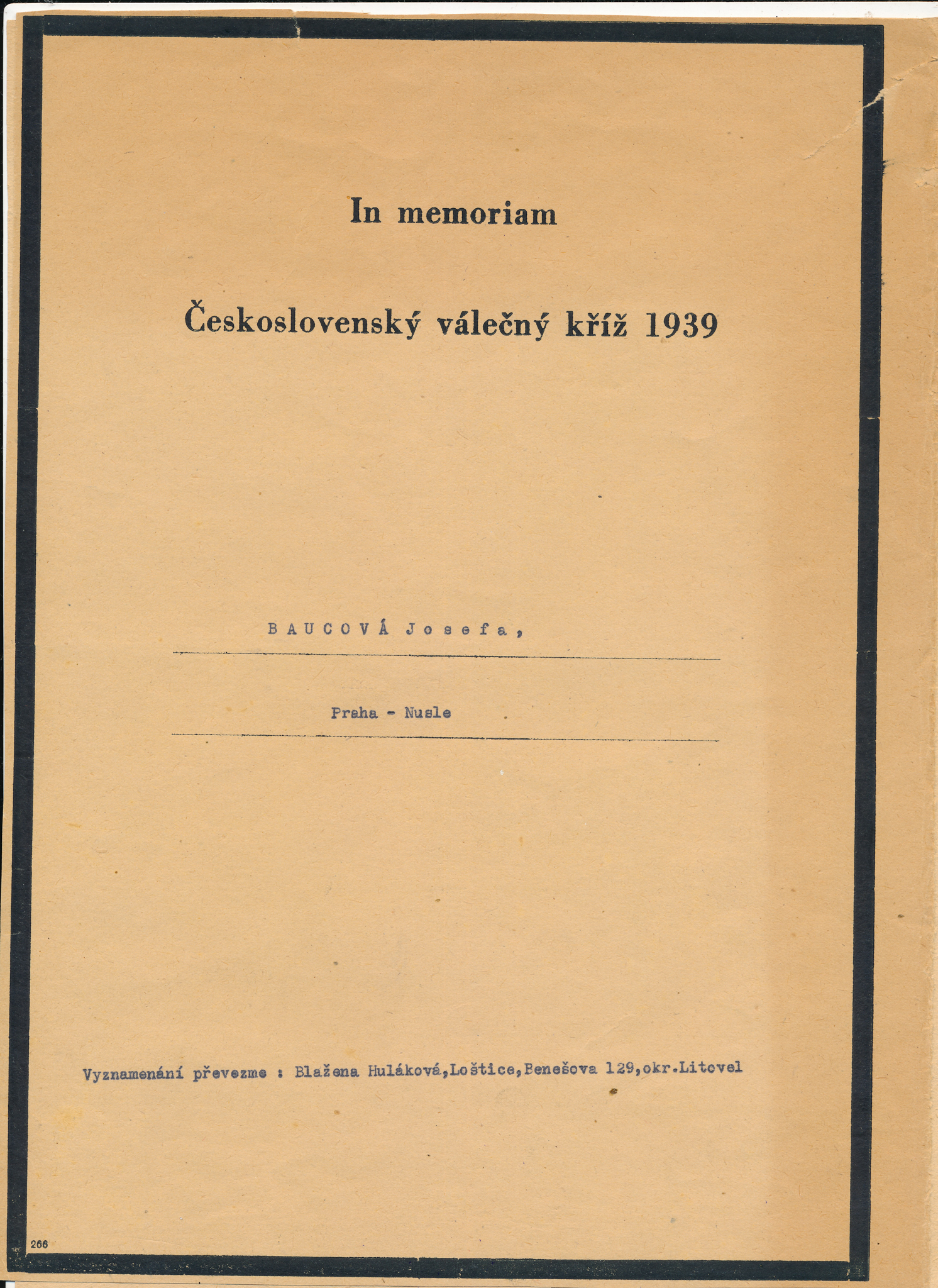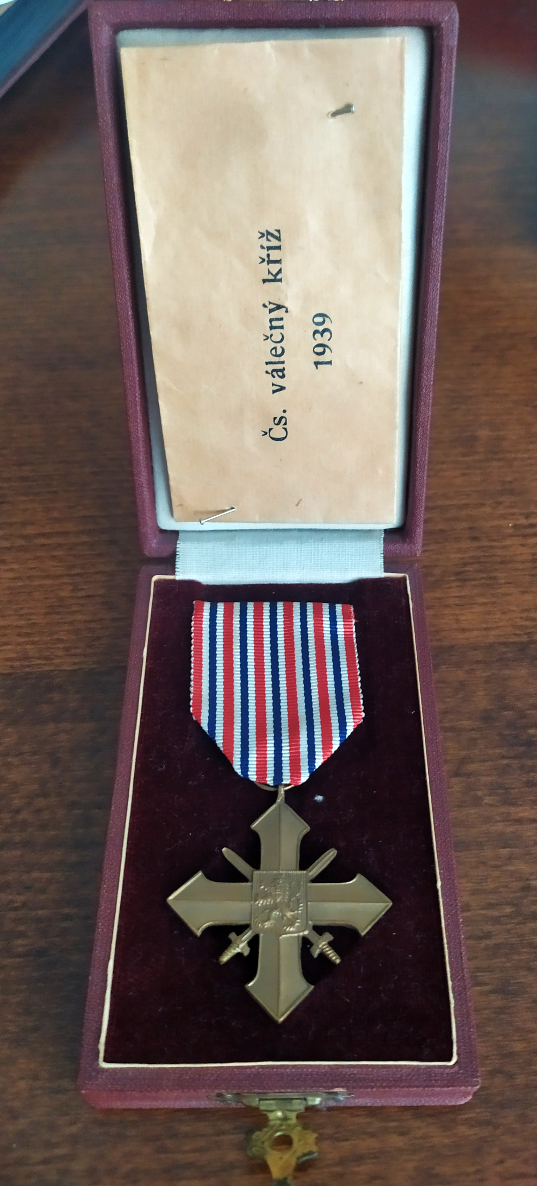 Vojenské vyznamenání Československý válečný kříž 1939, které udělil Josefě Bautzové prezident Edvard Beneš v uznání bojových zásluh, které získala v boji za osvobození republiky československé z nepřátelského obsazení