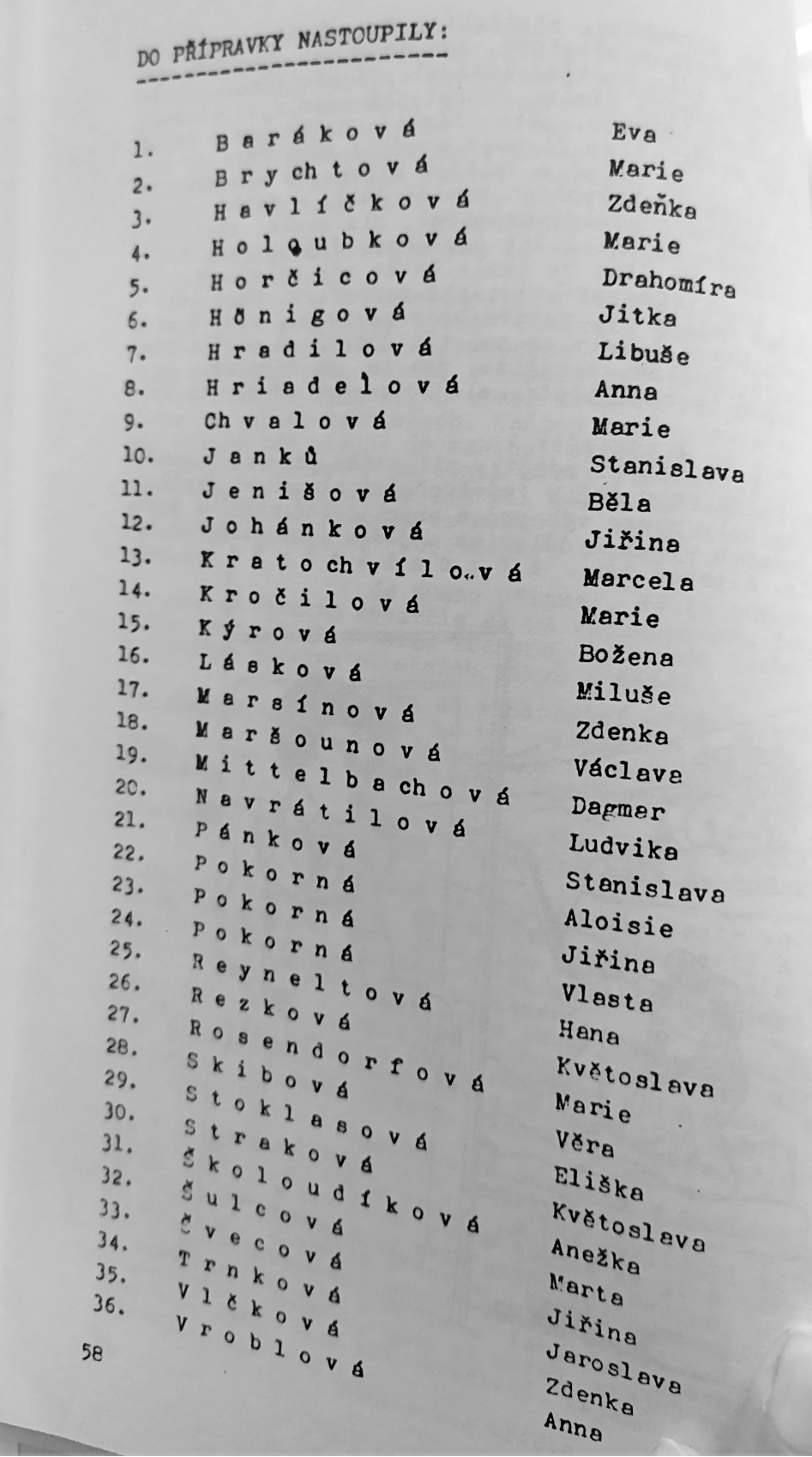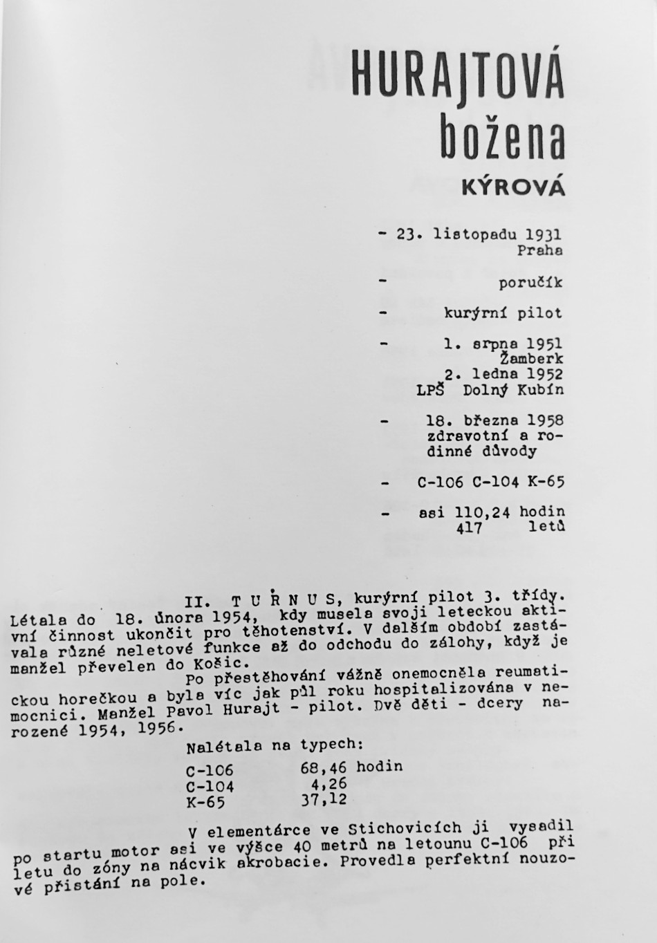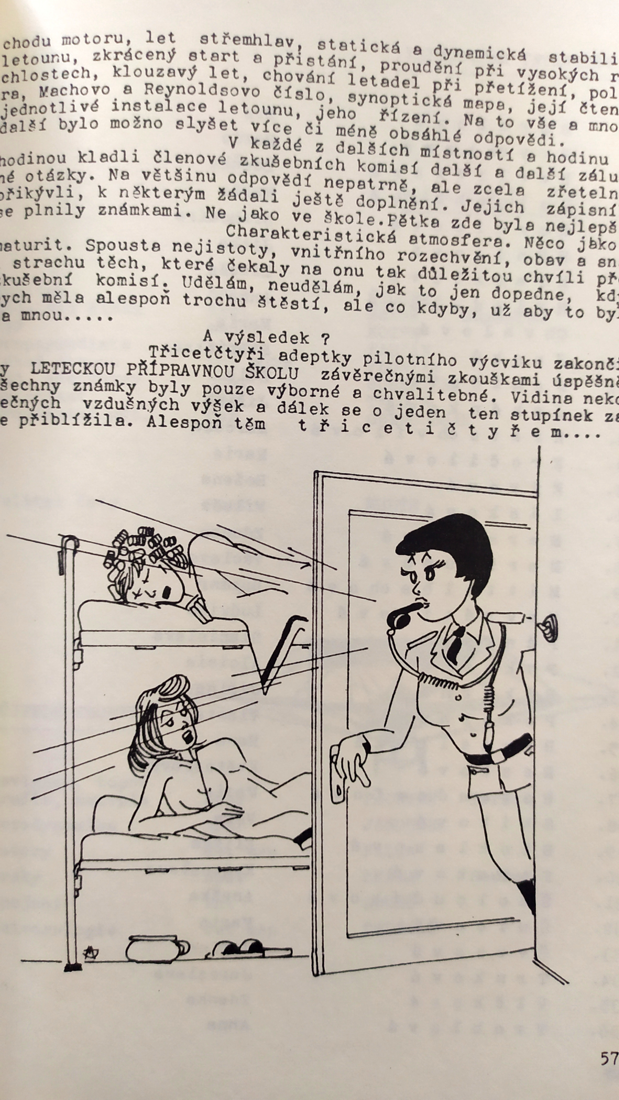 „Všude byly zdravotní prohlídky, zkoušky psychologické a měly jsme to tam hodně přísné, víc se na nás hledělo než na kluky, na muže, a měly jsme stejný výcvik jako muži. Nikdy mě nenapadlo, že bych se dostala k letectvu, vždycky jsem obdivovala letadla, jak prostě se to tam vznáší, nevěděla jsem proč. Potom samozřejmě jsem se o všem dozvěděla, protože jsme měly aerodynamiku, draky, motory. Prostě učení – předmětů bylo hodně, to jsme musely zvládnout, a pak přišlo létání. První, to byla C-106, tak jsem seděla vedle Hany Vávrové. To byla učitelka létání, taková štíhlounká, drobná žena, že by do ní nikdo neřekl, že něco podobného bude ovládat. Sedla jsem si vedle ní, byla jsem přikurtovaná, pod sebou samozřejmě padák. A teď to vznášení, to letadlo, jak se odlepilo od země, to bylo takové zvláštní, něco úplně nového, překvapujícího.“
