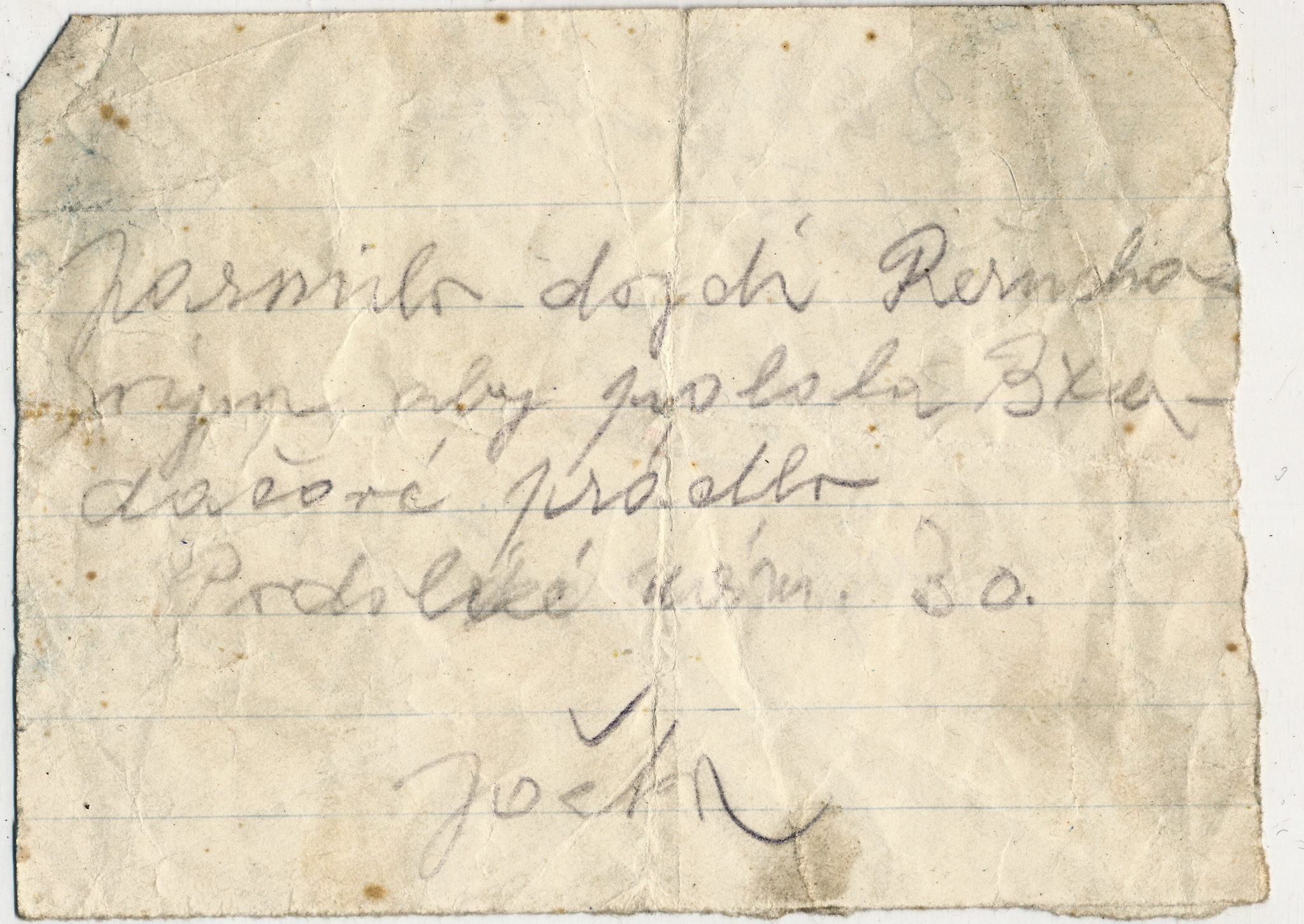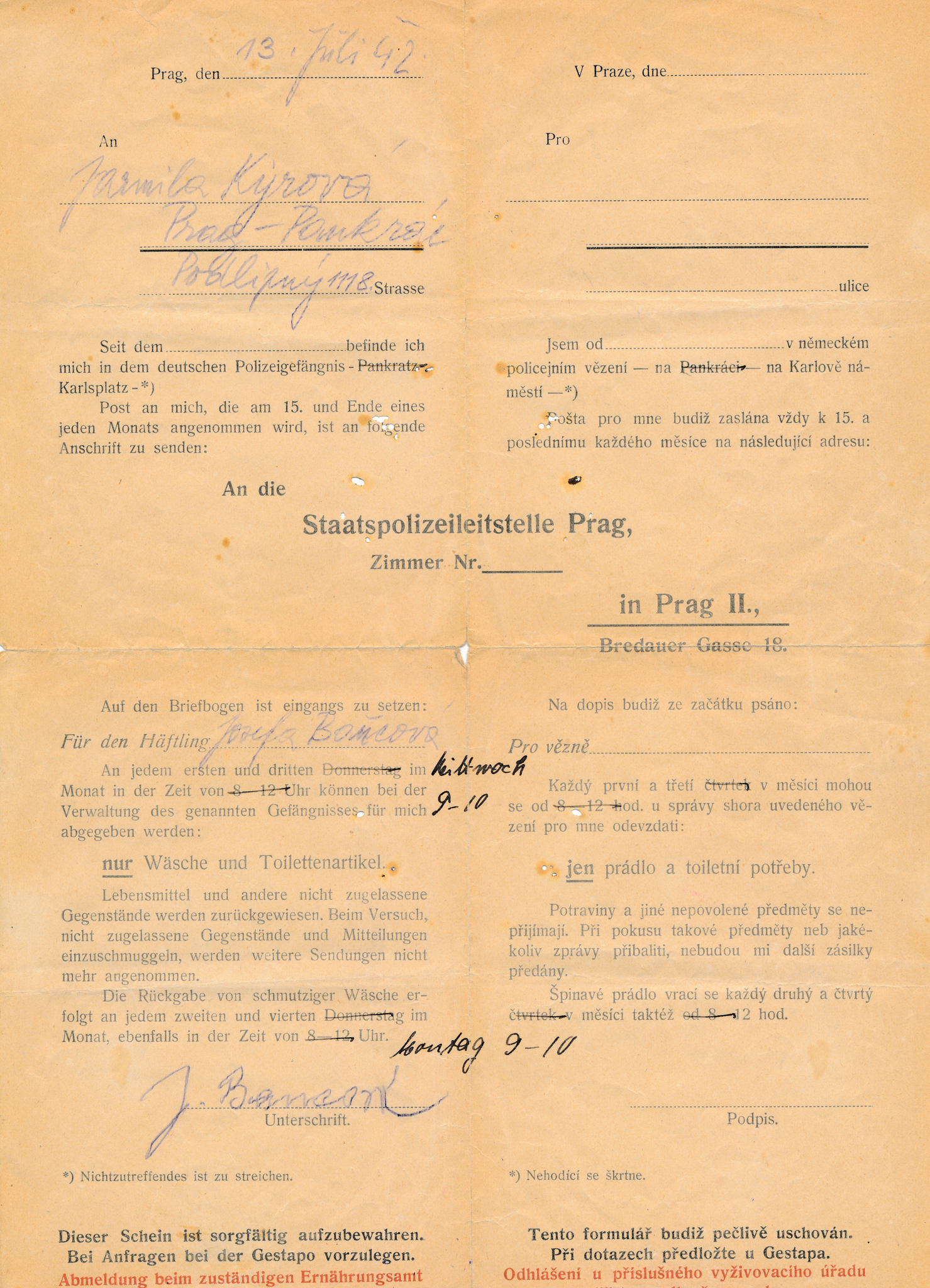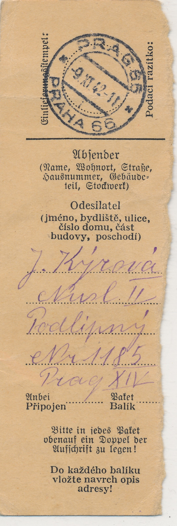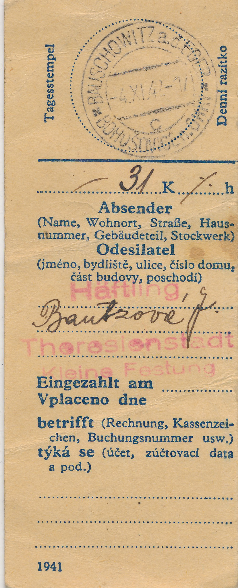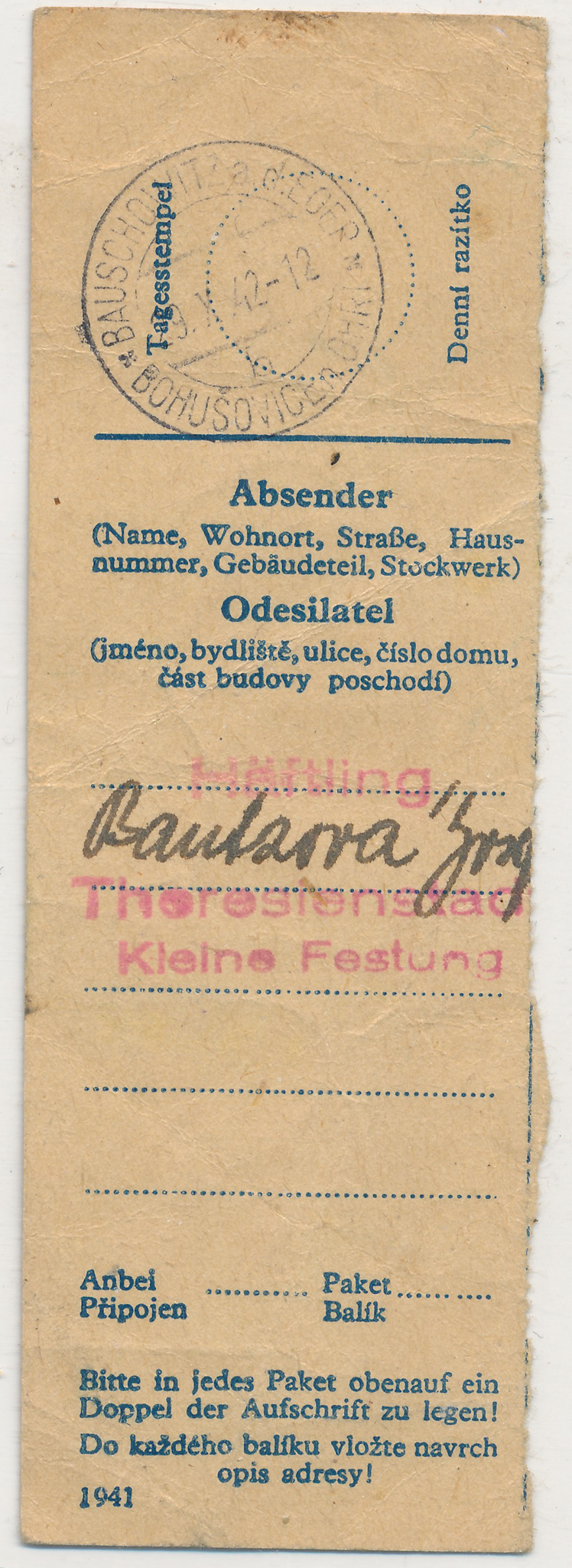 Potvrzení o odeslání zásilky Josefy Bautzové z vězení gestapa v Malé Pevnosti v Terezíně z 29. října 1942, v té době již nežila, ale maminka pamětnice o tom nevěděla