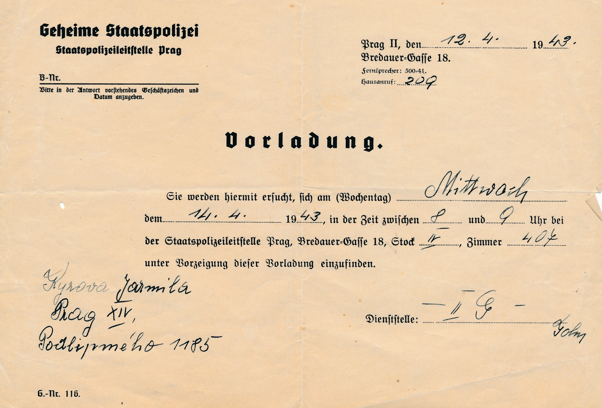 Potvrzení o odeslání zásilky Josefy Bautzové z vězení gestapa v Malé Pevnosti v Terezíně ze 4. listopadu 1942, v té době již nežila, ale maminka pamětnice o tom nevěděla