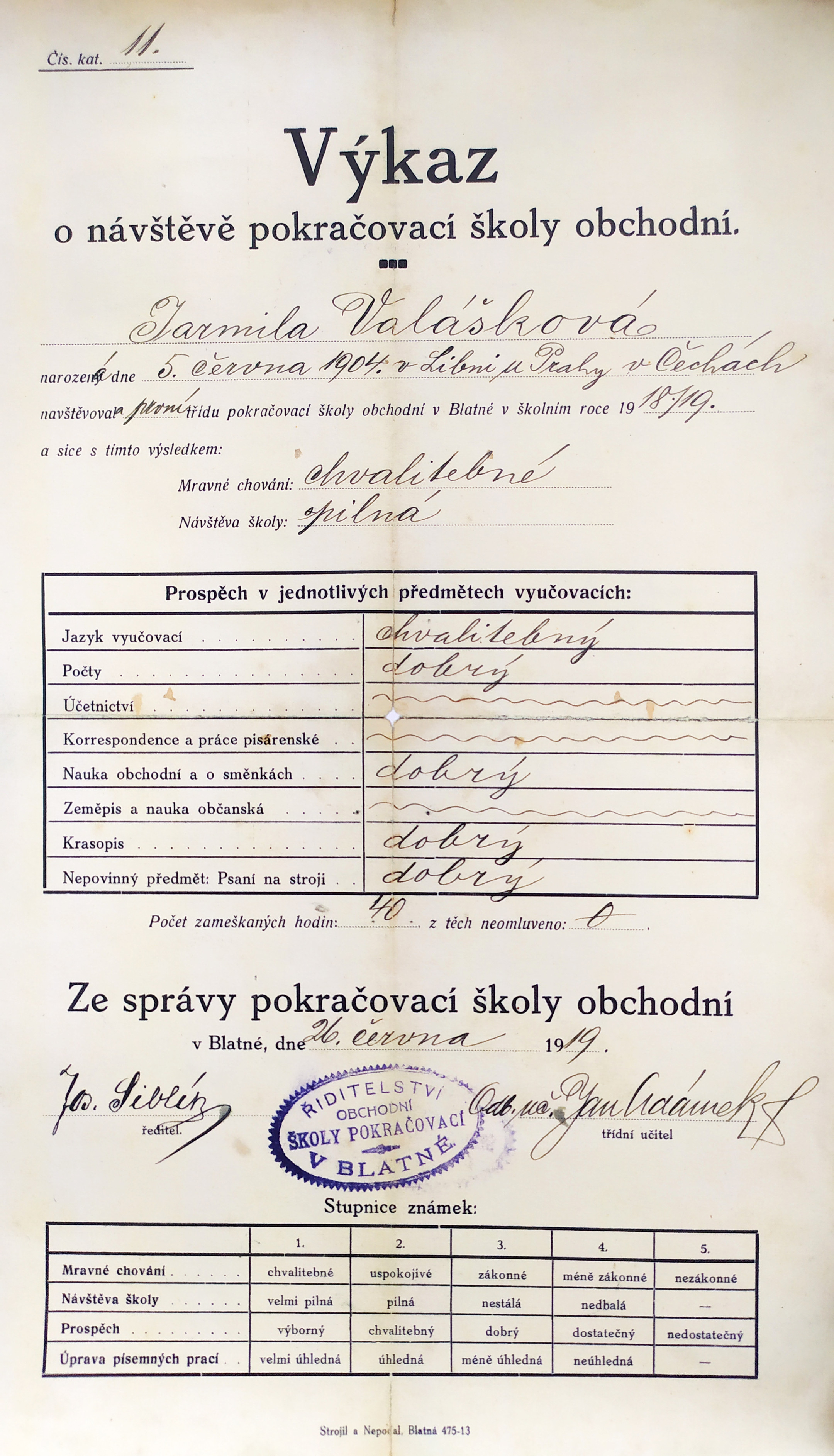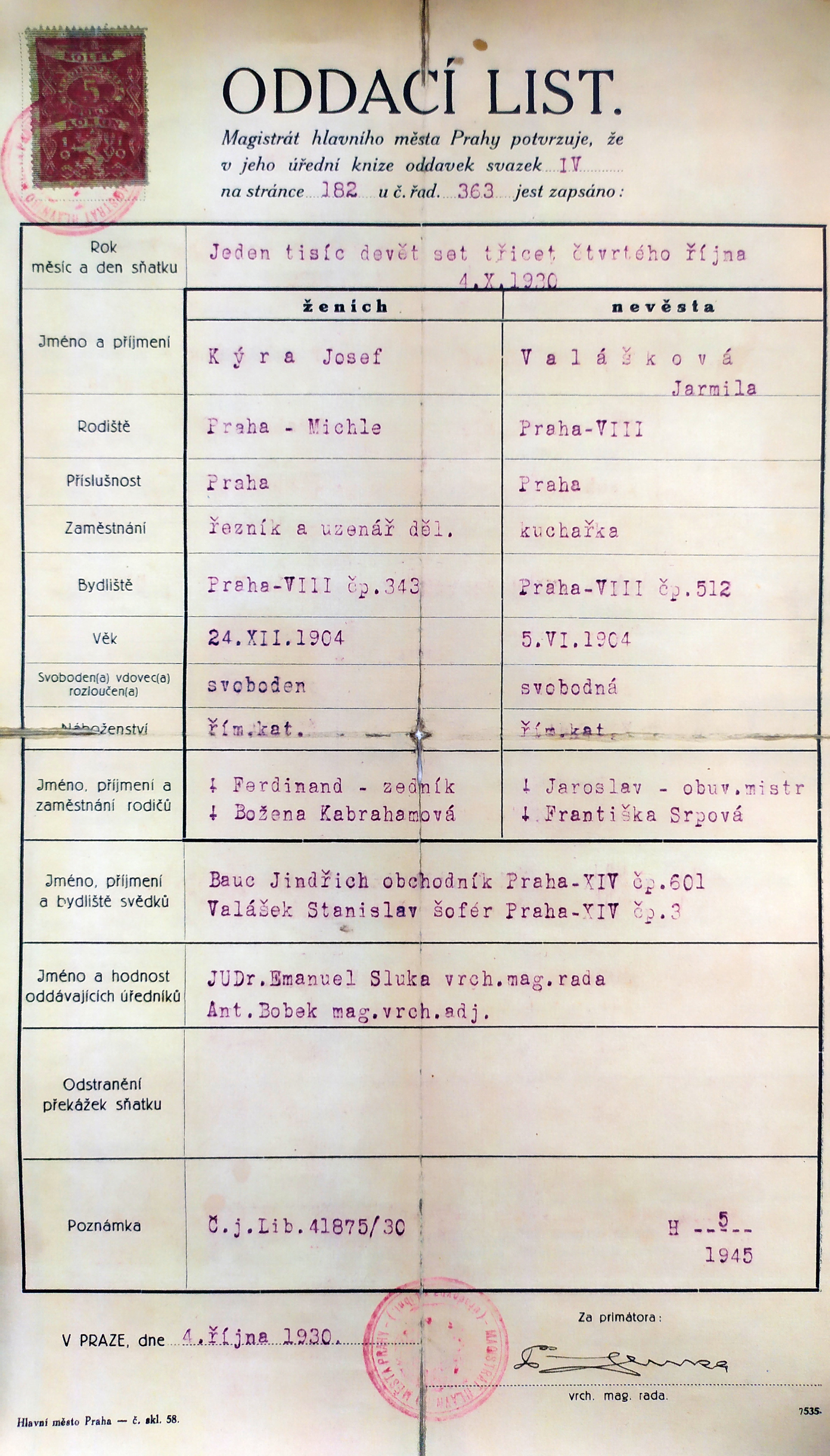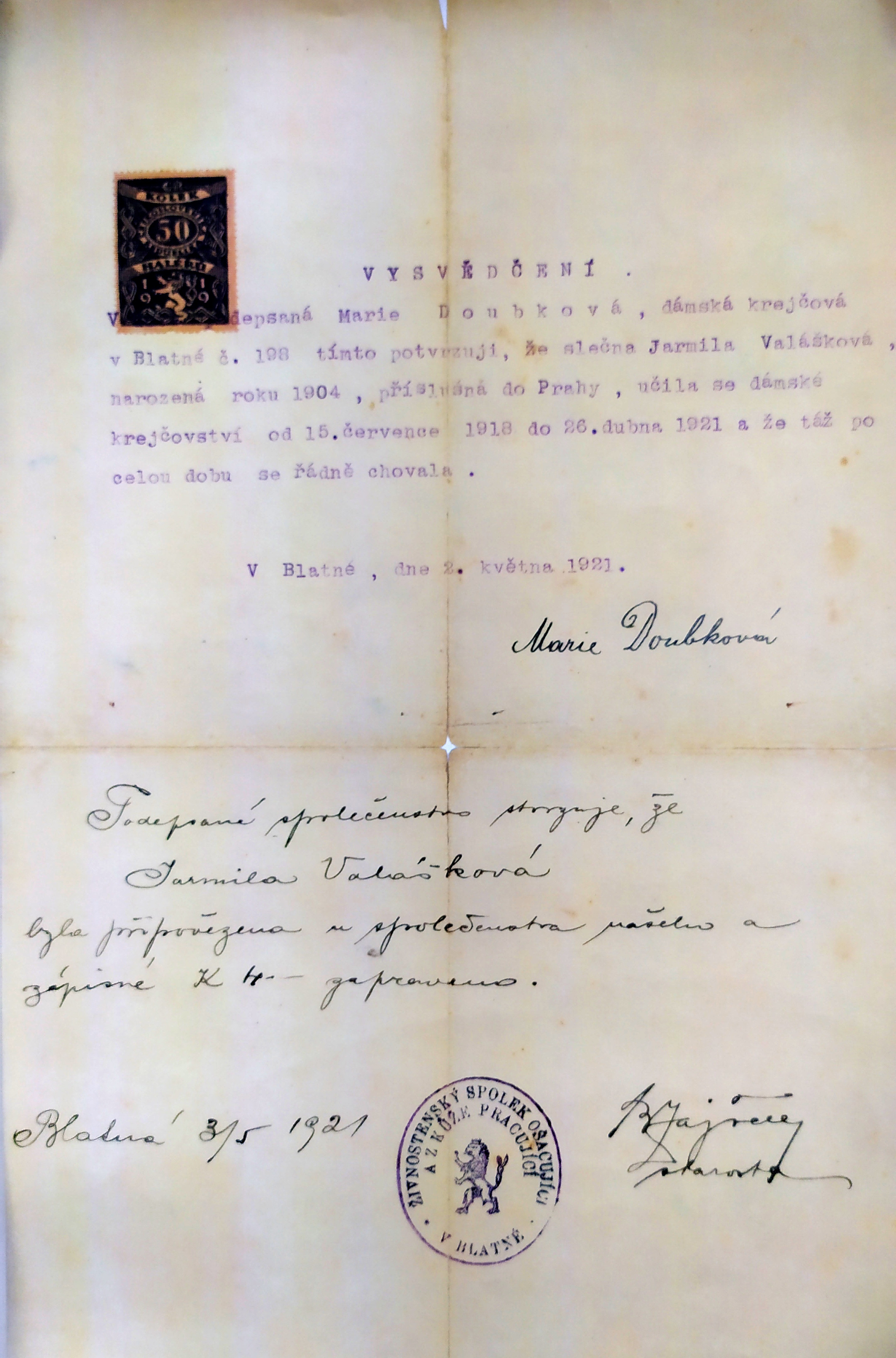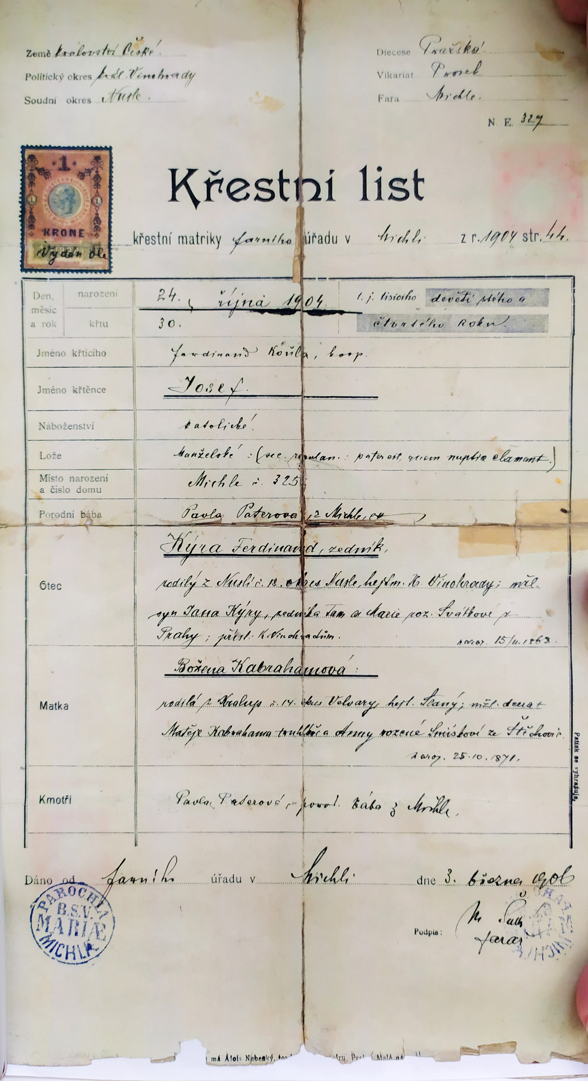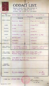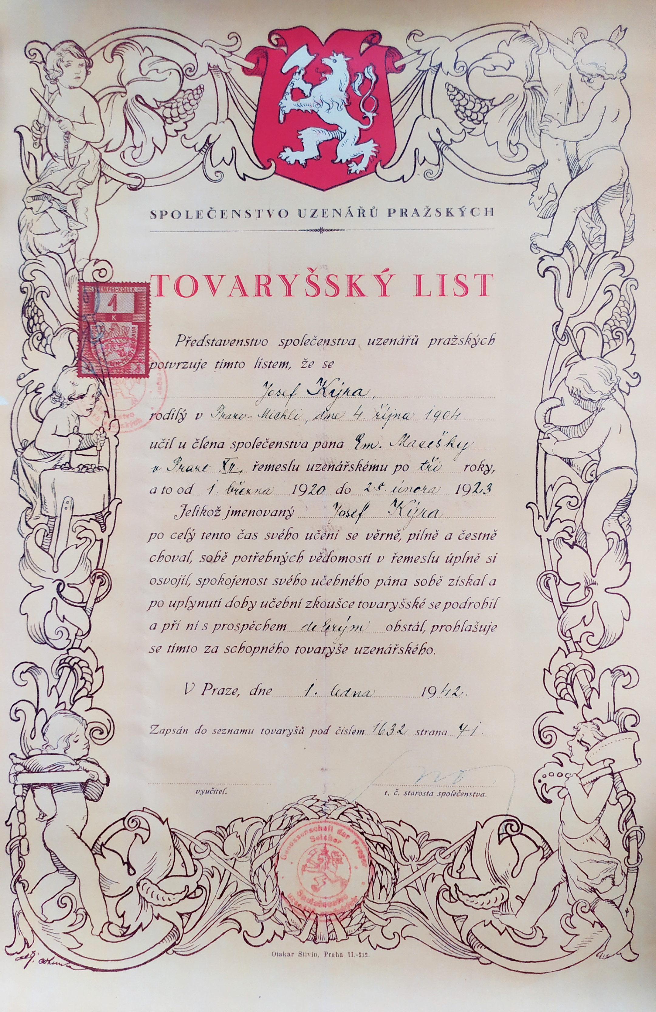 Tovaryšský list tatínka Josefa Kýra, který potvrzuje, že se vyučil uzenářem u Emanuela Macešky, známého pražského uzenáře, majitele Maceškova paláce na Vinohradech
