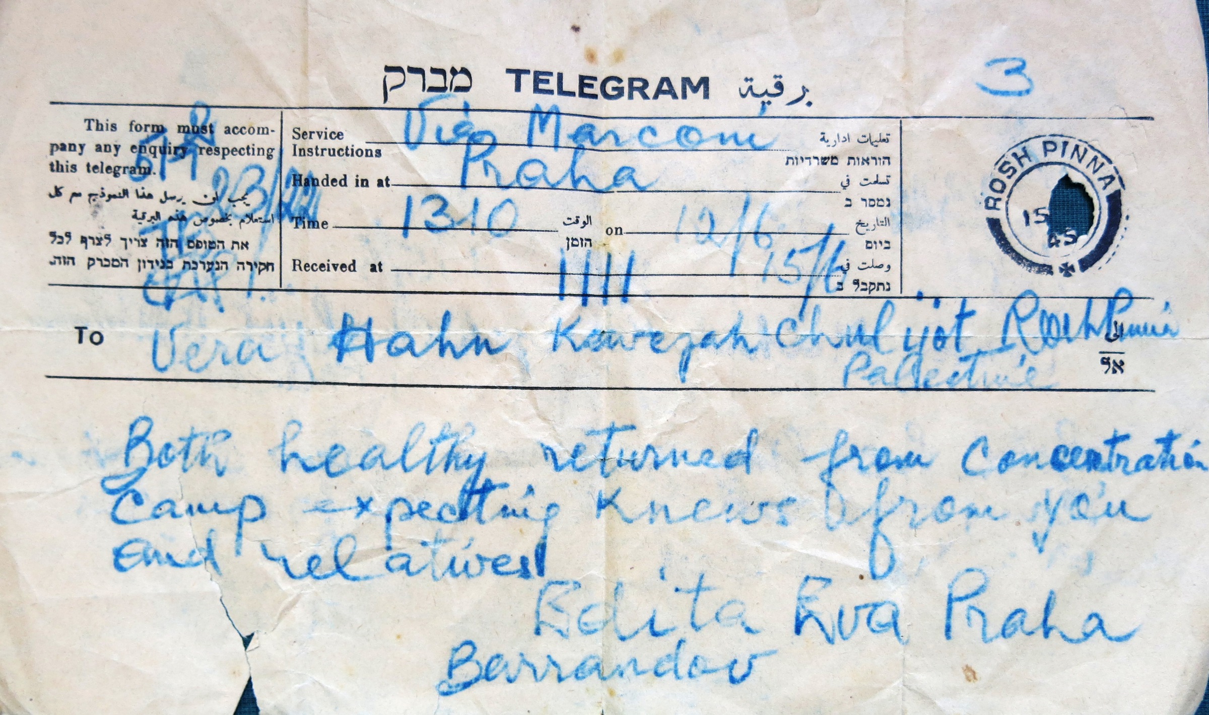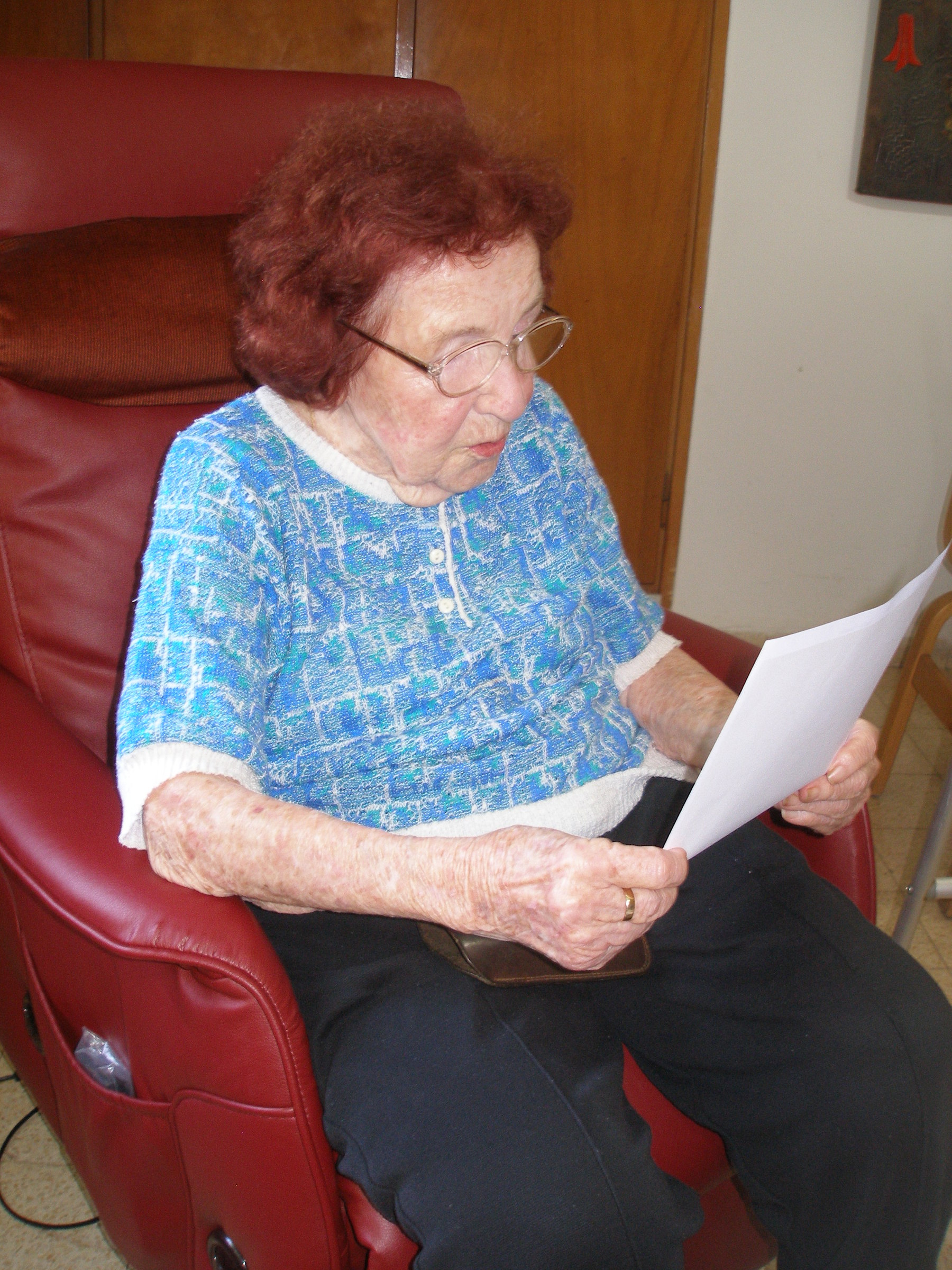 „Pamatuješ si na jméno té lodi?“ – „Ano, Galilea. Byla to dost primitivní loď, ale měly jsme spolu kabinu, samy s Růžou, to nám ještě zaplatili rodiče. Potom, když jsme přišly do Izraele, připluly jsme do Tel Avivu, ne do Haify, a Tel Aviv vypadal tak primitivně, že jsem si myslela, že je to nějaké ubohé městečko. Tam nás čekali dva přátelé, kteří už žili v Izraeli déle, vzali nás na výlet a potom jsme jeli do Nahalalu, do školy.“