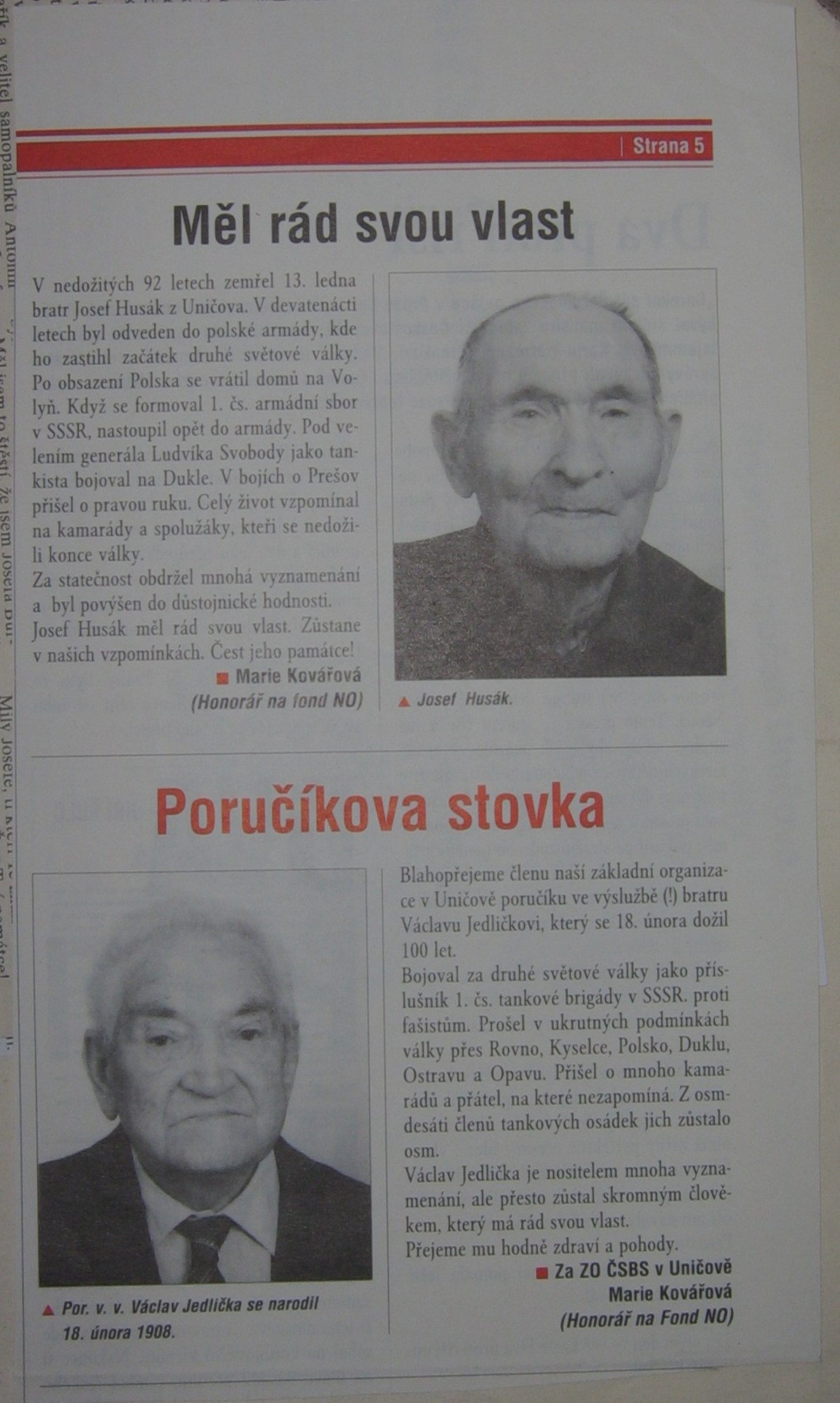 „Byl podbitej tank. A to byl známej kluk. Řidič tanku. A ten tank byl zničenej, že nemohl dál jet. A on dělal řidiče a byl zraněnej. Bylo to u Dukly, na začátku těch bojů. Ten raněnej kluk se jmenoval Jaroslav Horáček. A křičí: ‚Hoši! Pojďte mně pomoct! Já jsem raněnej, já nemůžu vylézt z tanku.‘ A ten tank hořel. Tak on chudák byl raněnej a v tom tanku uhořel. My jsme mu nemohli pomoct. Tam nikdo do toho nemohl. V tanku je munice a ono to tam explodovalo. No, byl raněnej a on jako řidič seděl před tím oknem. Jenomže on by tím oknem bejval možná utekl, ale měl něco s nohama.“