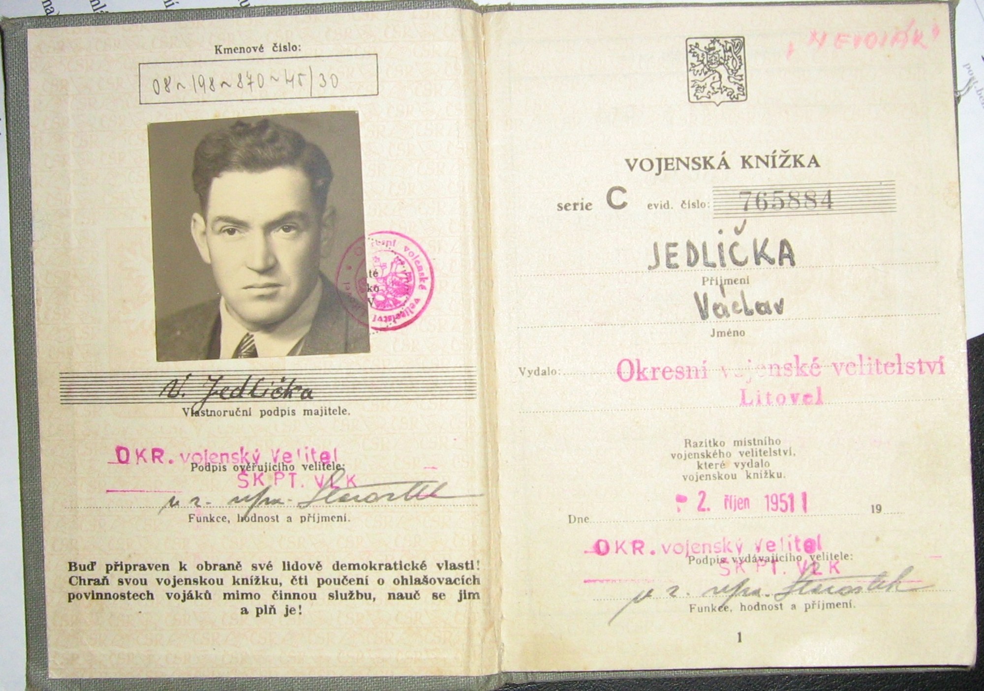 Václav Jedlička se narodil 18. února v roce 1908 v Hlinsku na Volyni. Za svůj život zažil vícero převratů a výměn režimů. V době jeho dětství patřil Hlinsk pod carské Rusko, od roku 1920 pak připadal Polsku. Ve 22 letech narukoval Václav Jedlička na vojnu do polské armády, sloužil u 28. dělostřeleckého pluku v Deblinu u Varšavy. Po napadení Polska Německem narukoval na obranu Lvova. Vojsko čekalo německou armádu, ale bylo zaskočeno z východu útočícími Sověty. Obrana Lvova trvala pouhé tři týdny. Po složení zbraní byl Václav Jedlička odvážen do zajateckého tábora, ve vesnici Ozerany však z transportu utekl a tím se vyhnul internaci. Doma pracoval jako zámečník do té doby, než byl nuceně nasazen ve stolárně ve Zdolbunově. V roce 1944 narukoval pro změnu do československého sboru, v němž byl přidělen k 2. tankovému praporu jako zbrojíř. Kvůli zánětu průdušek a přetrvávajícím problémům s dechem byl z tanku přeřazen k řidičům. Jeho hlavním úkolem bylo dodávat střelivo tankům. Ve studebakeru prošel karpatsko-dukelskou i ostravskou operací. Po válce mu byl přidělen statek v Renotech (dnes součást Uničova). Zanedlouho vstoupil do místního JZD, ve kterém dělal pět let předsedu. Po odstoupení z funkce pracoval až do důchodu jako hlavní mechanik. Václav Jedlička zemřel 15. října roku 2010.