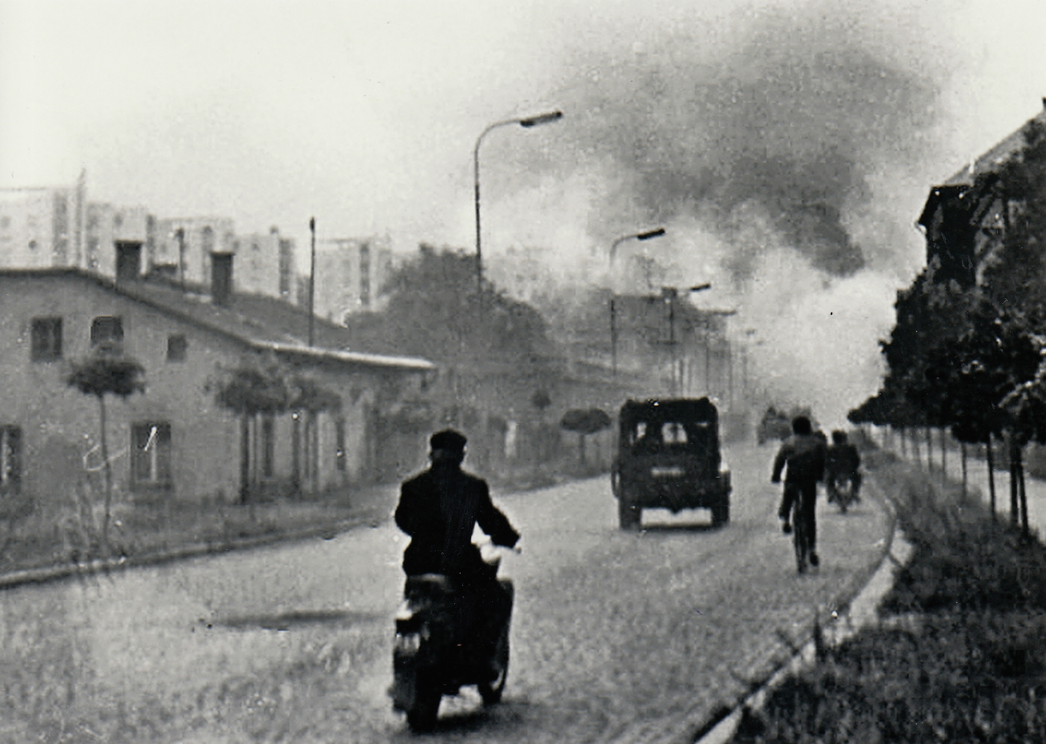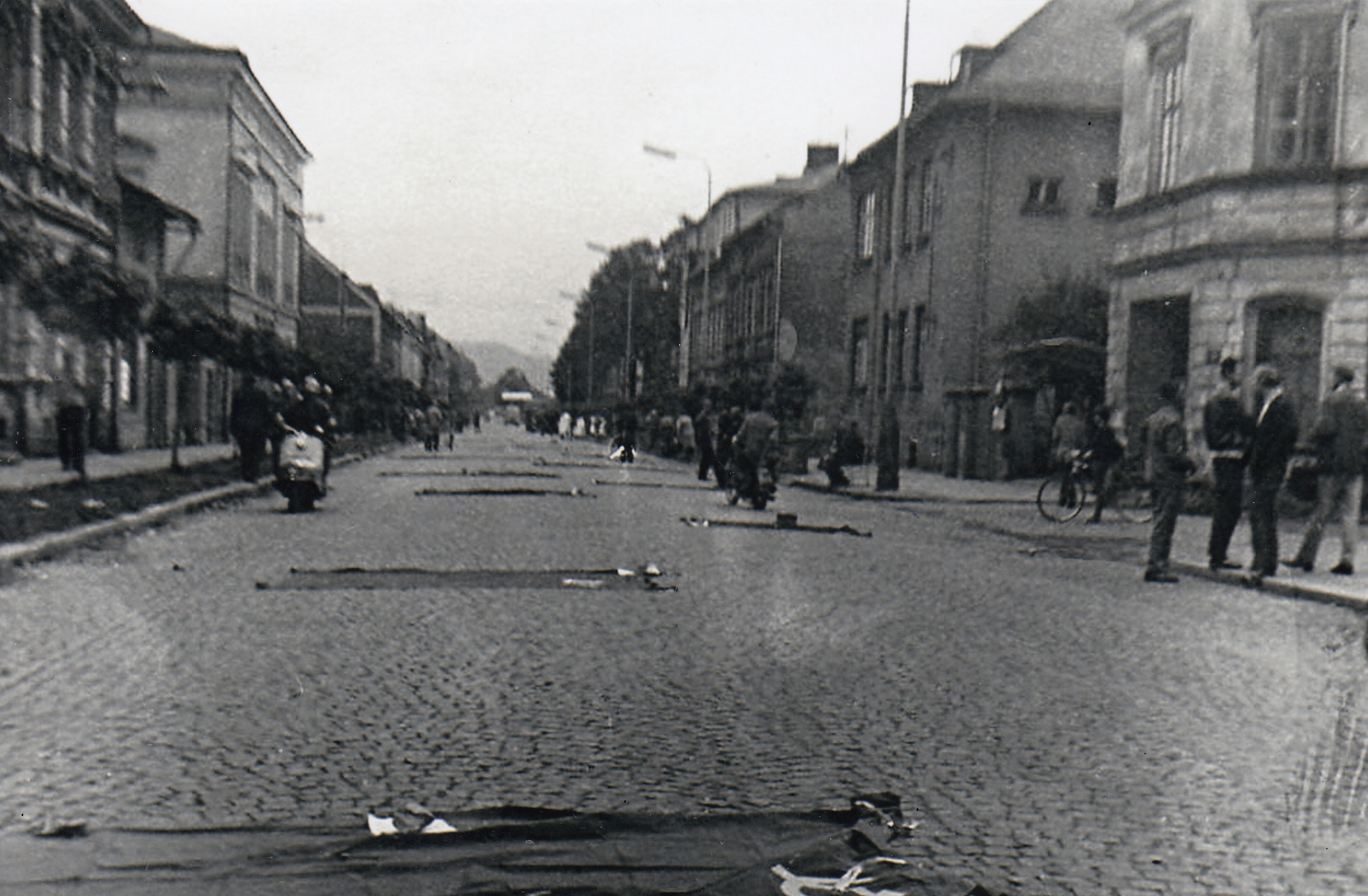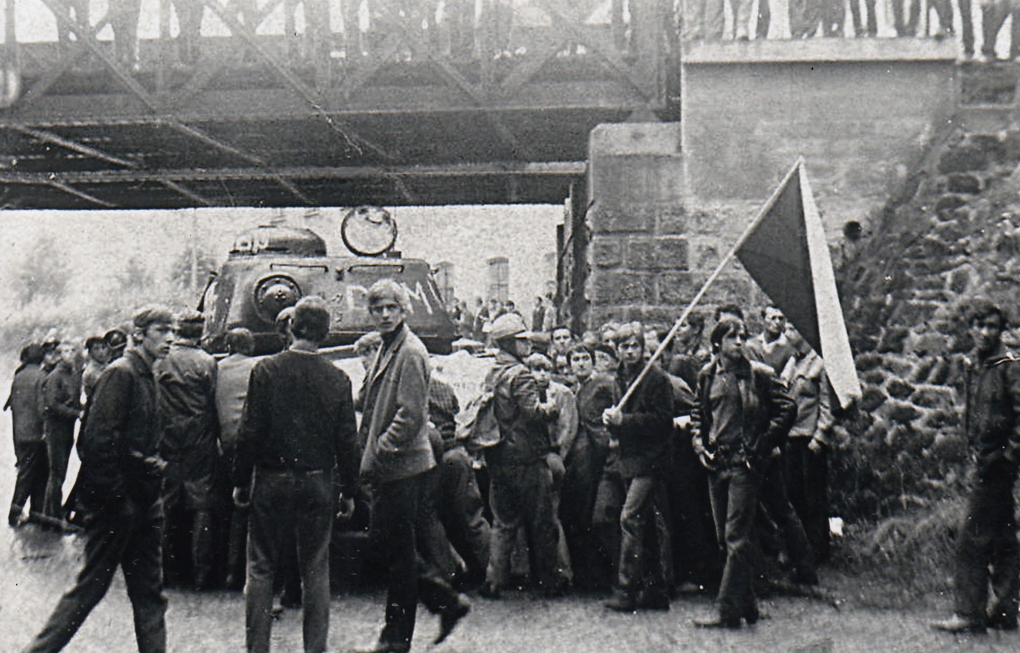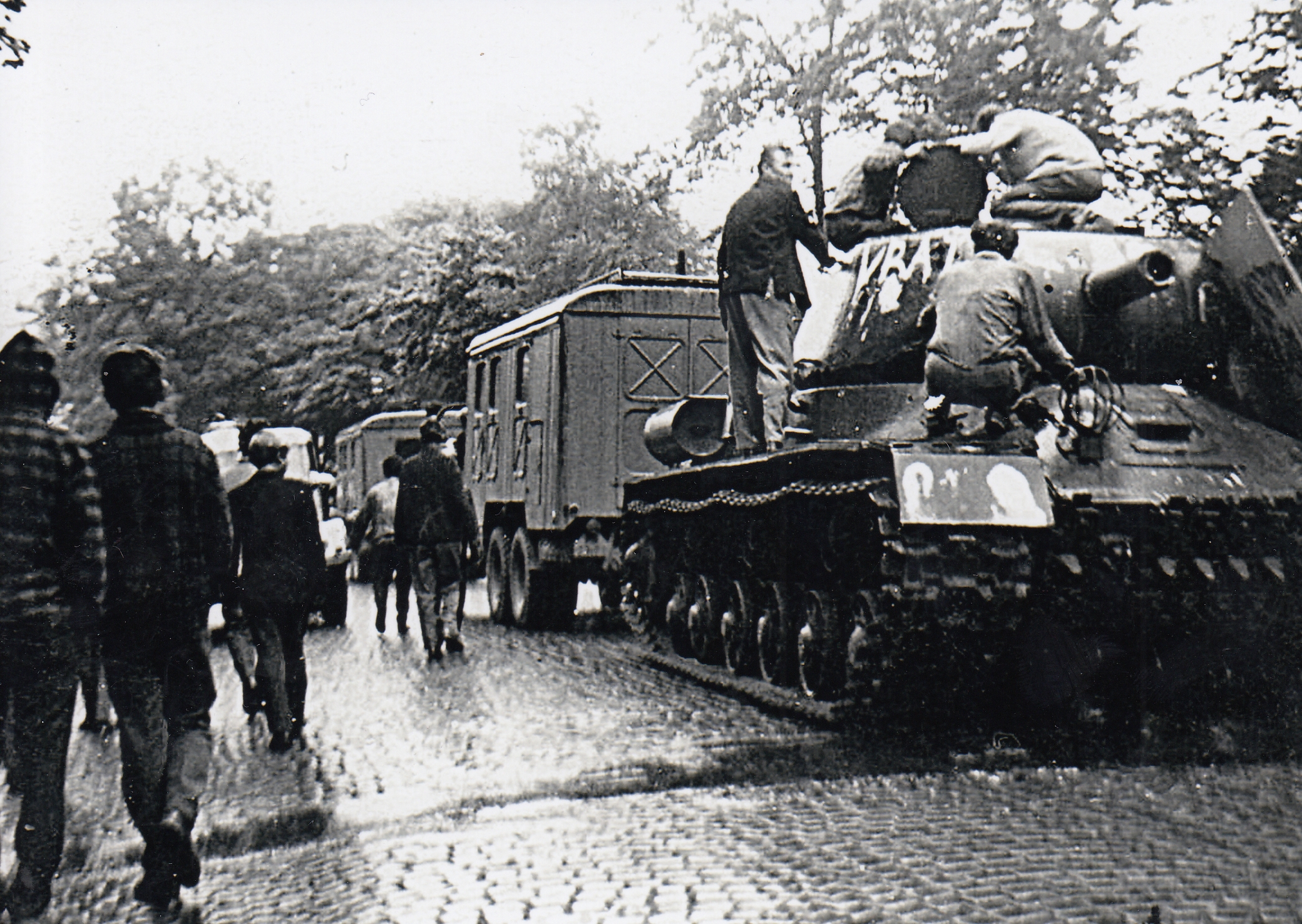 Tank okupantů vojsk Varšavské smlouvy tažený z podstavce pod viadukt v Trutnově v srpnu 1968. Cyklus fotografií Jaroslava Jirmana z bouřlivého odporu občanů Trutnova během srpnové okupace 1968
