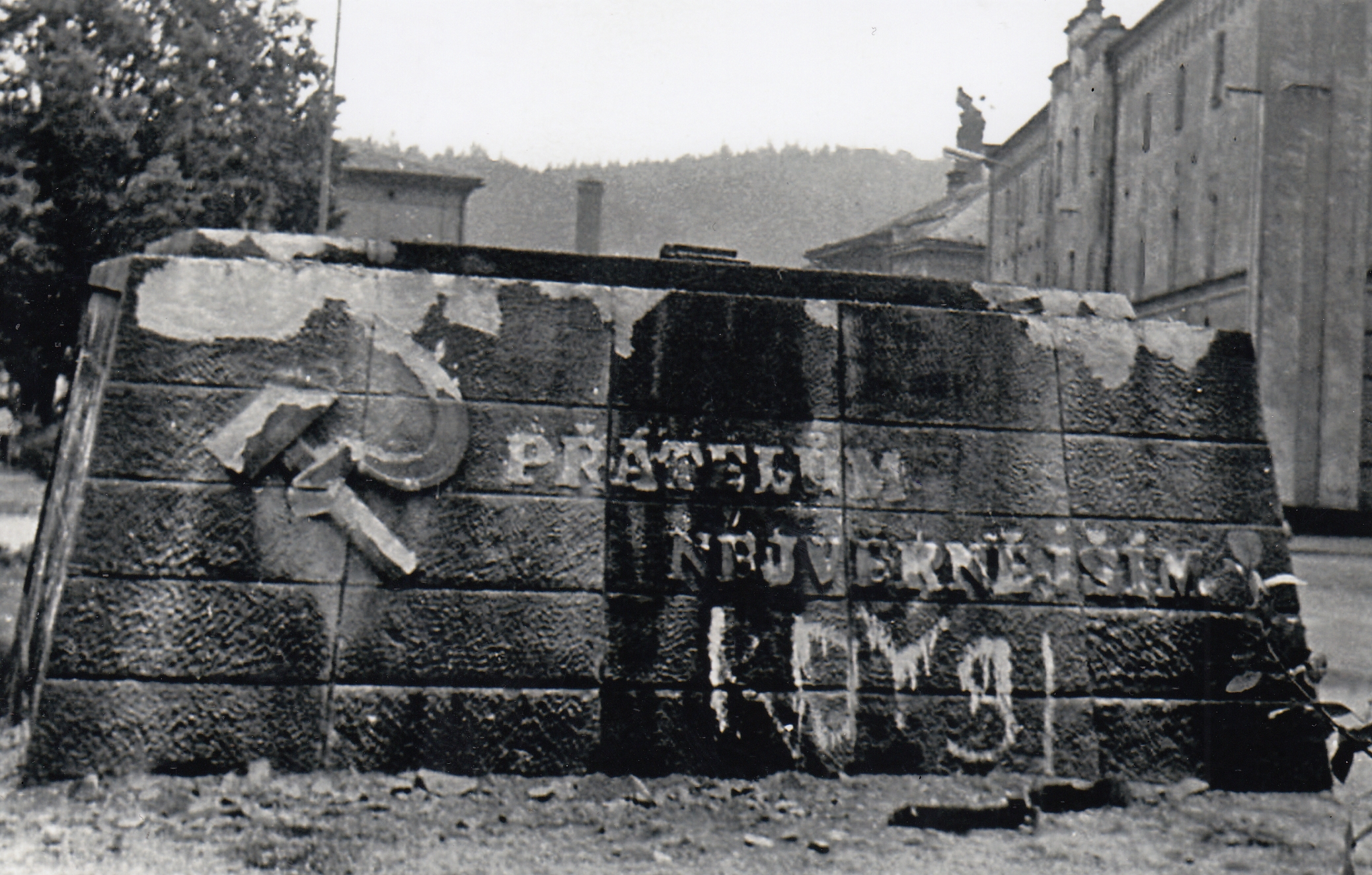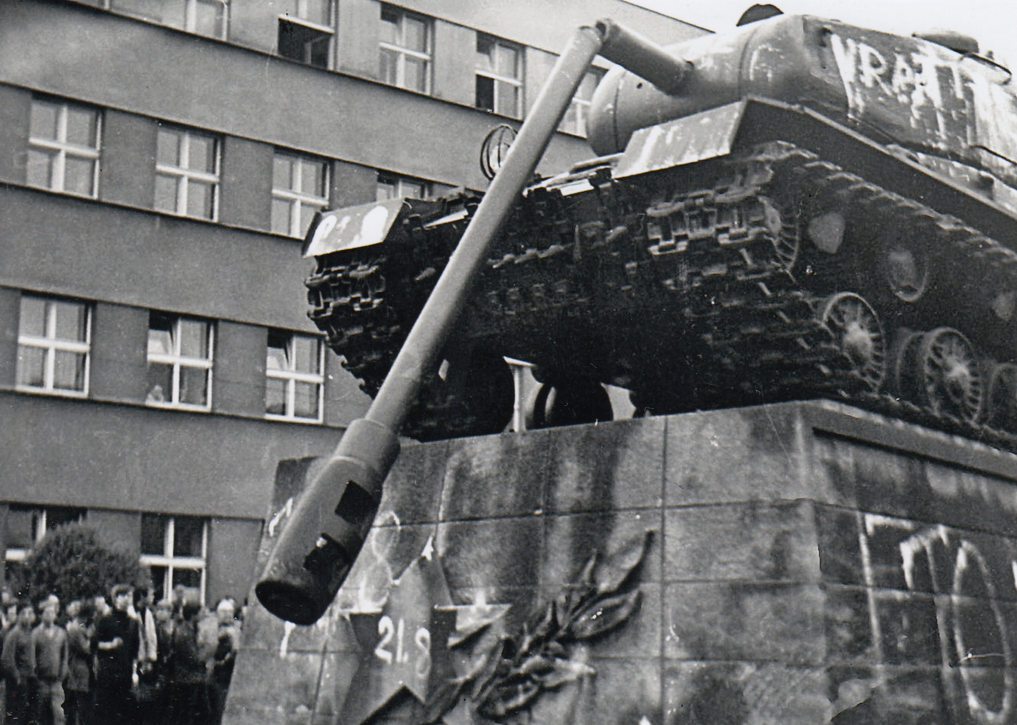 Občané tank osvoboditelů nejprve pomalovali, později uřízli hlaveň a nakonec strhli z podstavce. Okupační posádka během několika týdnů tank opravila a vracela zpět, srpen 1968