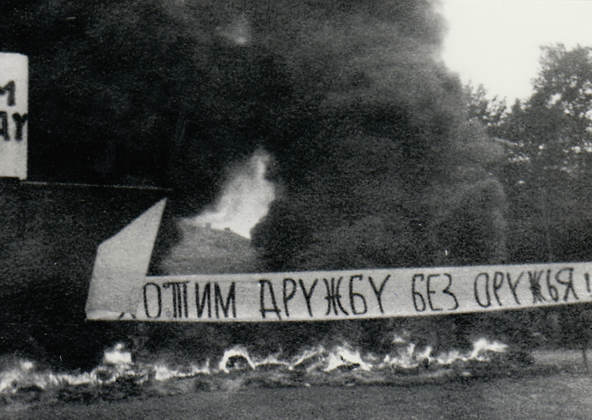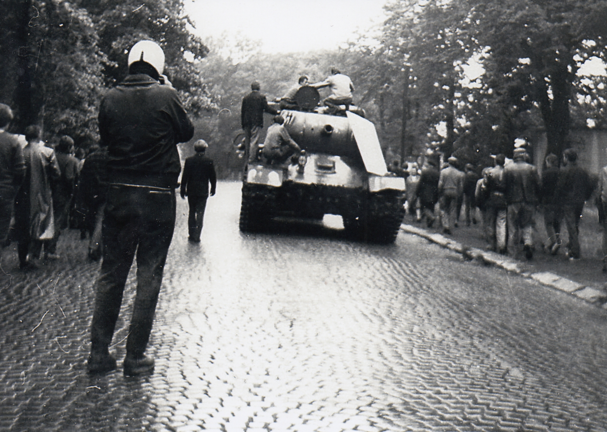 "To je taky zajímavá story. Protože ten tank stál na podstavci – Památník osvoboditelů – a v té době, když přišli [vojska Varšavské smlouvy], už to nebyli osvoboditelé, už to byli okupanti. Takže tank bylo nutné nejprve pomalovat, pak ho ponížit. To ponížení spočívalo v tom, že přišli chlapi, zřejmě s autogenem, a nařízli hlaveň. Takže kousíček směřovala tak, jak měla, a pak se lámala k zemi. To ale stačilo jen po nějakou dobu. Pak přijeli s náklaďákem a tank stáhli z podstavce. Hlaveň upadla, zlomilo se to. A tak se dotáhl pod viadukt, který je směrem ke Svobodě Na Dubu. Směrem k horám. A tam ho postavili tak, že ucpali průjezd pod viaduktem. Takhle skončil tank. To ovšem pokračuje dál. Když přišli Rusové, obsadili v Trutnově kasárna. A tank si tam odtáhli. To byla potupa, aby se takhle někde válel tank! Renovovali ho, hlaveň spravili, asi ho natřeli a řekli, že se vrátí zpátky!"