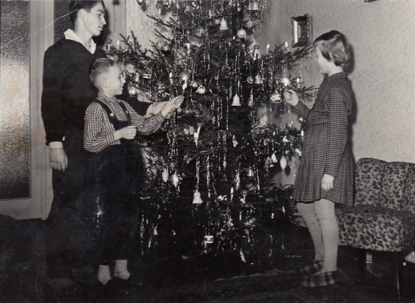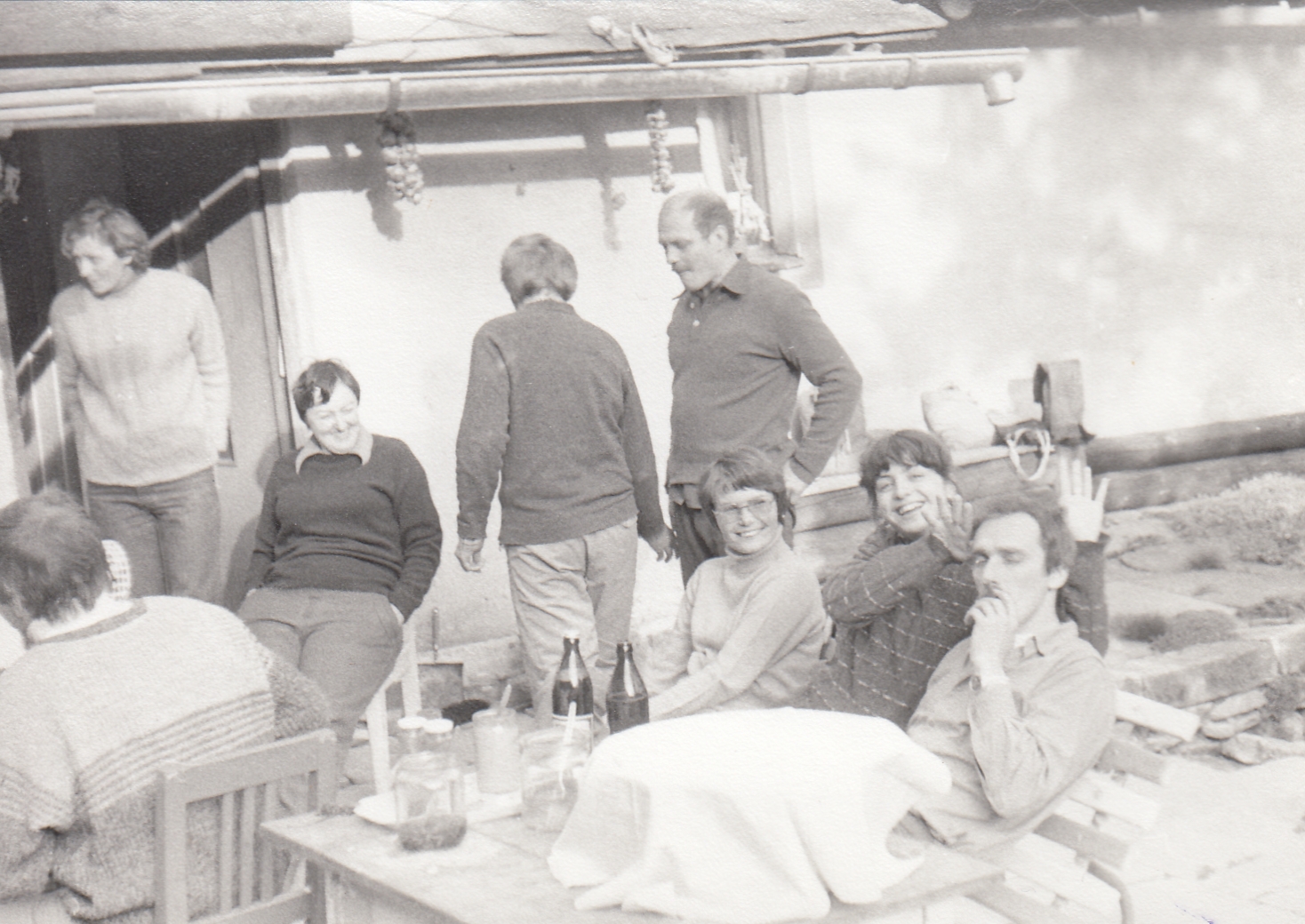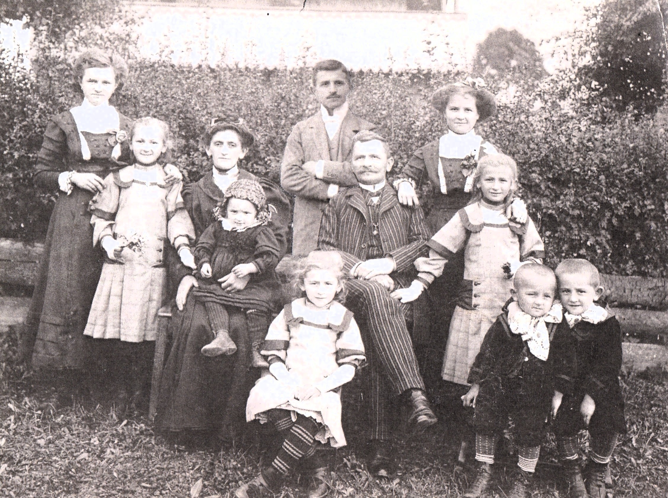 Rodinná fotografie. Uprostřed sedící pradědeček pamětníka František Kocián, pekař a starosta obce Machov; pod ním sedící holčička – Františka Kociánová, babička pamětníka, 1910