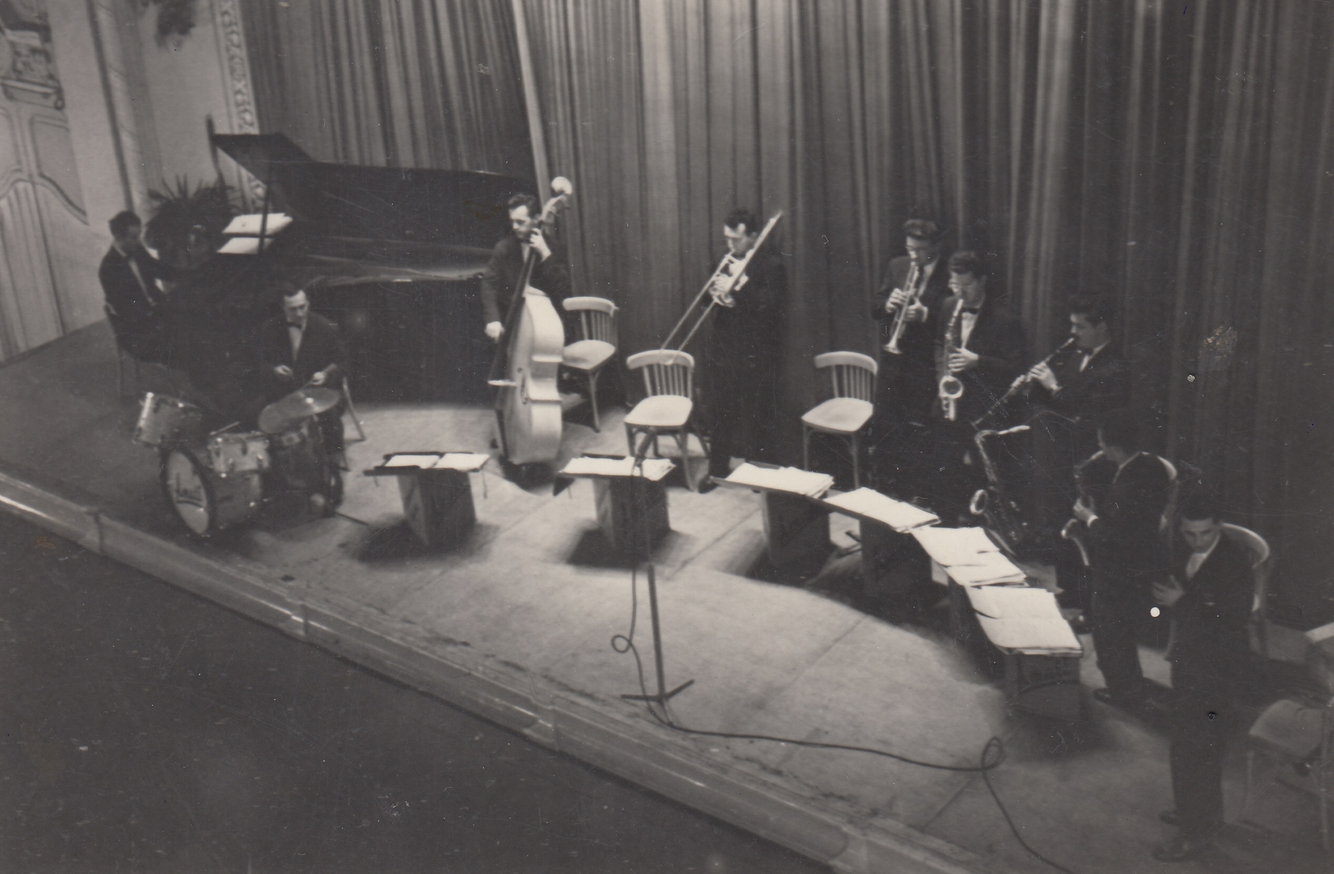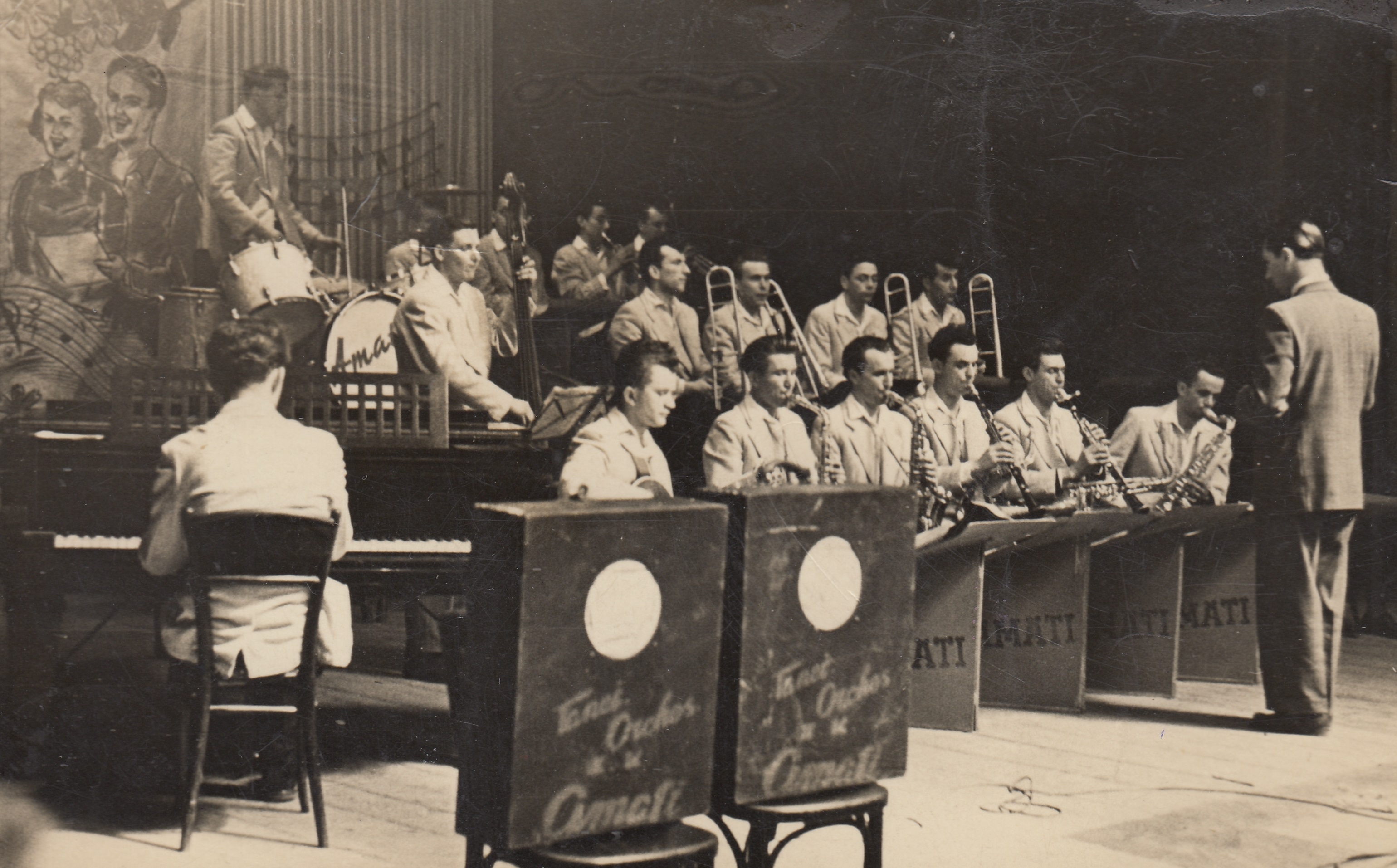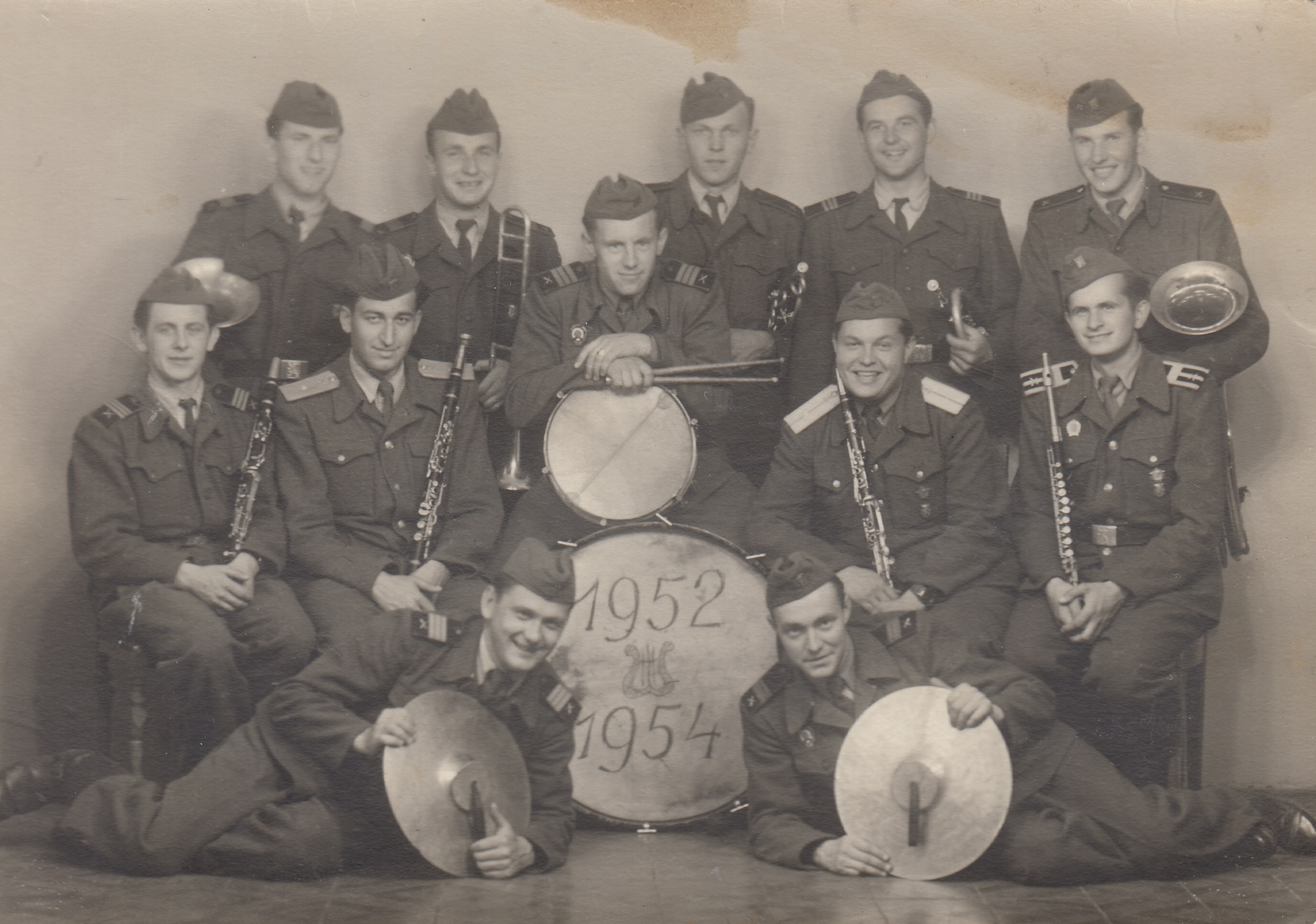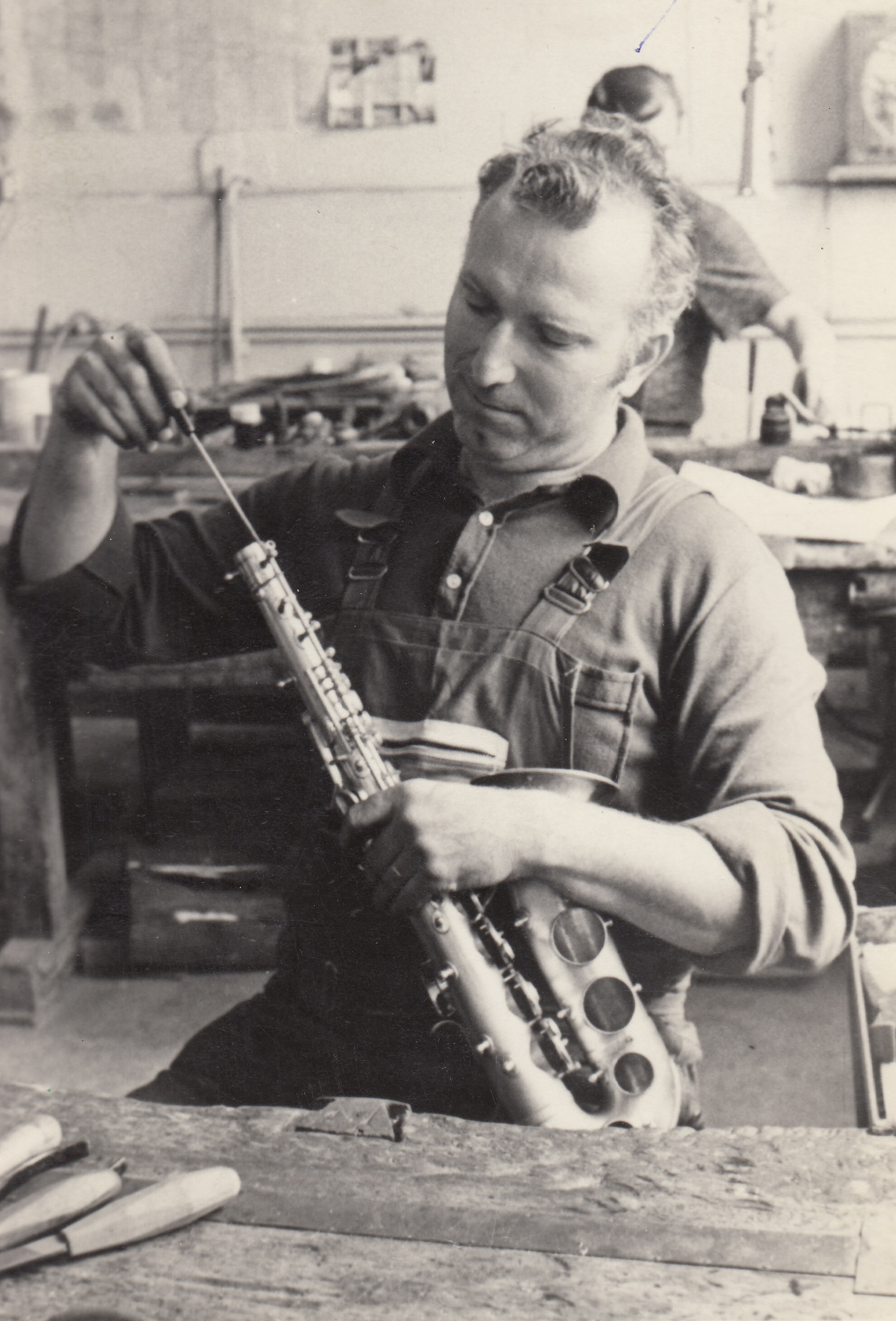 Pamětník na dílně, saxofony, 60.-70. léta, v pozadí Herbert Chlupsa