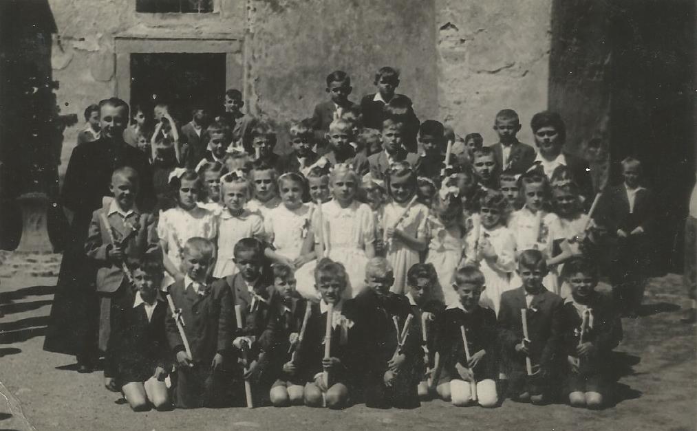 „Tak pan farář Toufar odešel ze Zahrádky v 48. roce. To mně byly dva roky, takže to já si… možná mě i křtil, to nevím, to už se dneska nezeptám, to nevím přesně, kdo mě křtil. A hledala jsem křestní list a nemůžu ho najít, takže tam bych to jako našla, protože my jsme jako farností patřili do Vojslavic, my jsme bydleli kilometr ani ne od Zahrádky, ale tam se dělily kraje a okresy.“