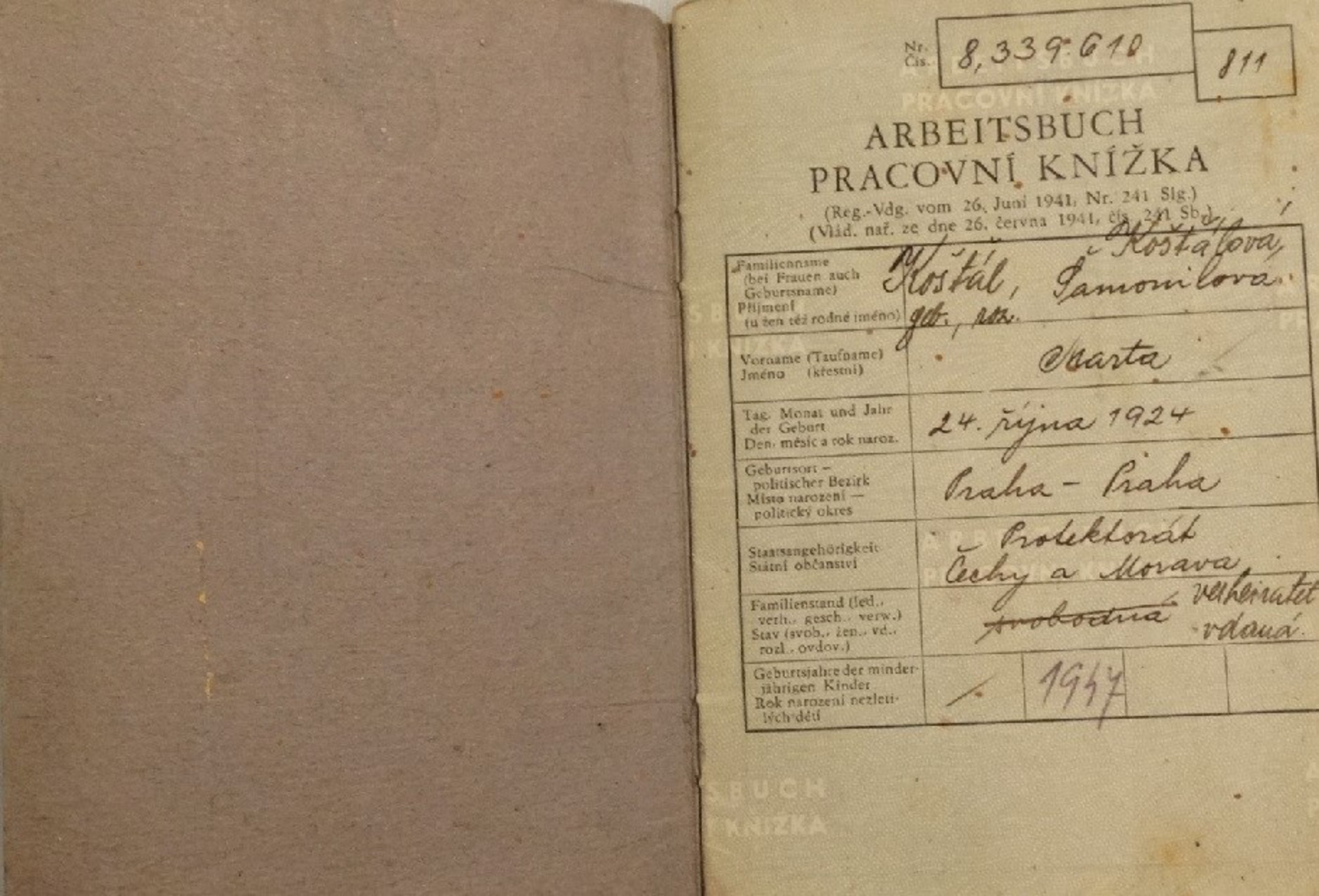 • „Já jsem také byla totálně nasazená.“ – „A kde?“ – „V Karlíně, v ČKD Dukla Karlín. A to bylo právě, tady mám pracovní knížku, támhle v tom šuplíčku, a to bylo právě nasazení. Dělaly se tam letadla Siebely, dopravní letadla Siebely. No, bylo to hrozný. Na třísměnný provoz. Nejdřív jsme se museli naučit, co máme dělat. Vrtat na plechy z toho nerez plechu. Dural se, myslím, jmenoval. Dural. Ne dural, ne. A ještě byl jeden, no já si vzpomenu za chvíli. A tam jsem byla taky až do tý války, že jo, když byl konec války. To vám můžu ukázat tu knížku, pak vám ji ukážu, já ji mám tady na kraji.“ – „To muselo být pro vás namáhavý, ta práce.“ – „Za prvé dost namáhavý. My jsme to teda nezvedali ty těžký věci, to zvedal jeřáb, že ano. Ale ta práce sama o sobě. A hlavně šest set vzduchových kladiv tam bylo. Se nýtovalo všechno. To byly nýty, který byly v mrazírně, jaksi v mrazáku, dneska se říká. V mrazáku. A musely být zmrzlé. A ty se musely propojit, ten plech těmi dirkama na tý kostře. Víte. My jsme museli vrtat ty plechy na tý kostře takhle.“
