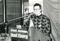 To byl zajímavý okamžik… V pátek, jako učitel, tak v pátek mi končí práce ve dvě hodiny odpoledne a mám volný víkend. Tak ve čtvrtek večer ještě byla taková situace, že teď už je Praha naše, ale ten venkov tehdy… Byly docela velké apely na to, aby teď tedy, když přijde víkend, Pražáci by se měli rozjet na venkov a tam nějak agitovat. Tak já jsem si také vyzvedl ve Špalíčku plakátky, velké štosy, měl jsem auto škodovku, vzal jsem kamaráda Honzu Meisnera a vyjeli jsme, a teď byla hlášení poslední, že Plzeň je velký problém. Plzeň! Jeďte, kdo můžete, tak jeďte na Plzeň. Takže jsme vyrazili v pátek asi ve dvě, ve všech místech po cestě jsme se stavili, rozvěsili pár plakátků, pak už se stmívalo, přijeli jsme do Rokycan, vyvěsili jsme jeden plakátek, pak že se půjdeme najíst – a normálně StB. Čtyřiadvacátého listopadu osmdesát devět jsme byli zatčeni StB. Co tady… jakou protistátní činnost… nás odvedli na stanici a plakáty nám všechny sebrali. To byl kuriózní výslech, pak nás pustili bez těch plakátů, my jsme se šli do hospody najíst a tam zrovna byl televizní přenos ze zasedání ÚV KSČ, kde to Jakeš položil, a tehdy jsme si říkali, no tak vida, teď už je další kolo za námi.“