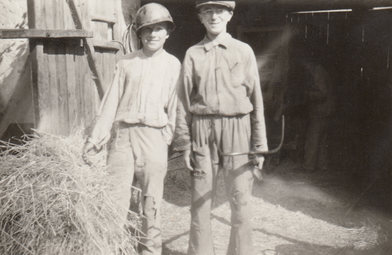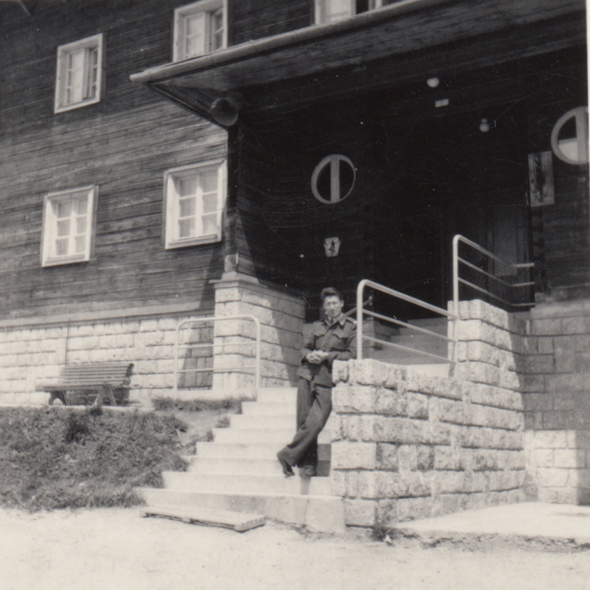 „Tadyhleta přilba, tu jsem ukořistil, když Američanům vypadla z džípu. Tak jsem ji potom pořád nosil. To je taková lehká helma, to není ta těžká ocelová, ale oni měli takový lehký helmy. Ty si nasadili, ty byly z nějakýho lehkýho materiálu, a teprve v boji si nasadili tu přilbu ocelovou.“