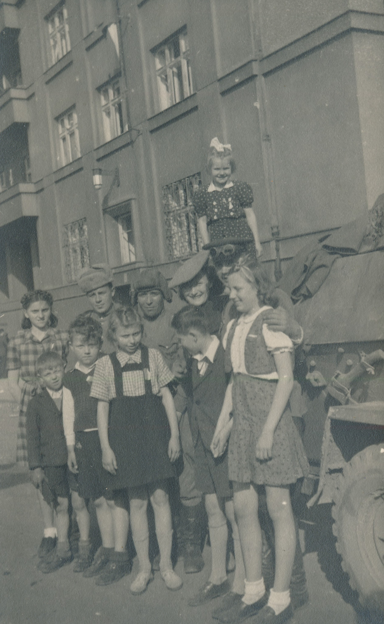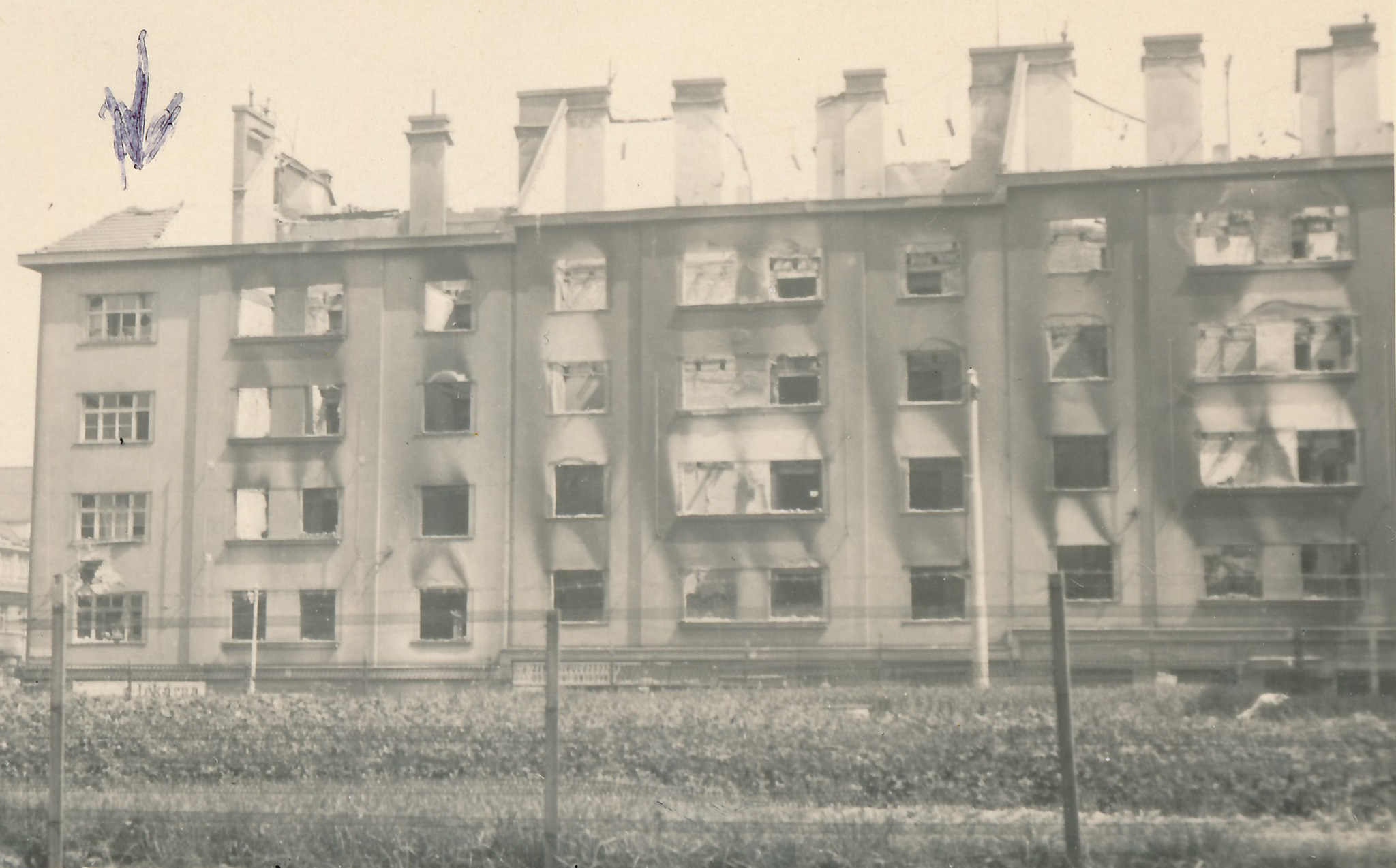 „Když začaly ty boje, tak my jsme byli všichni ve sklepě. Ten dům má devatenáct bytů, čili všechny partaje z těch osmnácti zbývajících bytů se sešly ve sklepě a tam jsme čekali, co se bude dít. Kolem to bylo samé střílení a všechno, tam bylo plno vypálených domů… Prostě zázrakem ten náš dům zůstal stát. Je to nepochopitelné. Všechny byly vybombardované. A já mám taky fotografie celých vypálených domů přímo kolem nás. Je to neuvěřitelné. A tak jsme byli teda ve sklepě, slyšeli jsme střelbu a za chvíli přilítl… Na tom Soudním náměstí byli taky političtí vězňové, a oni je všechny pustili ven. A podařilo se jednomu vězni vběhnout i do našeho domu do sklepa. A za chvíli přišli Němci a řekli: ‚Všichni muži do prvního patra! A ke zdi, zvednout ruce!‘ A měl připravený… nevím, co to bylo, prostě nějakou pušku, nevím, jak se to jmenuje, nějakou pušku a chtěl všechny postřílet. A dokonce vzal s sebou i mého třináctiletého bratra, který… a řekl, že i takovýhle kluk může střílet. Takže prohledal všem kapsy, no a už měl namířeno, že je všechny postřílí. Teď my jsme čekaly dole ve sklepě s maminkou, kdy teda spustí palba, kdy zemře náš tatínek a bratr. No a z té řady těch, co měli být odstříleni, vystoupil právě ten vězeň, kterému se podařilo dostat až k nám, a promluvil s tím Němcem – byl to šestnáctiletý kluk – a řekl, že ručí svou hlavou, že opravdu od nás nikdo nestřílel. No a dozvěděl se, že do našeho bytu v přízemí někdo prostě skočil a odtamtud střílel. Tak na základě toho oni z toho domu všechny ty muže chtěli postřílet. No tak stejně jsme čekali každou chvíli, kdy znova si pro ně přijdou.“