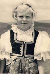 „Chodila jsem pást krávu, ale ne na pastvinu, kde pásli všichni a hráli si tam. Musela jsem na pole a po mezi tu krávu vést na řetězu, aby vypásla tu mez a napásla se. To si pamatuji živě a chodila jsem až tam, kde byla dřív pekárna. Tam jsme měli pole. A vždycky jsem si strašně přála, když byly nálety – hlásili: blíží se letka nepřátelských letadel. Měli jsme doma rádio – to byla docela vzácnost. Tak jsem si přála – a byly takové fámy, že Američani shazují krabice a jsou tam dobroty, my jsme za války neměli žádné lahůdky. Tak já jsem si strašně přála, aby jednou spadla panenka. Tak jsem si to snila, když jsem táhla tu krávu po cestě, že spadne nějaký balík a bude v něm panna.“