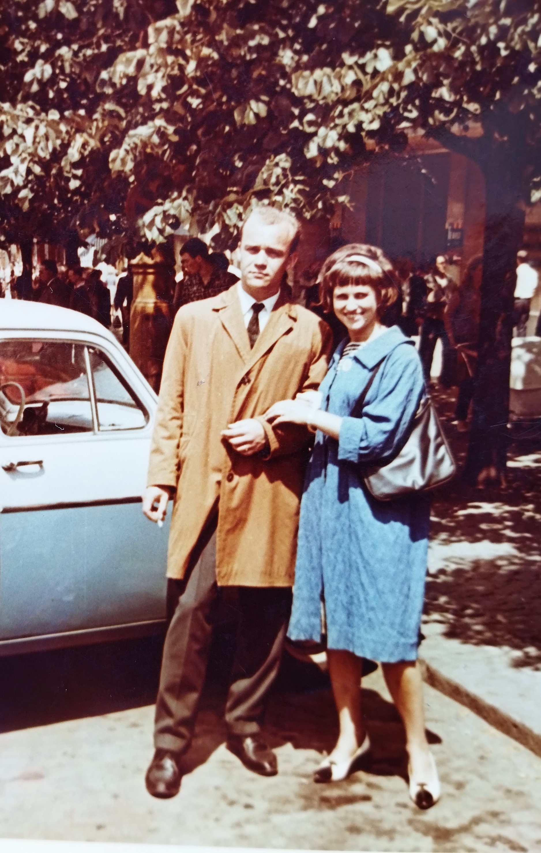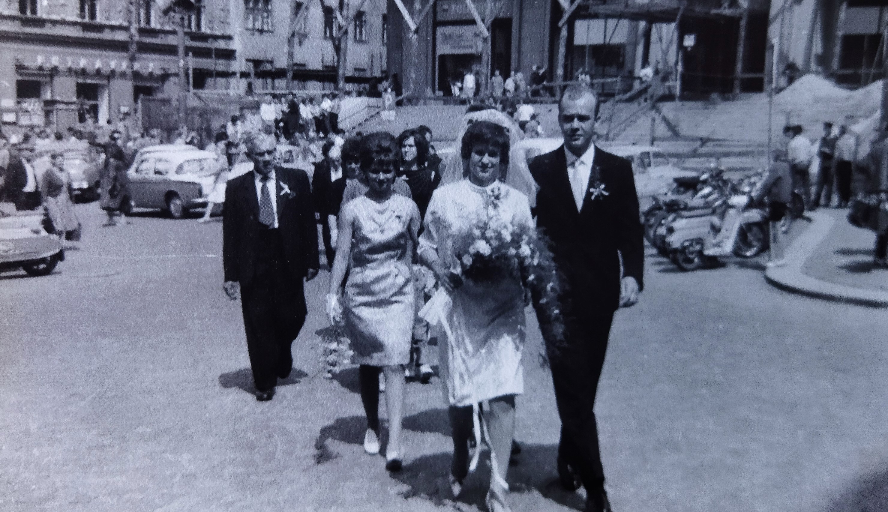 Nevěsta Jindřicha Marka Libuše 11. července 1964 se svým otcem Bohuslavem Doubravským. V pozadí je okresní sídlo KSČ, strany, jež citelně ovlivnila osud rodiny Markových