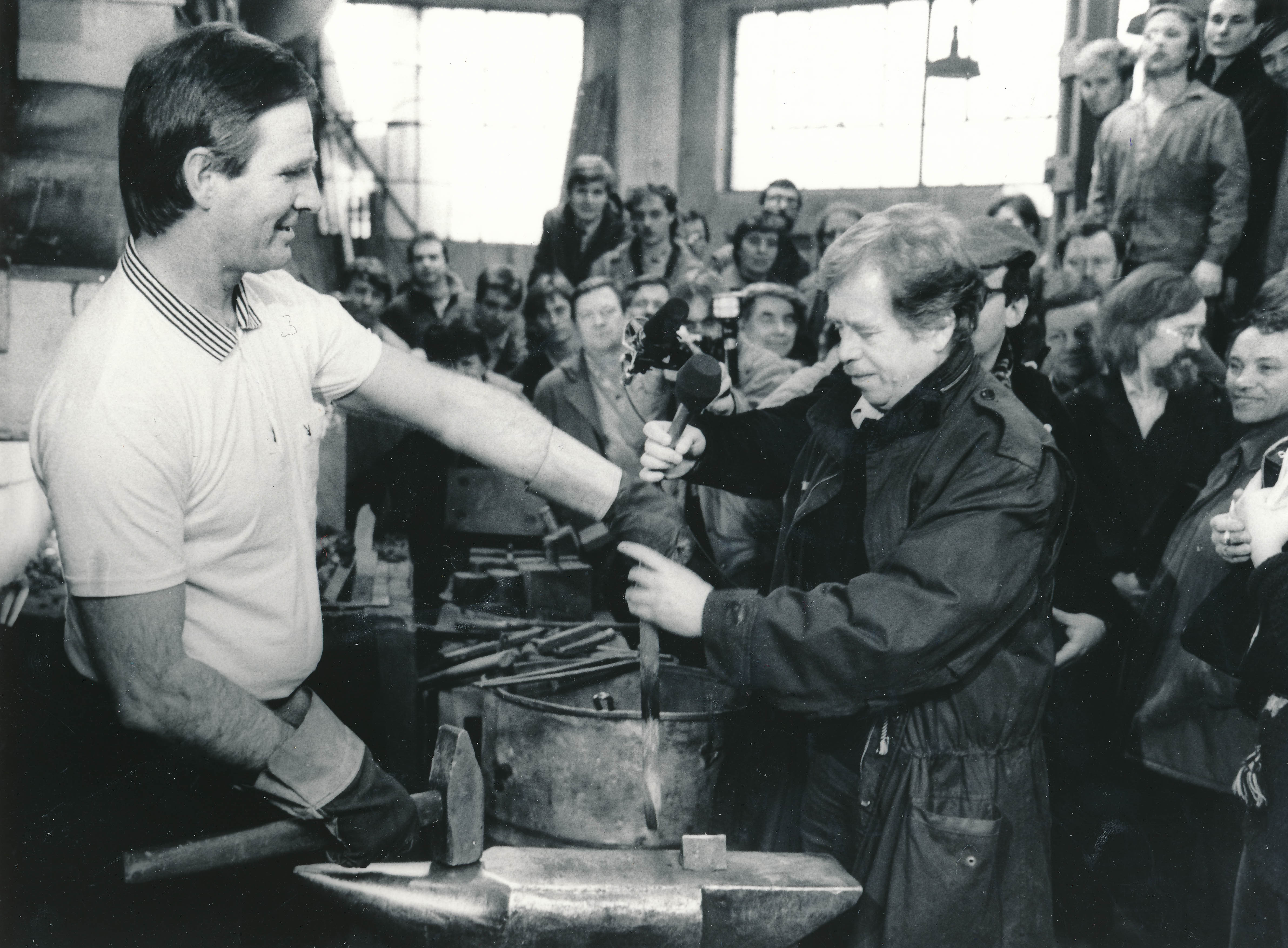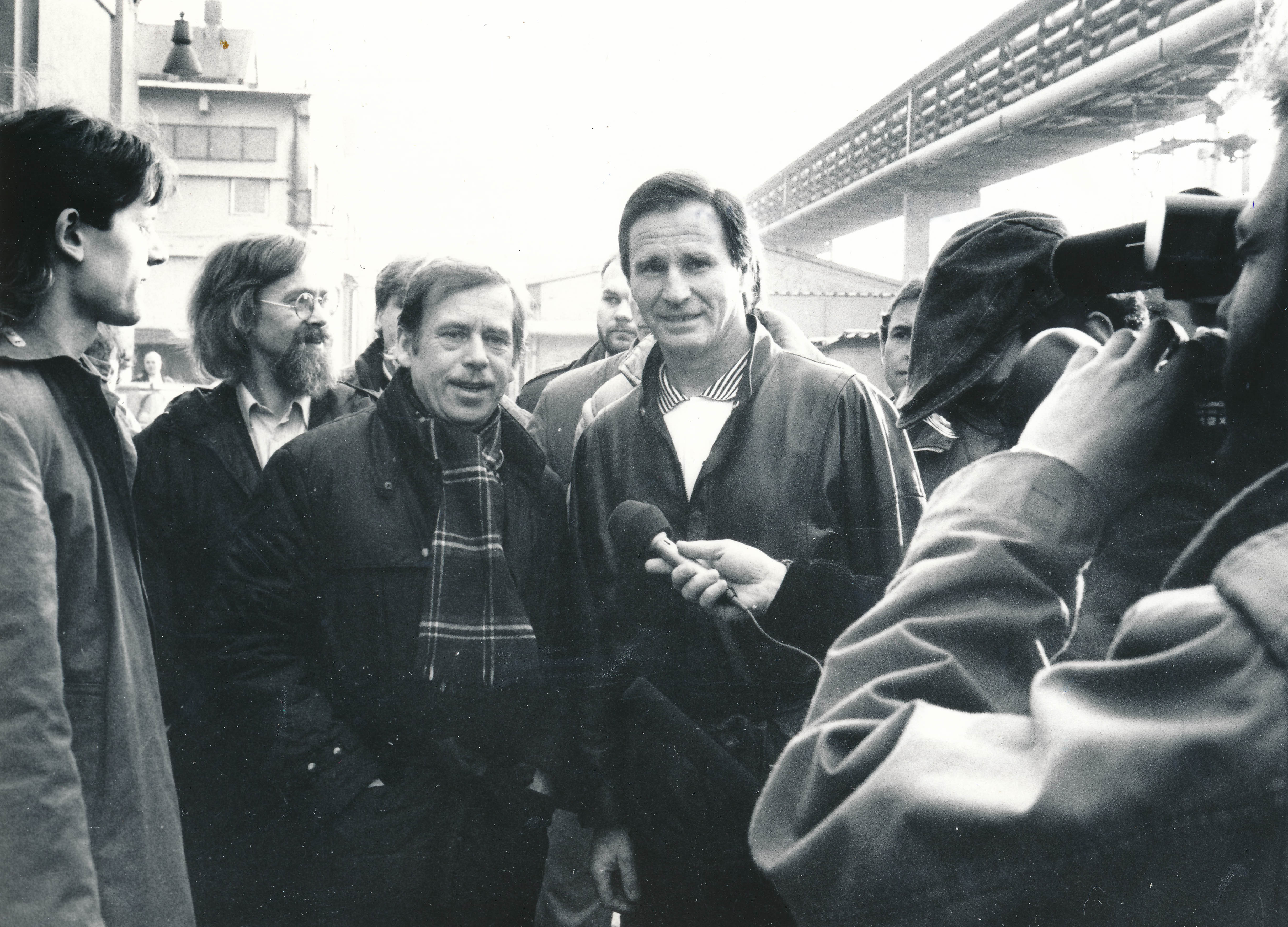 • „Druhý den ve čtvrtek v devět hodin ráno jsem přišel do Laterny Magiky, musel jsem požádat, aby pro mě přišel Láďa Lis. Protože tam to bylo velice střežené. Láďa Lis pro mě přišel, odvedl mě do kuřárny, otevřel mi dveře, postavil jsem se a podíval jsem se, co se děje. Uprostřed stál kroužek lidí, kteří o něčem diskutovali. Uprostřed toho kroužku byl takový menší člověk s nazrzlým knírkem. Protože ho všichni uctivě poslouchali, usoudil jsem, že to asi bude ten Václav Havel. Tehdy se tam radili, kdo koho bude zastupovat a podobně. Pamatuju se na Václava Bendu staršího, podle jeho vousu, který nesl známky potravy a podobně, to mě zaujalo. Když potom přišla řada na to, kdo koho bude zastupovat, zvedl jsem se a nesměle jsem ode dveří prohlásil: ,A kdo je tady za dělníky?’ Ten malý pán se na mě obrátil: ,No za dělníky tady je horník Hruška.’ A já jsem říkal, no dobrá, a kdo je tady za fabriky, za tovární dělníky?’ ,Za ty tady není nikdo.' A dál říká: ,A kdo jsi ty?' Tak jsem se představil, kdo jsem, a říkám, já jsem vám přišel nabídnout, že kolem třetí hodiny sem přijde velký průvod z ČKD, odhadujeme to zatím na pět až sedm tisíc lidí.’ Nastalo naprosté ticho, pan Havel se na mě obrátil a říká: ,Co to povídáš za nesmysly, my tam posíláme studenty, delegace, a vy je vyhazujete z fabirky. To říkáš, že jsi z ČKD?’ Já říkám: ,Ano, jsem z ČKD.' Tehdy mě napadla taková věta, která mě odstartovala do té nejvyšší politiky. ,Pane Havel, už jste někdy viděl, aby děti poroučely tátům, co mají dělat? Já ještě ne. Já vám chci říct jedno: Vy budete pořád chodit dávat kytičky k tomu sv. Václavovi. Ono to hezky vypadá, ale oni vás budou zavírat. Nemá to koncovku. A já jsem vám ji přišel nabídnout. To budou ty fabriky, který mají tu ekonomickou sílu, můžou něco rozhodnout.’ Koukal na mě nevěřícně, ale potom povídá… Byla tam tenkrát Monika Pajerová, Mejstřík, Bubník, ti se ke mně vrhli. Já říkám: ,Nepotřebuju nic, jenom až se ten průvod bude blíž, abyste udělali průchod, aby ten průvod mohl tím čelem vejít před ten Melantrich.’ ,To zařídíme.’ Pak bylo samozřejmě všechno jinak.“
