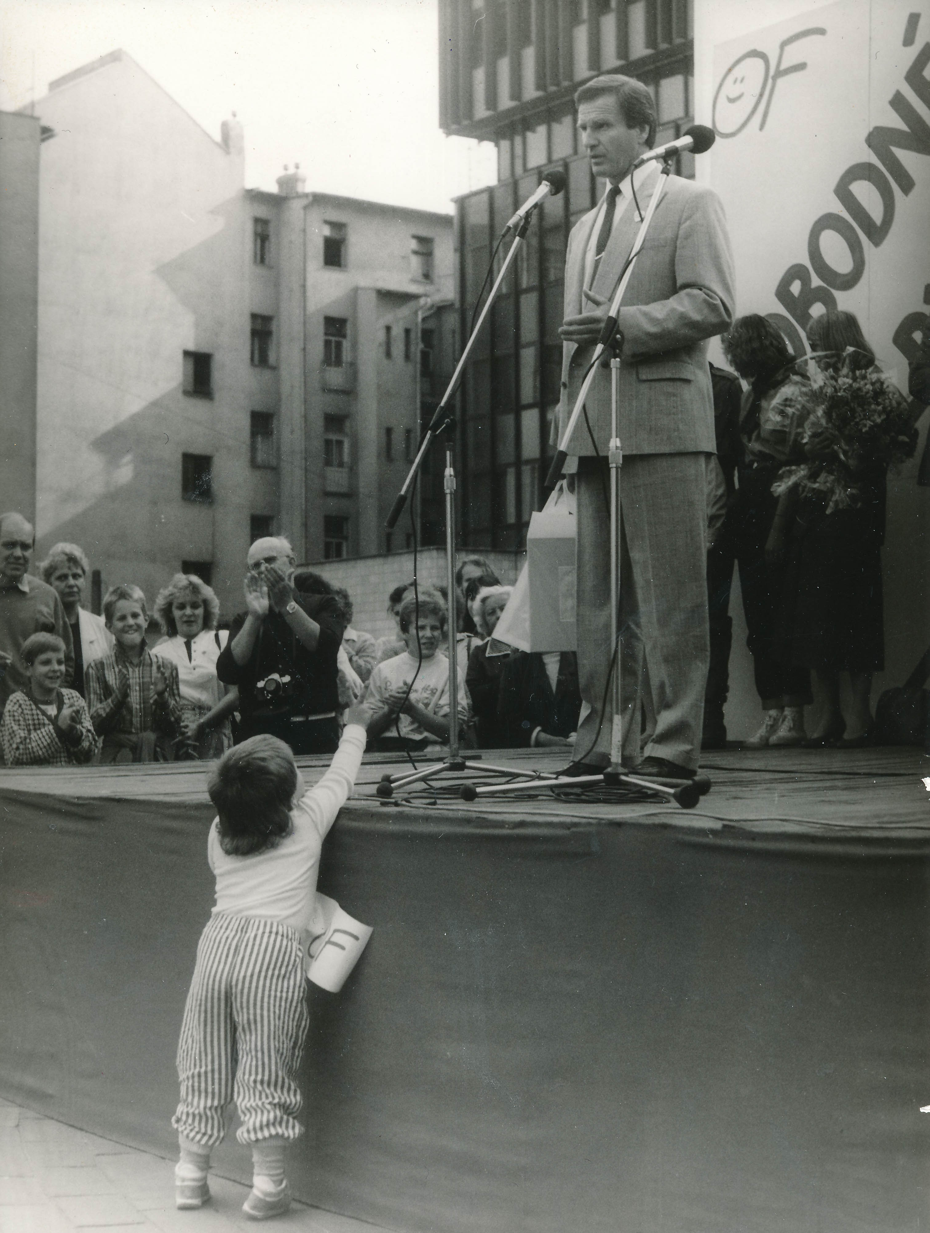 Petr Miller hovoří jako zástupce dělníků, 1989