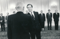 • „Po Letné jsem přišel poměrně unavený domů, většinou jsem to trávil v Laterně Magice, později ve Špalíčku. Ale tentokrát jsem měl trochu volna. Bylo asi 8 hodin večer, zazvonil telefon. Zvednu ho a na druhé straně se ozvalo: ,Jsme tady, sestavujeme vládu, navrhli jsme tě na ministra. Dáme ti dvě hodiny na rozmyšlenou, do dovu hodin nám řekni, jestli to bereš.’ A zavěsil.Obrátil jsem se na manželku, svou první ženu a říkám: ,Někdo si ze mě dělá blázny, představ si, že volá a ptá se, jestli chci být ministrem.’ Deset minut bylo ticho a za deset minut volá znovu: ,Zapomněl jsem ti říct, že to je ministerstvo práce a sociálních věcí. ‘ A znovu zavěsil. To už začínalo být vážnější. Poznal jsem, že to je Zdeněk Jičínský. Říkám si, ježišmarja. Nevěděl jsem, jak reagovat. Začal jsem přemýšlet, co to ministerstvo obnáší, kde sídlí a co dělá. V telefonním seznamu jsem si našel, že sedí na Palackého náměstí. Listoval jsem v novinách, abych zjistil, čím se má zabývat. Říkal jsem si, ministerstvo práce a sociálních věcí, to bude sociálno, ale mzdu vypočítat umím, jako parťák jsem počítal mzdy v kovárně. Uvidíme, co bude. Ráno jsem přišel do krizovýho štábu, tam byl veliký papír - návrhy Občanského fóra na ministry. Václav Klaus, Vladimír Dlouhý, Petr Miller. V tu ránu jsem viděl, že přestává legrace. Je potřeba postavit se k tomu čelem nebo utéct. A já nejsem ten, který by utíkal nebo by nebyl schopen vžít se do nové situace. Řekl jsem, ano, dobře, uvidíme.“