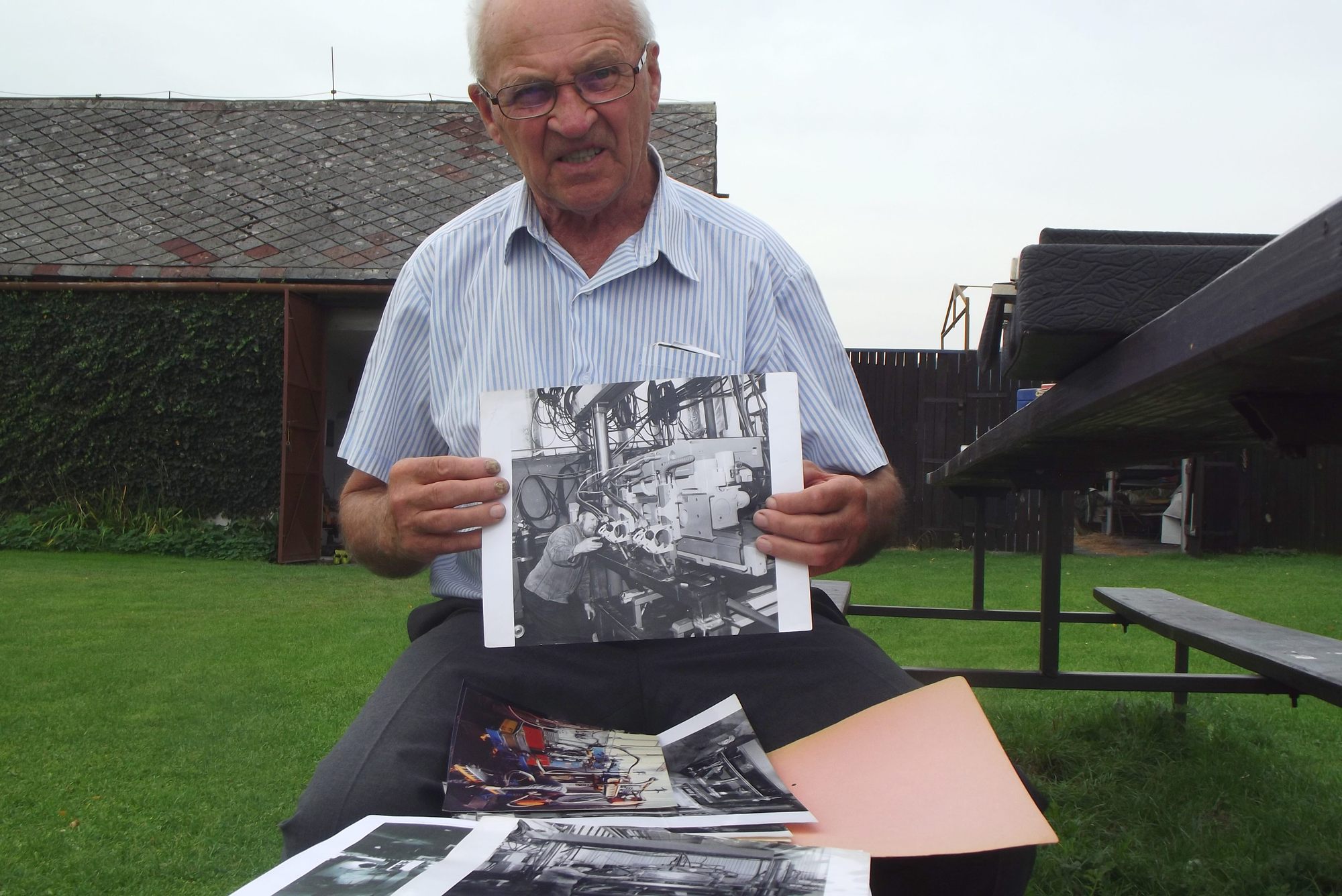 • „Nějaký Standa Tobola, to byl straník, ale férový chlap. A zpočátku... co vám mám říkat. Před pěti lety umřel a já jsem tam byl u něho asi dva měsíce předtím a on mi říkal: ,Ty, já jsem se vůči tobě choval hnusně, odpusť mi to. Já jsem tě považoval za nepřítele národa. Ty jsi byl Němec.‘ No ale potom skutečně jsme spolu spolupracovali. To byla doba! A ten vývoj. Přišla ta komise (z Vítkovic), my jsme jim to předvedli a komise si říká: Propána, vždyť to nejde. Ale my jsme řekli, že jim ještě něco ukážeme. Odhrnuli jsme záclonu a vytáhli jsme ten náš výtvor. Během tří týdnů jsme vytvořili takový trámec, ten jsme nasadili na korbu a udělali jsme jim svary jako malované. A oni na to zírali... A řekli, ať zatím pokračujeme. A já jsem potom poslal řediteli dopis, ve kterém jsem navrhnul, že bych to dělal, ten vývoj, a že požaduji takové a takové podmínky. A když byla výrobní porada všech vedoucích u ředitele, on to tam přečetl a řekl: ,Dejte mu zelenou.‘ A od té doby se to změnilo. I když jsem byl nestraník a někdy jsem do toho zarýpal, tak jsem neměl tak špatné podmínky. Já jsem ten vývoj dělal prakticky od roku 1963. Ale to jsem dělal v rámci těch důlních vozů - housenkovou dráhu, ty různé klaničáky, prototypy stavebních vozů... čili už jsem v tom byl. No a potom v roce 1980 mi dokonce přidělili dílnu. byla dvanáctkrát osm metrů, ale měla jednu nevýhodu. Byla tam v zimě zima. Byla na konci větve topení a tam to netopilo.“