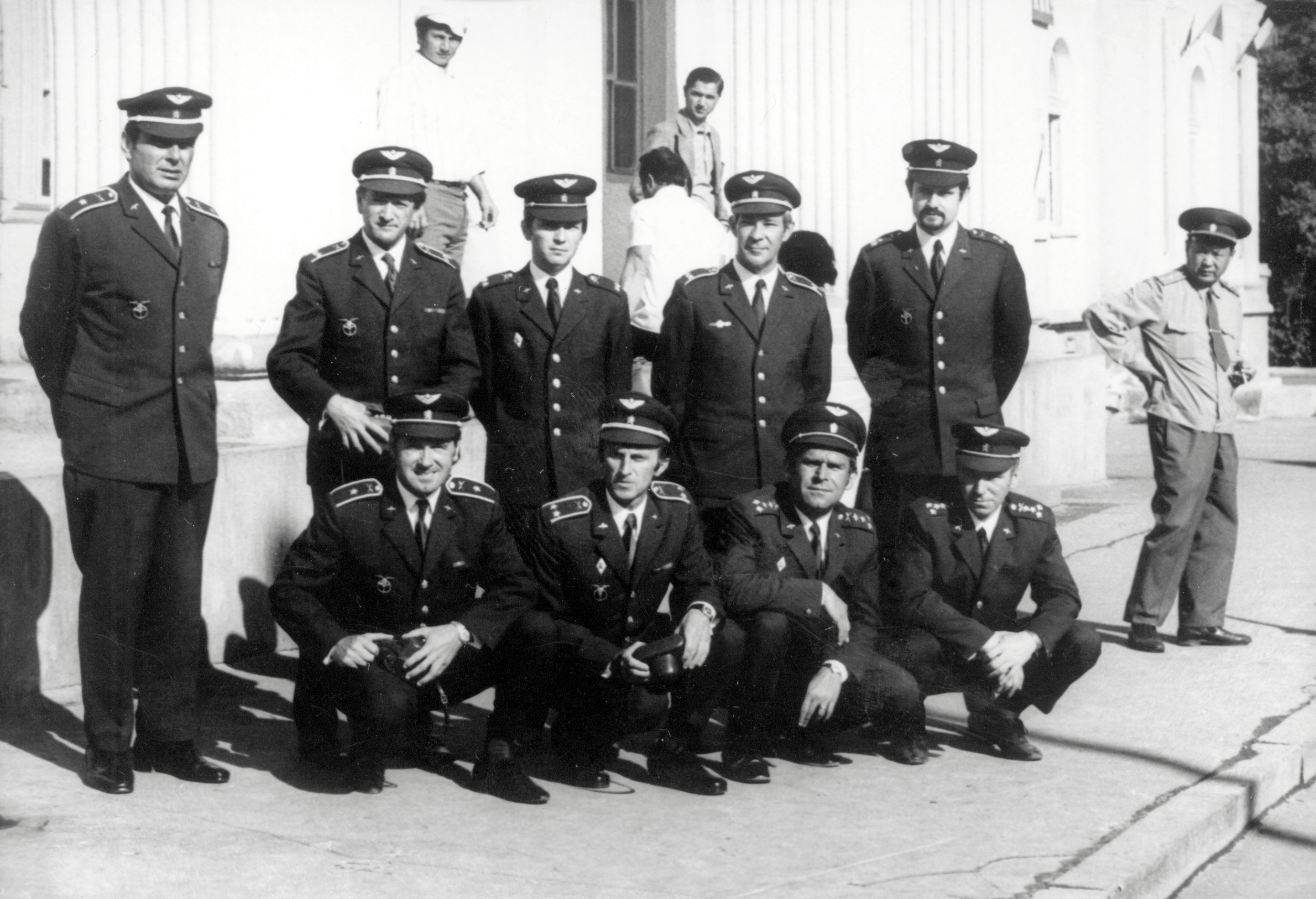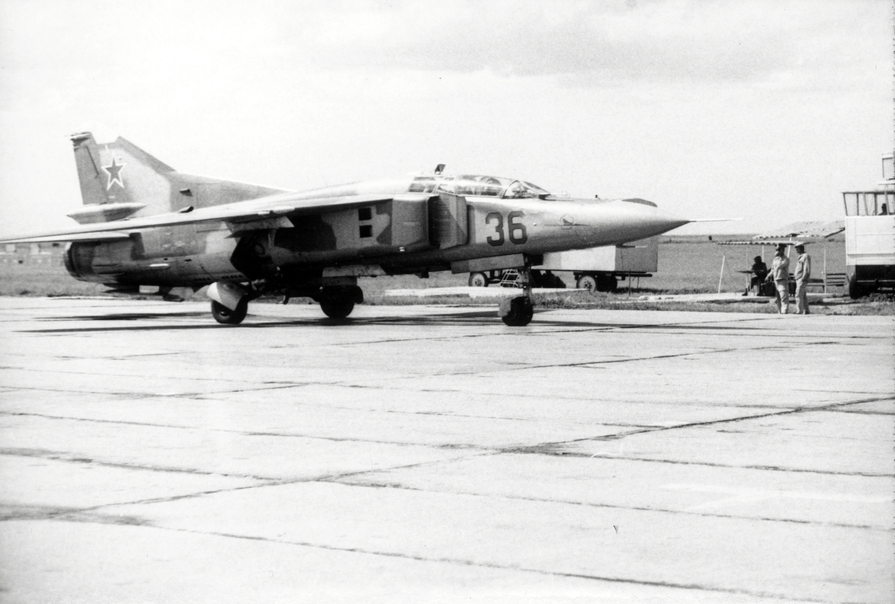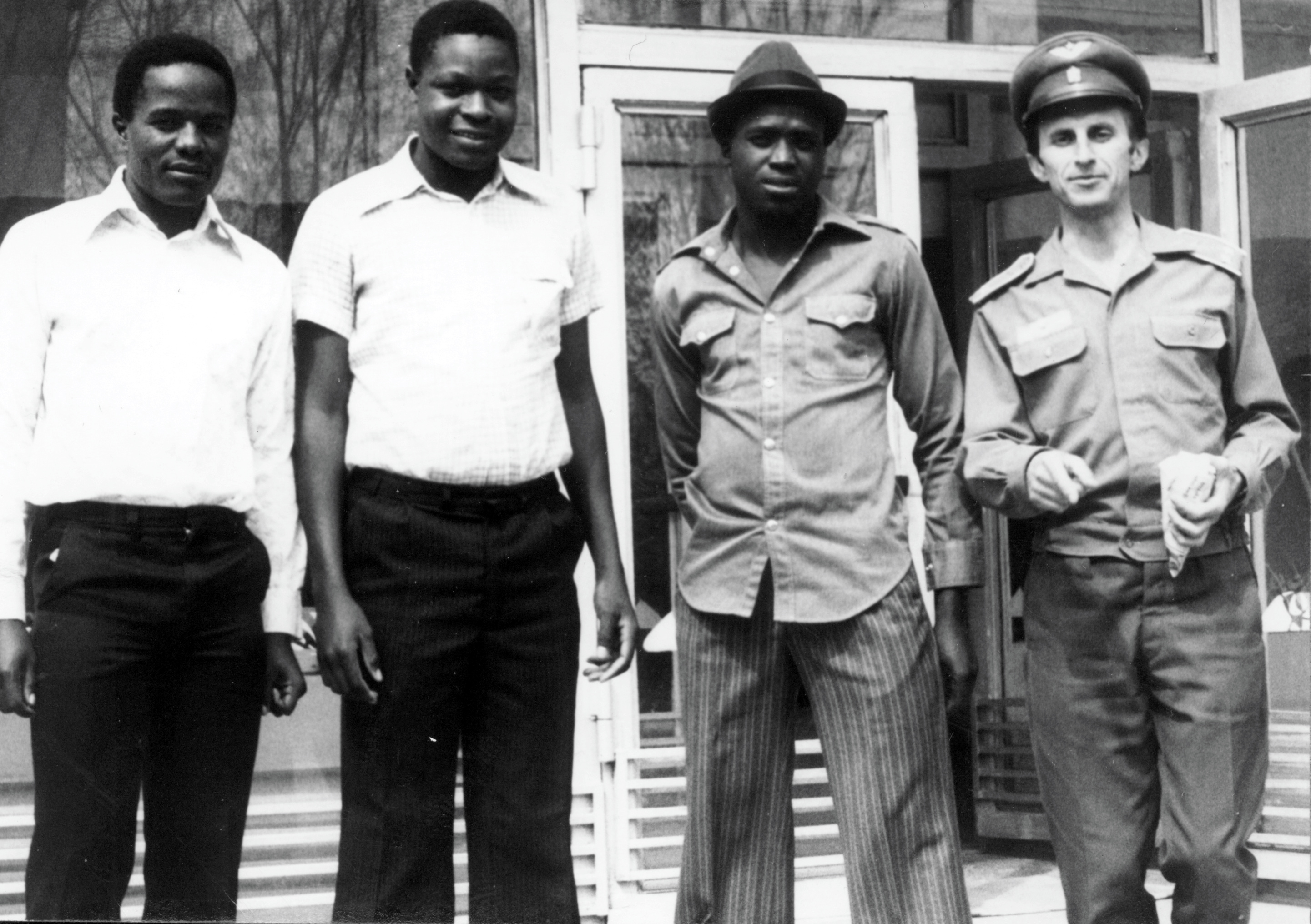 Zleva technik Ladislav Zasadil a velitel letky České Budějovice František Skalický se sovětskými důstojníky, výcvikové středisko SSSR Kazachstán, druhá polovina 70. let