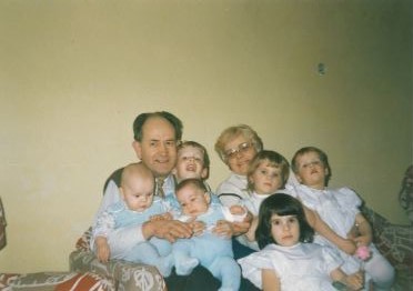 Iva Ondráčková s manželem Františkem a s nejstaršími šesti vnoučaty, (od Andrey děti Bianka, Ariela a Kamil, od Noely děti Daniel, Laura a Marcel), Zlín, jaro 1987