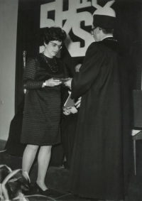 „Tehdy umřel soudruh Generalisimus Josef Vissarionovič Stalin. Tak, to tehdy bylo hrozné, protože vyváděli tak, že soudružky plakali. Vyváděli velice. A já jsem, bohužel, musela stát u jeho busty čestnou stráž, museli jsme se střídat, což byla pro mě asi nejvyšší potupa mého života. A potom bylo shromáždění a muselo se zpívat: ‚V před soudruzi, vzhůru soudruzi.‘ A (stalo se, že asi) klavíristka udala špatný tón, tak jsme to nevytáhli a nějak to bylo zesměšněné. Klavíristka, žákyně, dostala trojku z chování. A vyhodili ji ze školy. No a my ostatní? To se pořád vyšetřovalo. To byl takový neskutečný teror.“