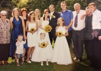 Iva Ondráčková s rodinou své mladší dcery, když se ženil vnuk, (je zde dcera Noela, její manžel Pavel, jejich děti Daniel, Laura, Marcel, Roman, Olivie, Natálie a Eliana, Danielova novomanželka Eva, Lauřin manžel Bobby s jejich dětmi Amy a Samuelem), Zlín, 16. července 2011