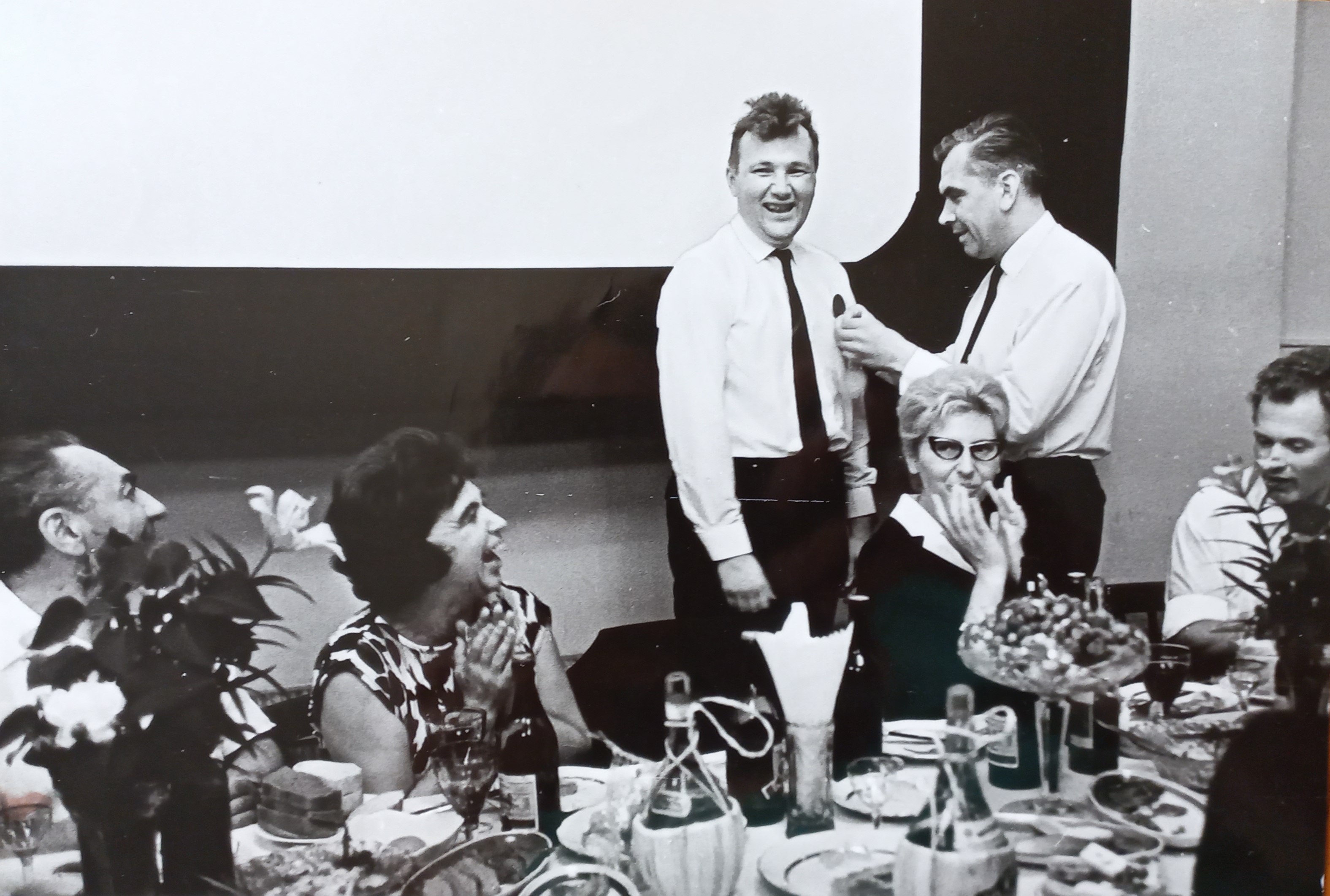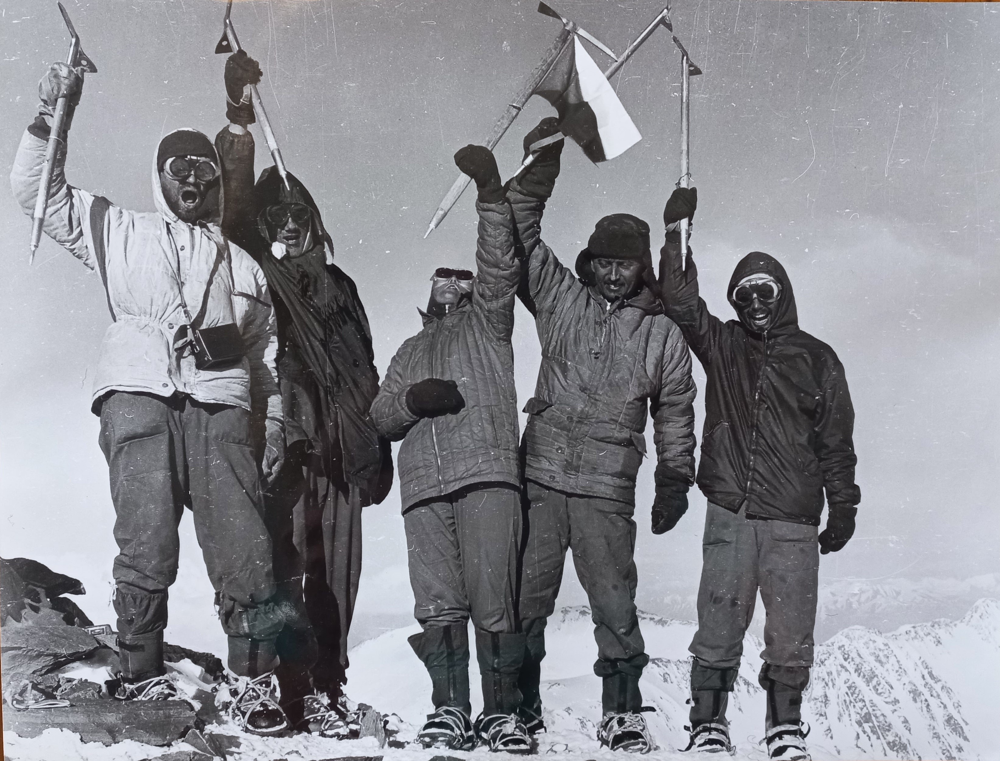 František Lehár, výstup na Pik Lenin v Pamíru, jásání na vrcholu. Zleva Rosťa, Franta, Marta s vlajkou, Mirek a Pavel. Síly stačily právě na jeden snímek. Poslední nádech,1965