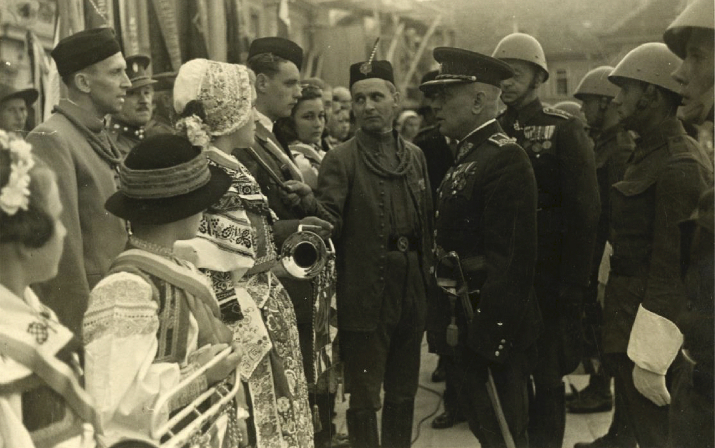 Nymburk 1938. Předání stříbrné fanfárové trubky. Plukovník Zdeněk Vltavský v přilbě, částečně zakryt brig. gen. Čihákem