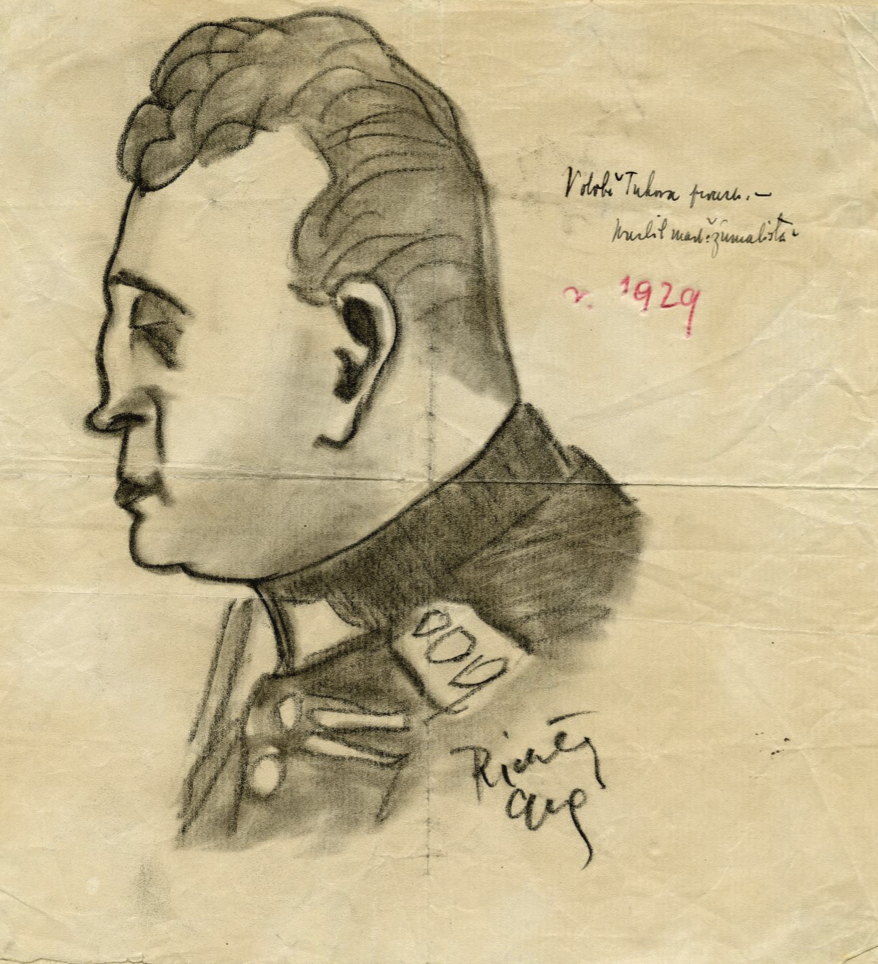 Karikatura pplk. gšt. Zdeňka Vltavského – vojenského znalce v procesu s Vojtěchem Tukou