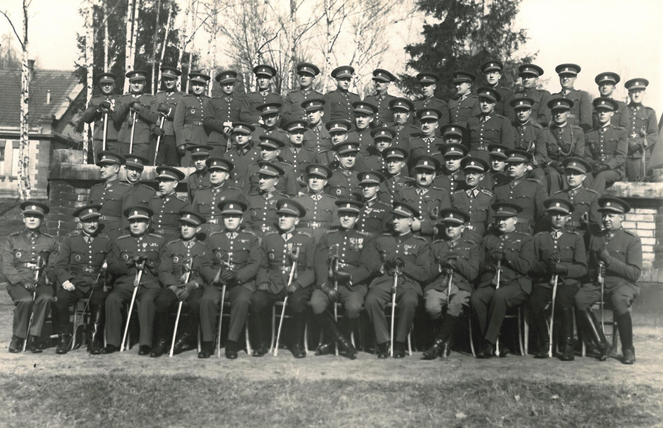Poslední důstojnický sbor PÚV-1 v Milovicích. V první řadě šestý zprava velitel plukovník Zdeněk Vltavský. Soukromý archiv Olgy Pešoutové