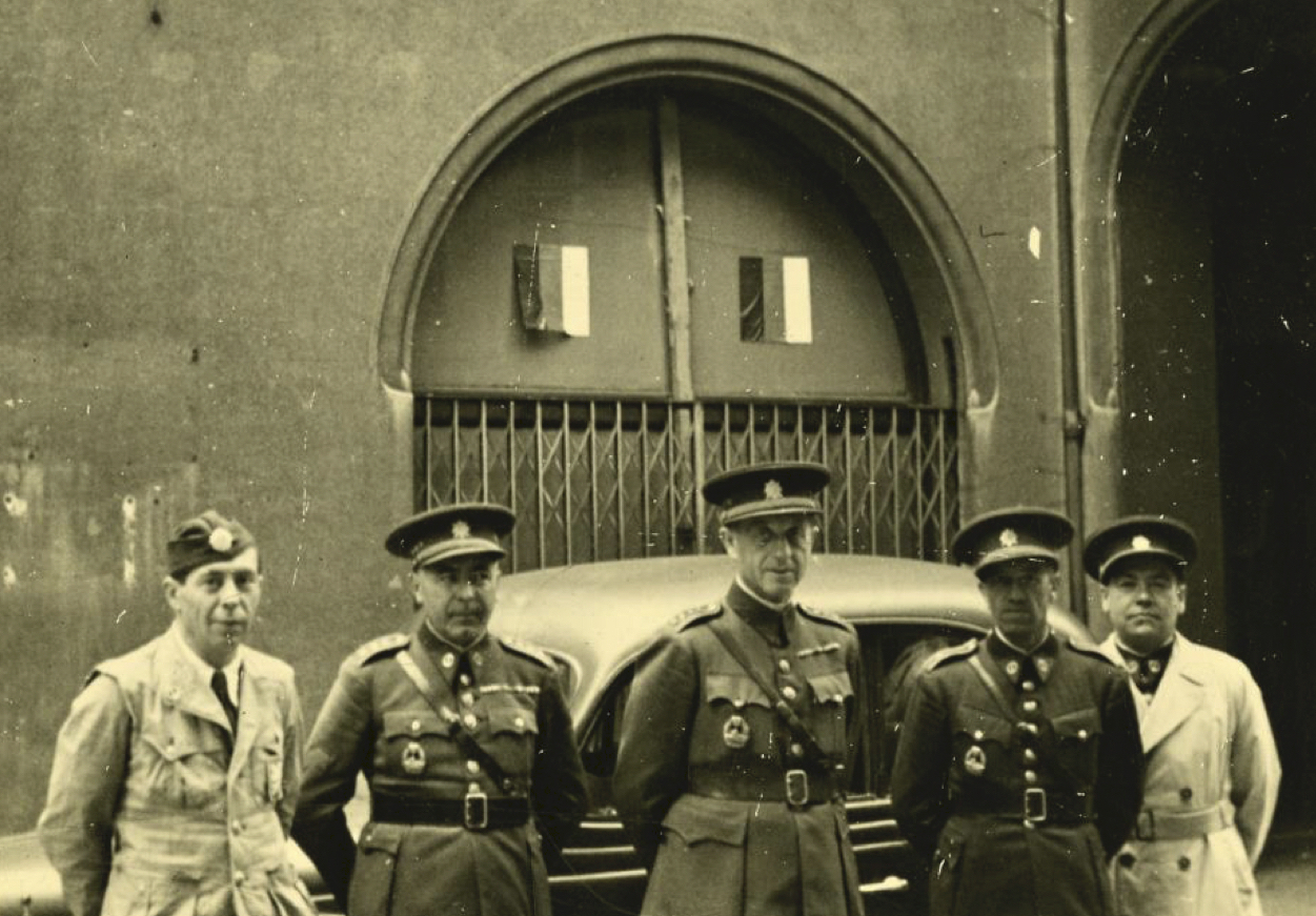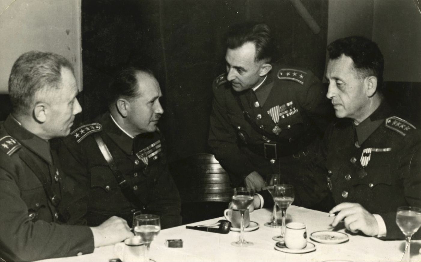 Skupina organizátorů Pražského povstání – zprava plk. gšt. Zdeněk Vltavský, pplk. gšt. František Bürger, plk. gšt. František Vejmelka, pplk. gšt. Viktor Dyk. Fotografie: Organizátoři Pražského povstání v květnu 1945