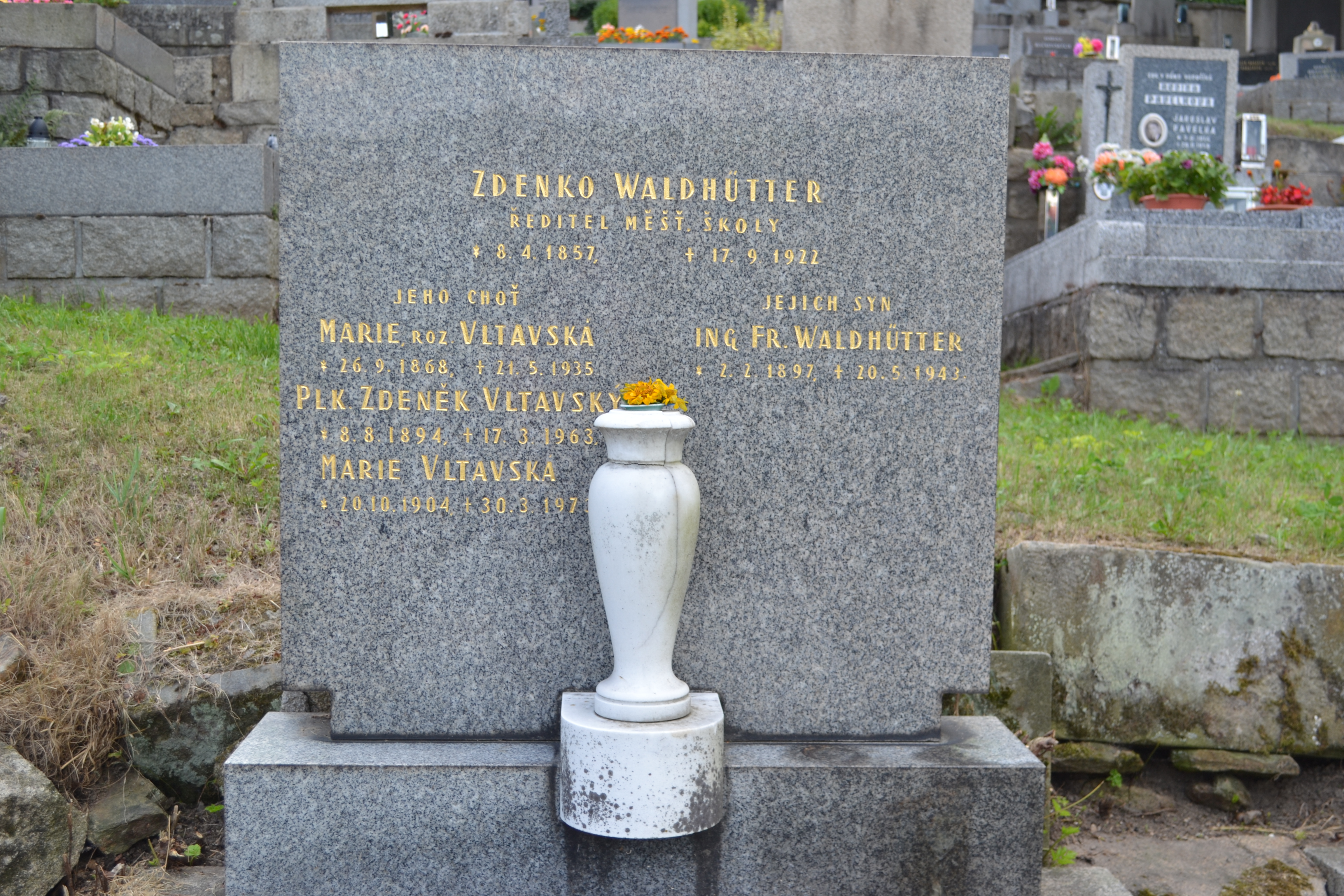 Rodina Waldhütterových v roce 1910 – v popředí otec Zdeněk Waldhütter a jeho žena Marie, rozená Vltavská, Zdeněk Waldhütter- Vltavský vpravo vzadu, vedle něj jeho bratr František