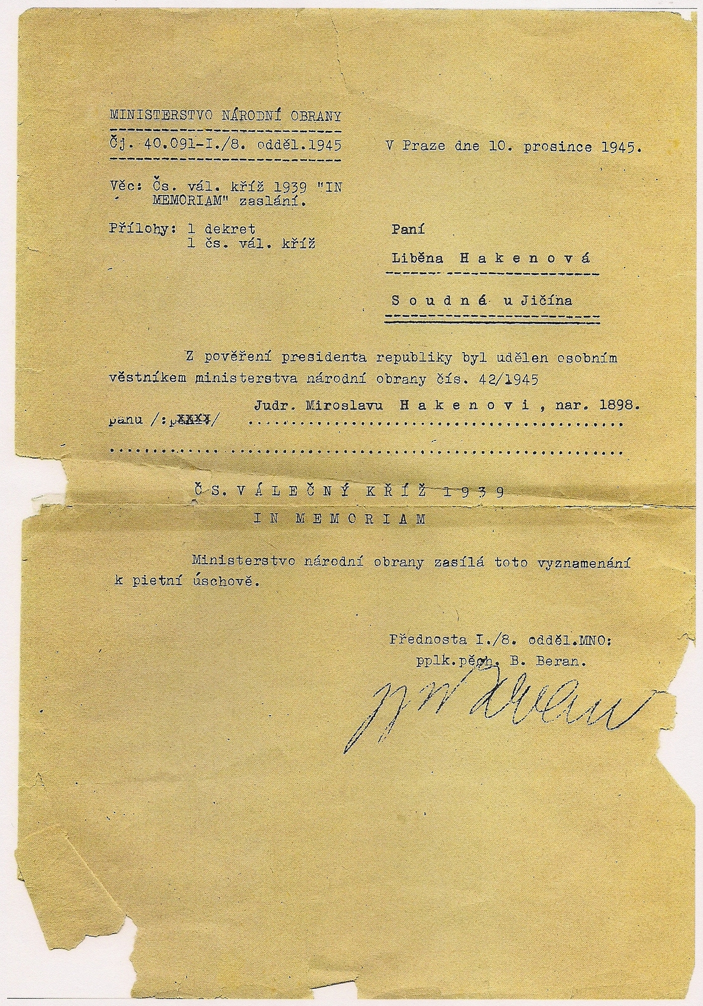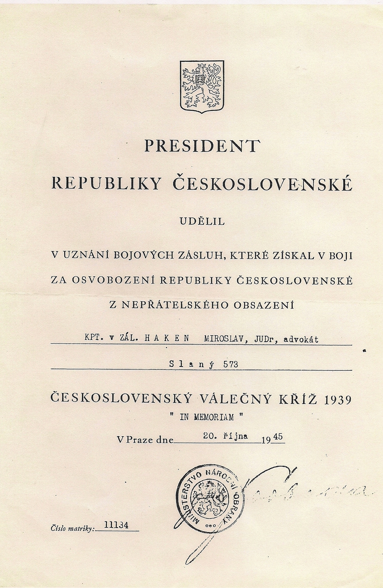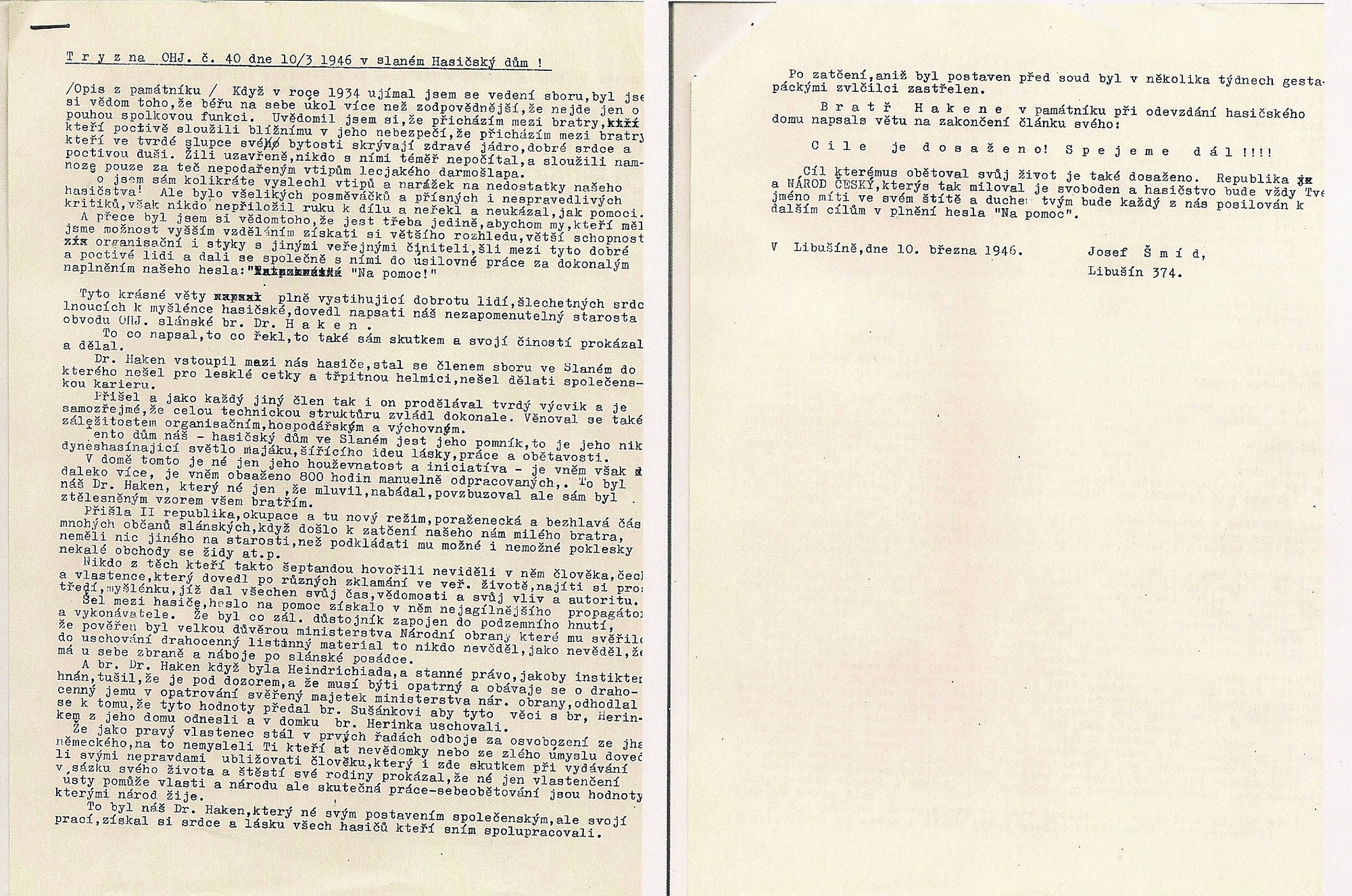 „Tátu sebrali 24. června, právě na můj svátek, docela jasně si to vybavuji. Právě v té místnosti, kde pro něho přišli, nyní spím. Maminka pořád jezdila do Petschkova paláce, myslela, že za tatínka bude nějakým způsobem prosit a žádat, aby ho propustili. Až v srpnu jsme se dozvěděly, že byl už za týden (pozn. 30. 6. 1942) po uvěznění popraven. Chtěla bych se podívat do Kobylis, protože tam by měla být všechna jména lidí, které v 42. roce zastřelili. Vyvezli je z Petschkova paláce a údajně tam v tom lomu je měli zastřelit. Nám jedině vrátili hodinky a snubní prstýnek, a až 24. srpna přišlo vyrozumění, že byl otec popraven.“