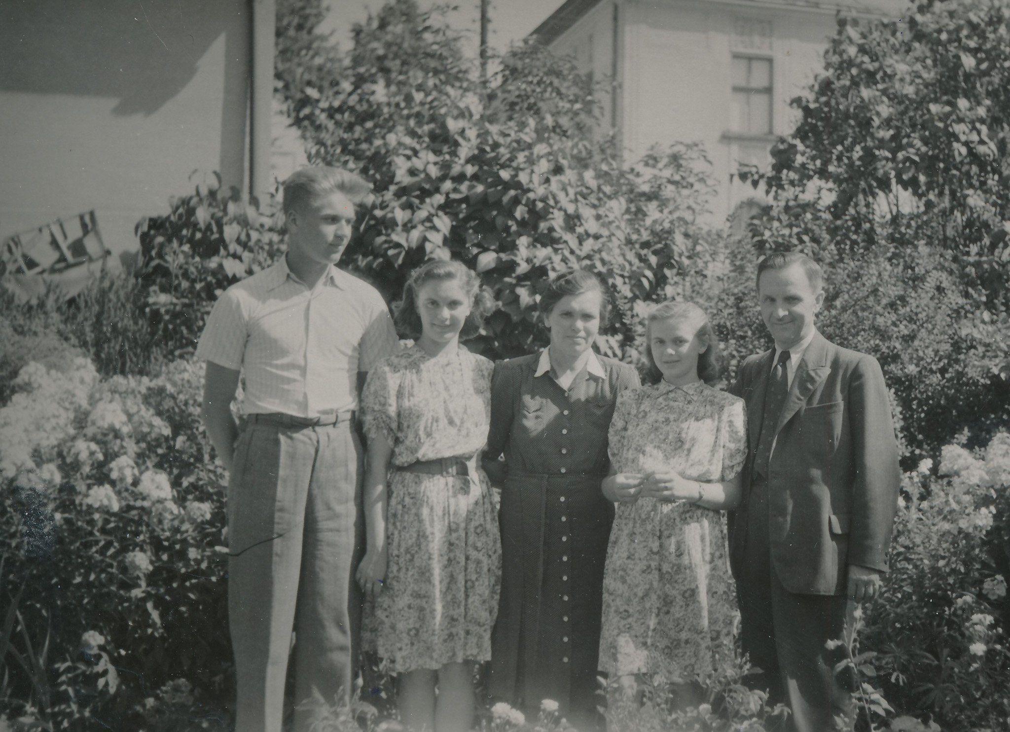 Zleva: Jarmila Šrámková, sestra Věra Svatá, synovec Zdeněk Svatý, švagr Vladimír Svatý, švagrová z Kanady Hane Sucharda, roz. Zimmer, se synem