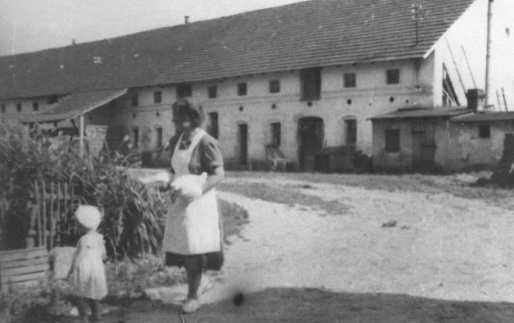 Fotografie Evy Šestákové a její maminky Květy Šestákové na statku v Zahájí, 1949/1950