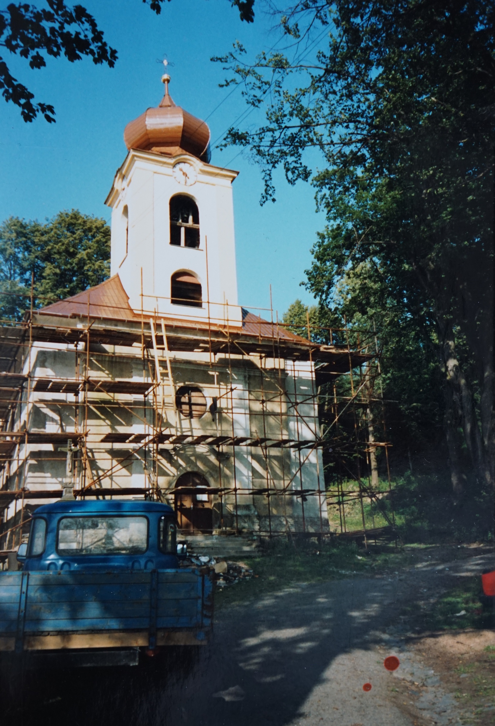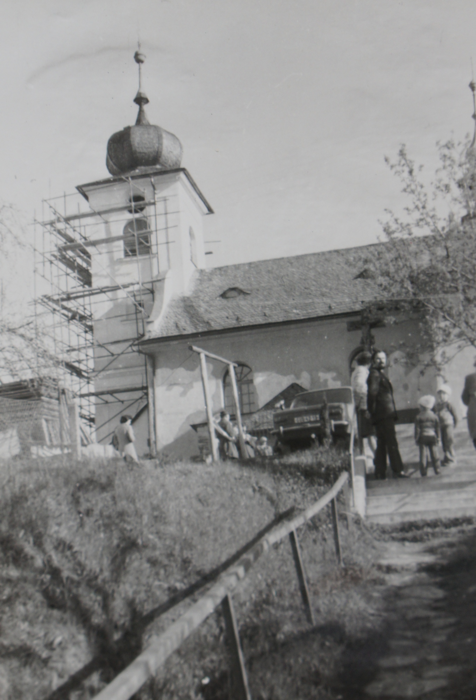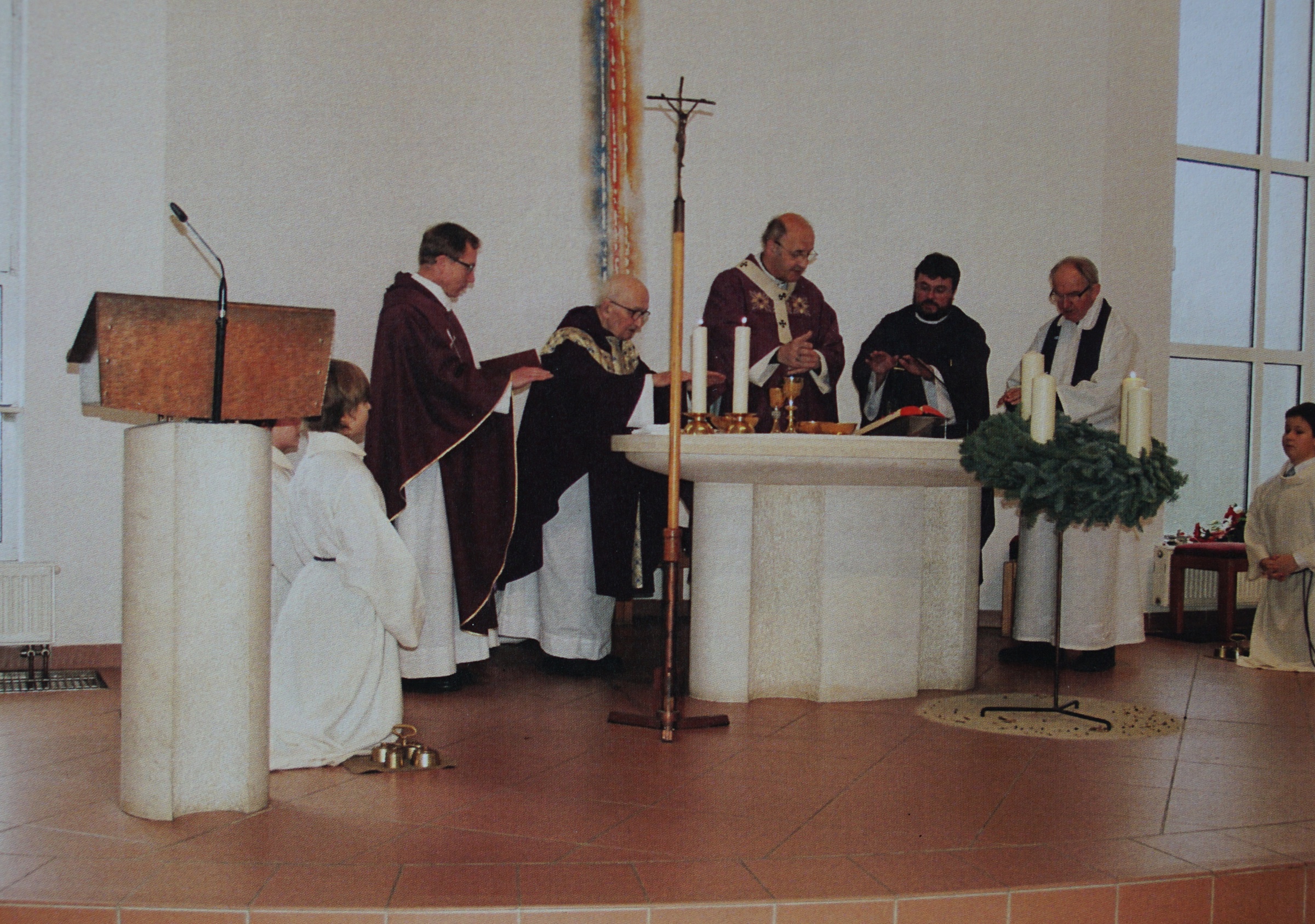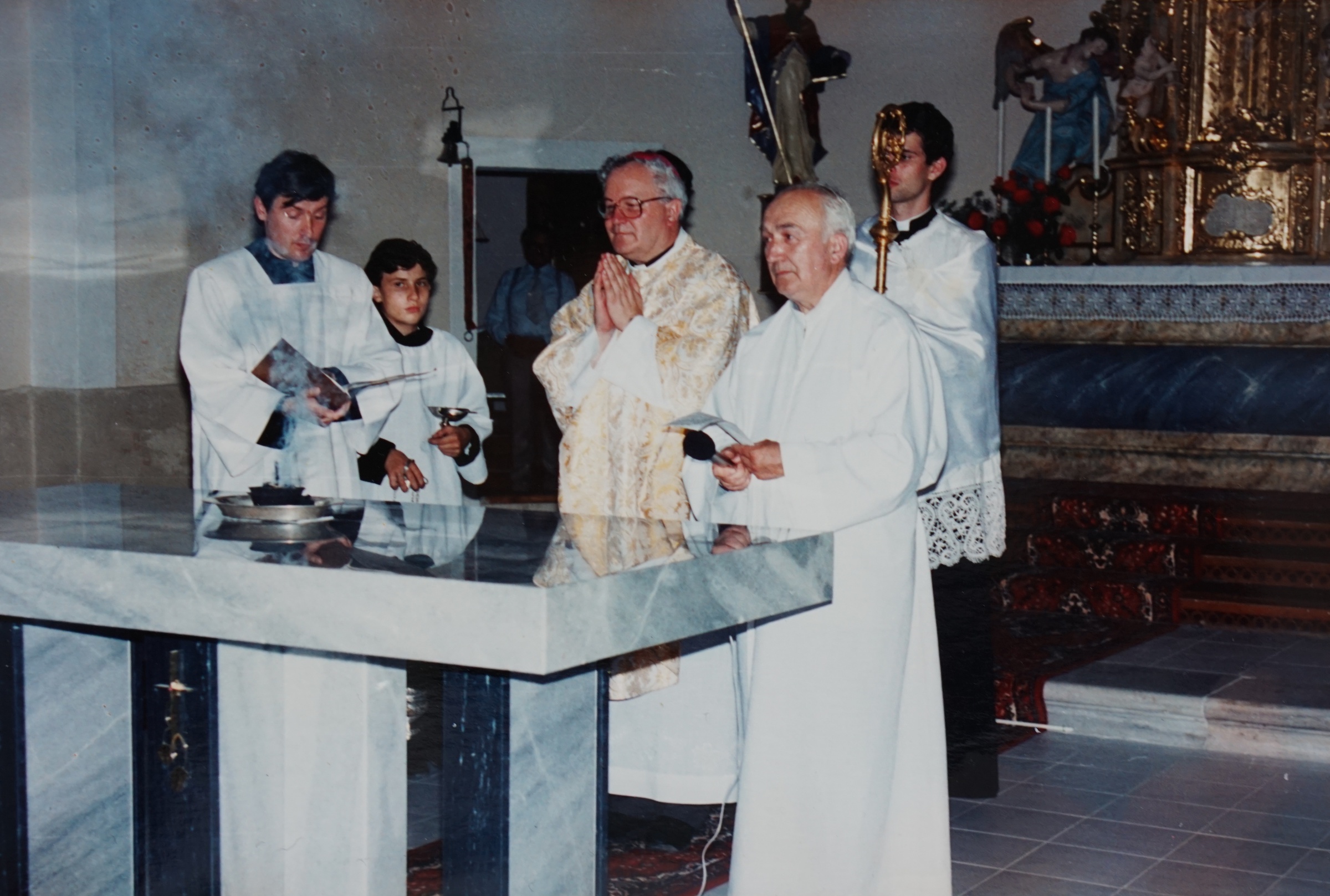 Svěcení opraveného kostela v Domašově nad Bystřicí, před oltářem biskup Josef Hrdlička a po jeho levici pamětník Antonín Pospíšil, který tento kostel opravoval a byl zde farářem v letech 1992-2005.