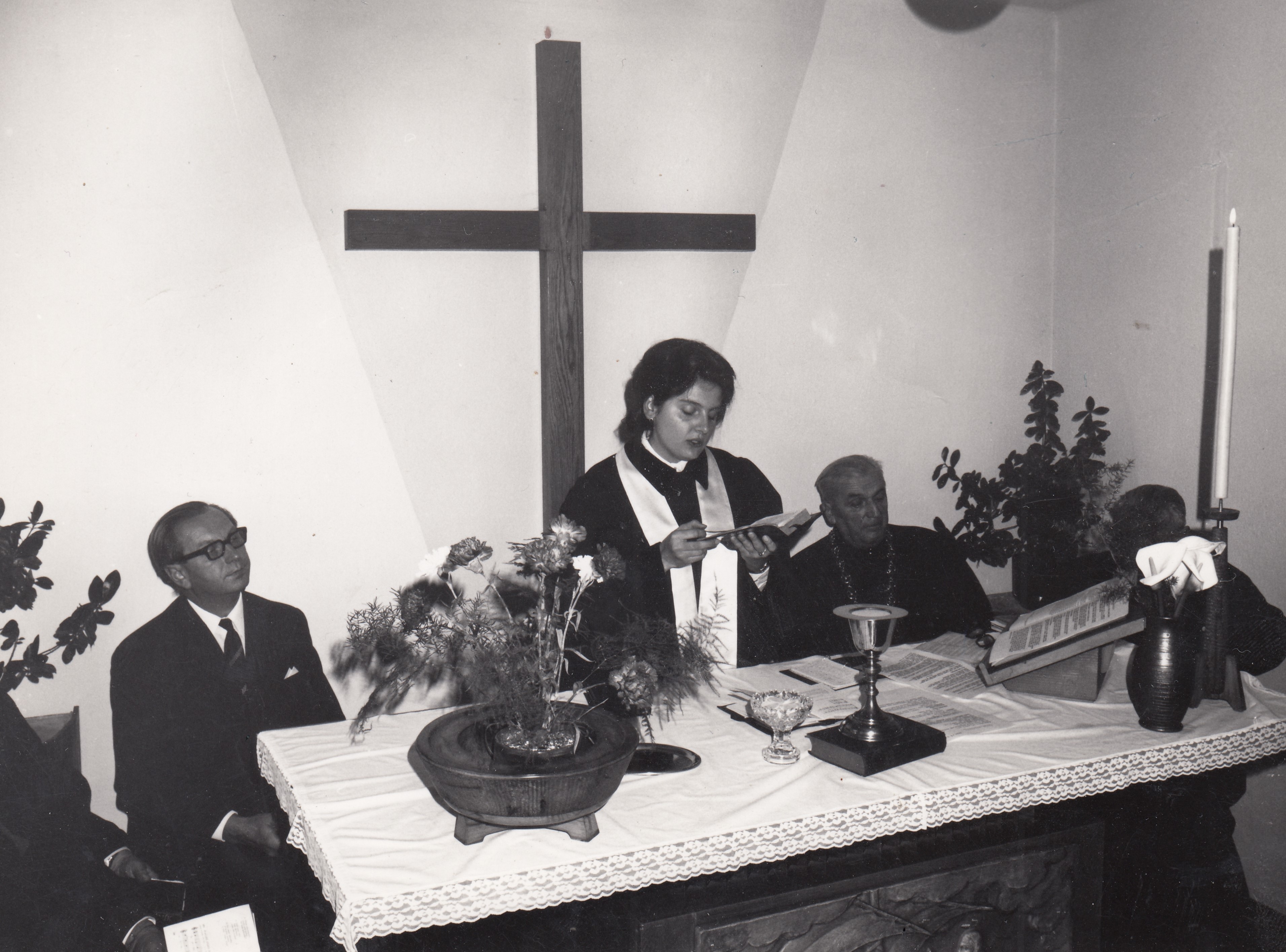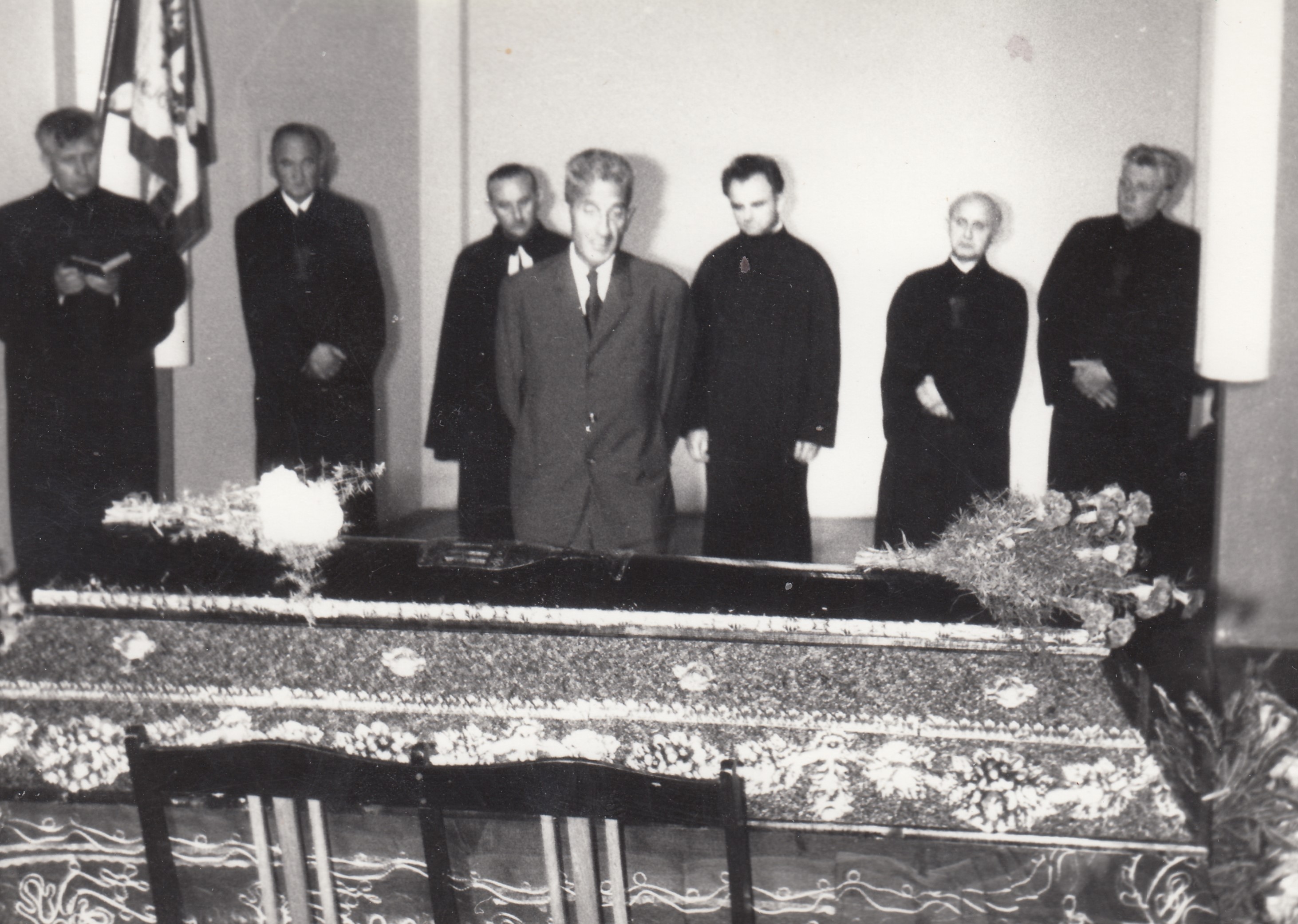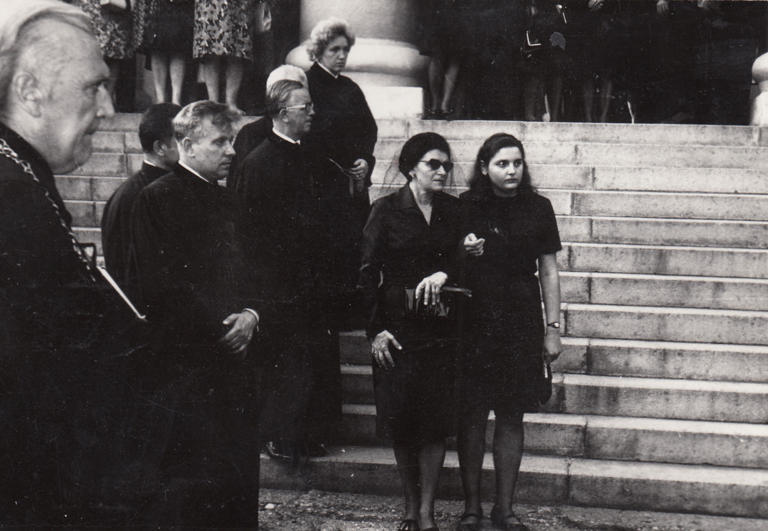 Pohřeb otce Karla Salfického, zleva biskup Josef Pochop, farář Miroslav Spáčil, ??, farářka Dagmar Spáčilová, maminka Františka, Helena Salfická, Olomouc, 1972.